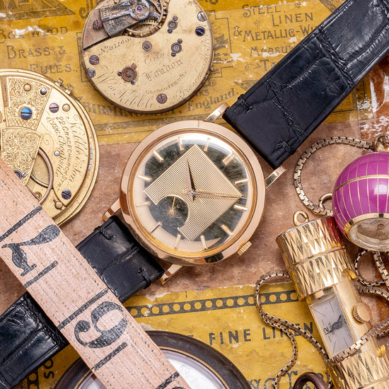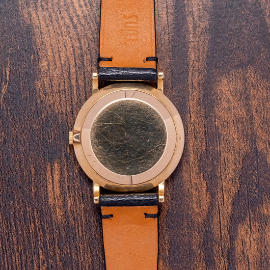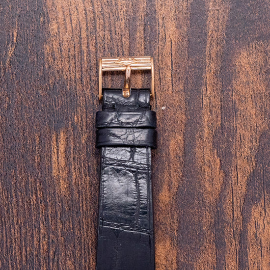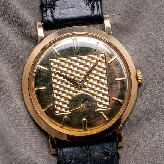 Here we have a charismatic 1954 Movado 'Gentleman' 18ct Yellow Gold 8423 sold with its rare original Box & Papers. A 34mm 18ct Yellow Gold French-made case that curves over your wrist with straight lugs. Sharp, crisp edges lead to a lug-to-lug length of 40mm, and a case thickness of just 8mm ensures a comfortable fit on the wrist. On the right side is a coin-edged crown, and a smooth bezel holds a domed acrylic crystal above a spectacular and unusual 18ct Yellow Gold dial. Applied 18ct Gold baton indexes mark the hours, and their chamfered edges play with the light as you rotate your wrist. In the centre, a square of Guilloche with the elegant 18ct Yellow Gold Dauphine hands and a small seconds crosshair sub-dial at 6 o’clock. On the reverse a snap-off case back, inside a bumper automatic Movado Cal. 115, 17 jewels, beating at a leisurely 18,000 beats per hour. The movement was in production from 1951 until 1959 and was one of the thinnest automatics. It comes paired with an 18mm leather strap and a plated Movado pin buckle and comes with its rare Movado presentation box and paperwork.