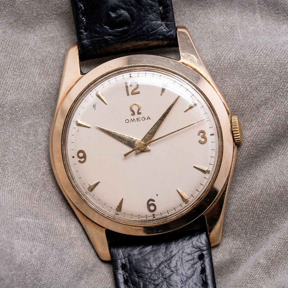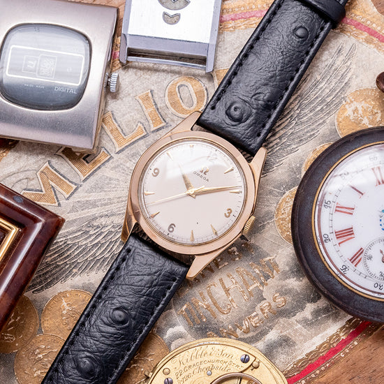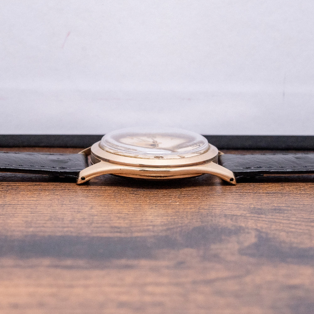 Here we have a stunning 1954 Omega 'Calatrava' Cal. 420 with a 33mm 9ct Gold case made by Dennison, A.L.Dennison moved to Birmingham around 1871, where he produced high-quality watch cases, in no time Omega took notice and decided to commission ALD, some of Omega’s finest cases are made by Dennison. Tapering drilled lugs provide a comfortable fit on the wrist, its gently curved flanks lead to a lug-to-lug length of 40mm and a case thickness of 10mm, sits perfectly under a cuff, on the right side a coin-edged signed crown, the smooth bezel holds a domed crystal that protects the off-white “Calatrava” dial, applied gold polished facet arrow-pointed indexes with Arabic numerals at 12, 3, 6 and 9 mark the hours. Elegant Dauphine hands with a centre seconds hand that sweeps around the dial, the text is kept to a minimum with the Omega motif at 12 o’clock. On the reverse, a snap-off case back. Inside a manually wound Omega Cal. 420, 17 jewels, beating at a leisurely 18,000 beats per hour. It comes paired with a well-suited 18mm leather strap.