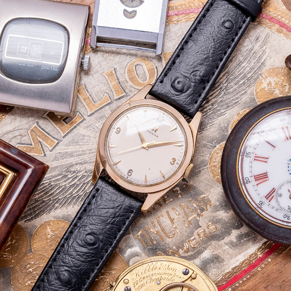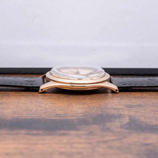 This wonderful and affordable 9ct yellow gold Omega 'Calatrava' features a case made by the famous Dennison case makers. A.L. Dennison moved to Birmingham around 1871, where he produced high-quality watch cases for all sorts of brands, and in no time, Omega took notice and decided to commission ALD. This lovely example dates to 1954 and is powered by the ever-reliable, manually wound Omega Calibre 420. If you are in the market for a gold dress watch that can also be paired with a subtle brown strap to transform it into something more casual, look no further, you have found it!