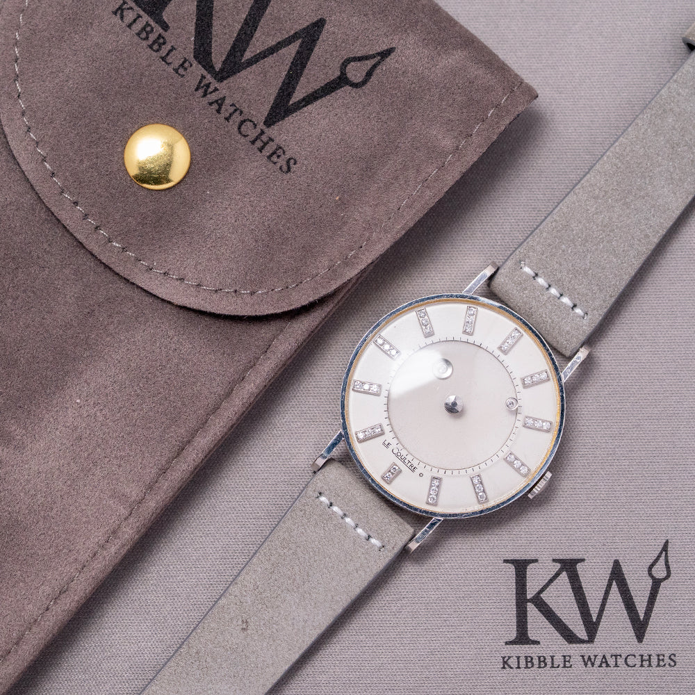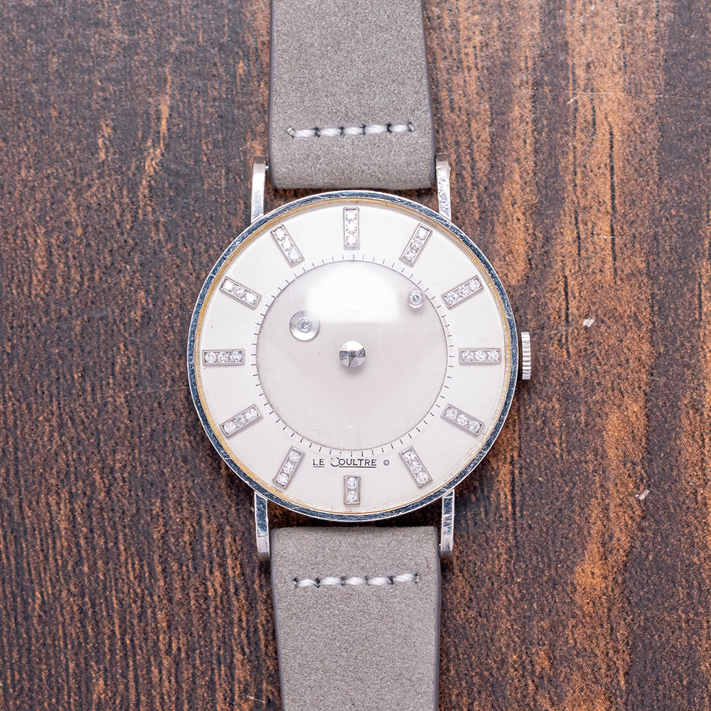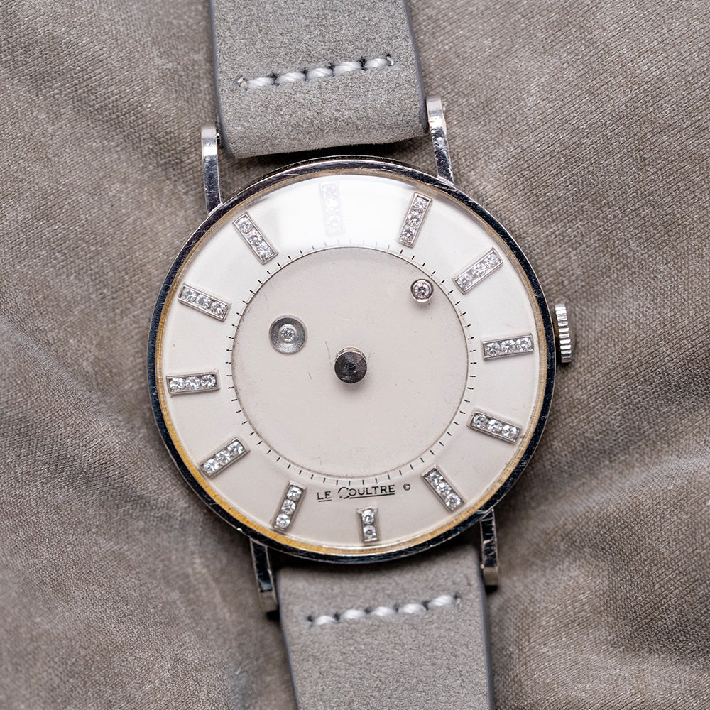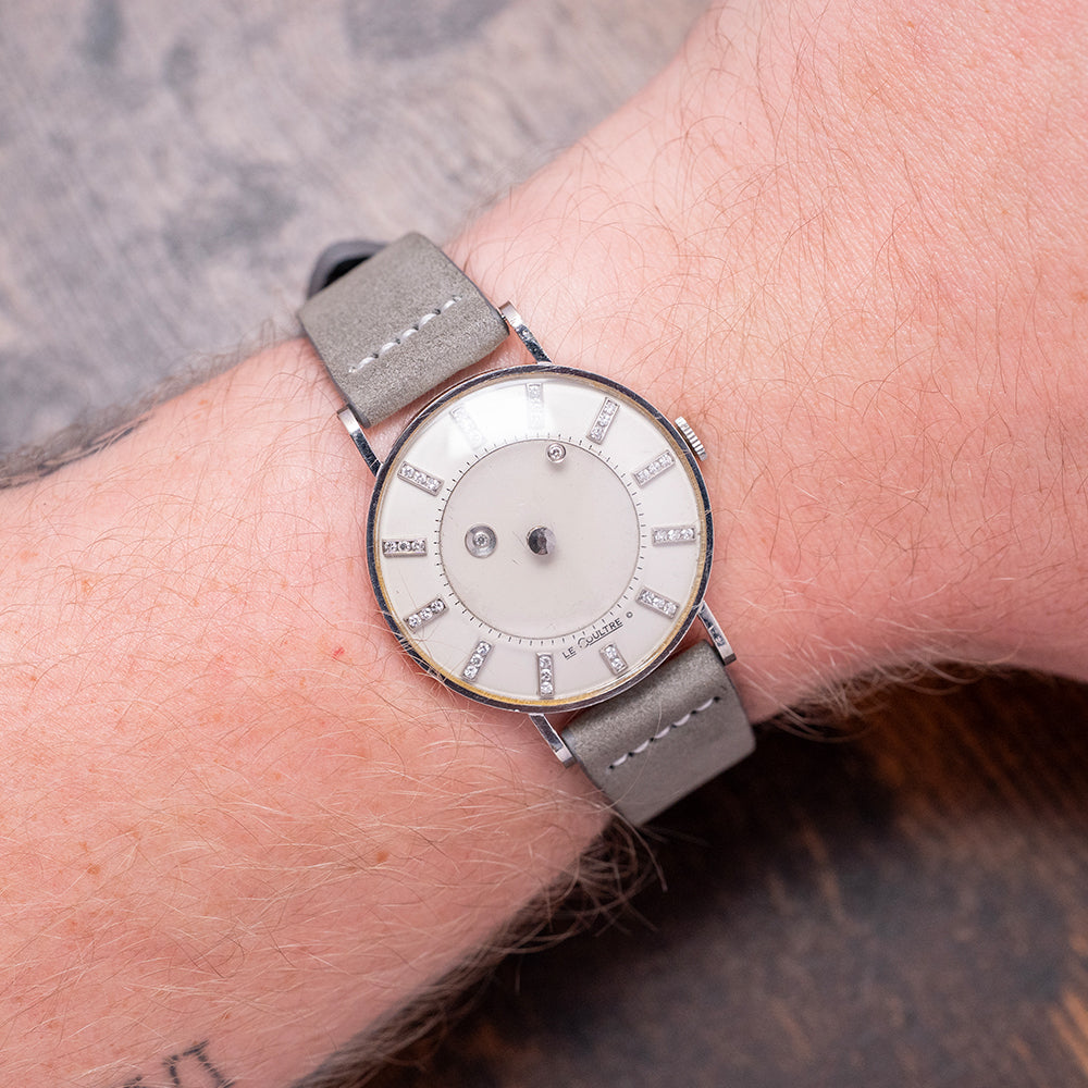 Here we have the beautiful, rare 1955 LeCoultre & Vacheron Diamond Mystery Hour, featuring a 33mm 14ct White Gold case that gently sits on your wrist with straight drilled teardrop lugs. Its slender flanks lead to a comfortable lug-to-lug length of 41mm and a case thickness of just 9mm. On the right side, a coin-edged crown. The slim bezel holds a high-domed crystal above a stunning Mystery Discs dial. Applied white gold batons are filled with 35 shimmering diamonds, marking the hours, and the inner minute track surrounds two more diamonds representing the hour and minute hands, which give the impression that they are floating around the dial. The hour is connected to an inner disc that rotates one complete revolution every 12 hours. At 6 o’clock, we have the LeCoultre motif completing this incredible Mystery Hour timepiece. On the reverse, a solid 14ct white gold snap-off case back engraved ‘Vacheron & Constantin LeCoultre Watches Inc’ and a personal engraving in the centre. Inside a manually wound LeCoultre Cal. 810/AW, 17 jewels, beating at a leisurely 18,000 beats per hour. It comes paired with its 17mm well-suited quick-release strap and pin buckle.