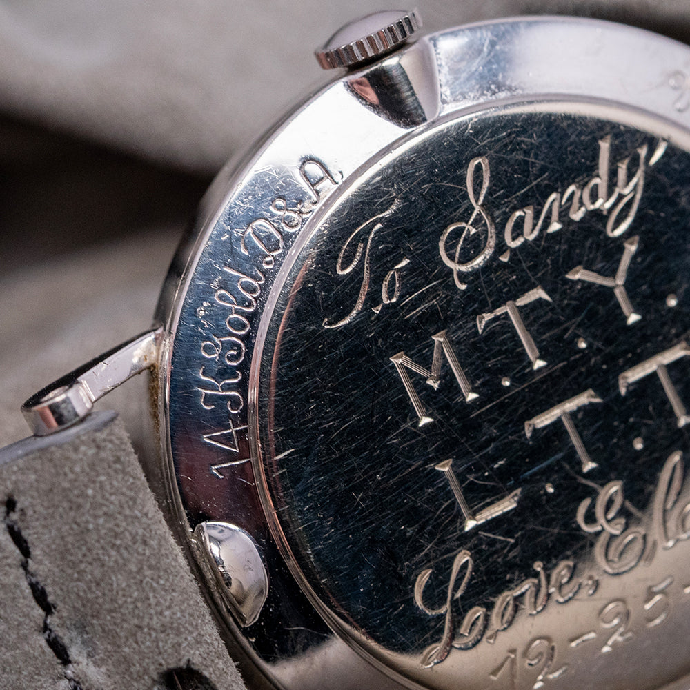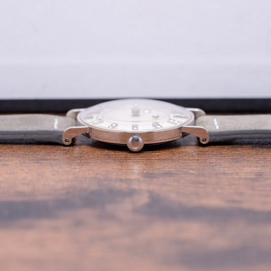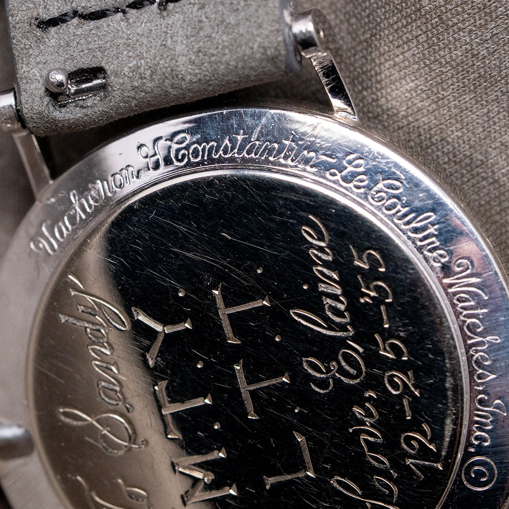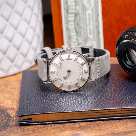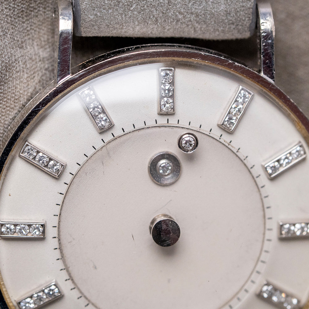 Here we have the beautiful, rare 1955 LeCoultre & Vacheron Diamond Mystery Hour, featuring a 33mm 14ct White Gold case that gently sits on your wrist with straight drilled teardrop lugs. Its slender flanks lead to a comfortable lug-to-lug length of 41mm and a case thickness of just 9mm. On the right side, a coin-edged crown. The slim bezel holds a high-domed crystal above a stunning Mystery Discs dial. Applied white gold batons are filled with 35 shimmering diamonds, marking the hours, and the inner minute track surrounds two more diamonds representing the hour and minute hands, which give the impression that they are floating around the dial. The hour is connected to an inner disc that rotates one complete revolution every 12 hours. At 6 o’clock, we have the LeCoultre motif completing this incredible Mystery Hour timepiece. On the reverse, a solid 14ct white gold snap-off case back engraved ‘Vacheron & Constantin LeCoultre Watches Inc’ and a personal engraving in the centre. Inside a manually wound LeCoultre Cal. 810/AW, 17 jewels, beating at a leisurely 18,000 beats per hour. It comes paired with its 17mm well-suited quick-release strap and pin buckle.