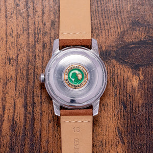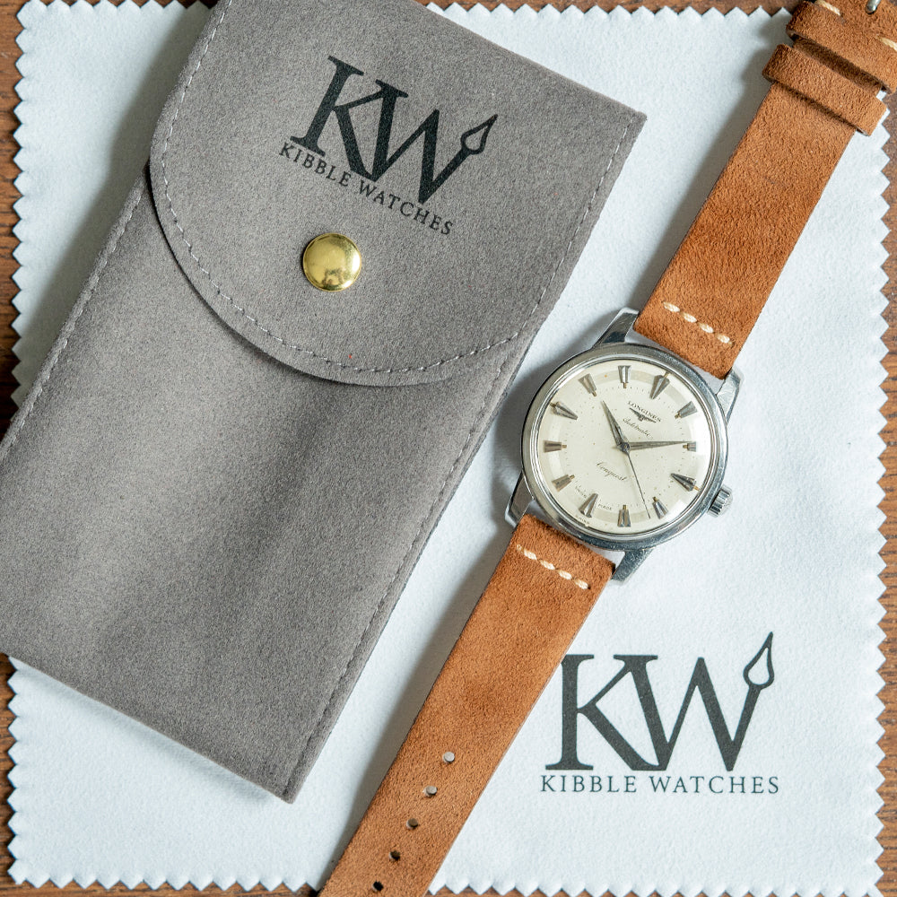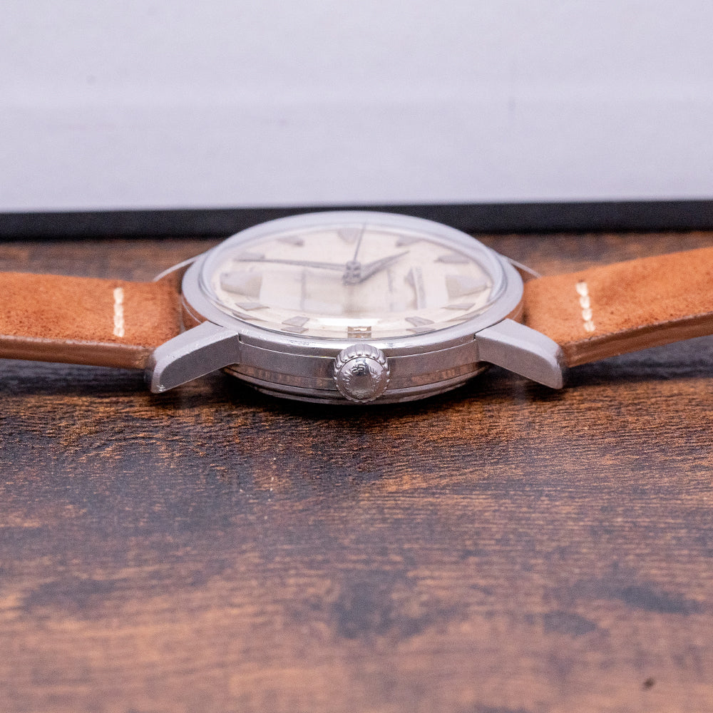 The Longines Conquest was first introduced in 1954; here we have a stunning 1955 Longines Conquest Automatic 9000/6 with a 35mm stainless steel case that curves over your wrist with thick tapered lugs and a lug-to-lug length of 43mm and a thickness of 12mm, ensuring the watch is a comfortable fit. On the right is a push/pull signed crown. The thin bezel holds a domed crystal above a striking two-tone silver patinated dial, attractive applied double-faceted indexes mark the hours, and an inner minute track has lume pips on the hour. Elegant dauphine hands are complemented by a delicate tapered second hand; at noon, we have the applied Longine motif with Automatic in an attractive font; at 6 o’clock, “Conquest.” On the reverse, a screw-down case back with the medallion embossed Conquest fish, green enamel in the centre, inside an automatic Longines Cal. 19 AS, 19 jewels, 18,000 beats per hour. The watch comes fitted on a well-suited aftermarket 18mm suede strap.