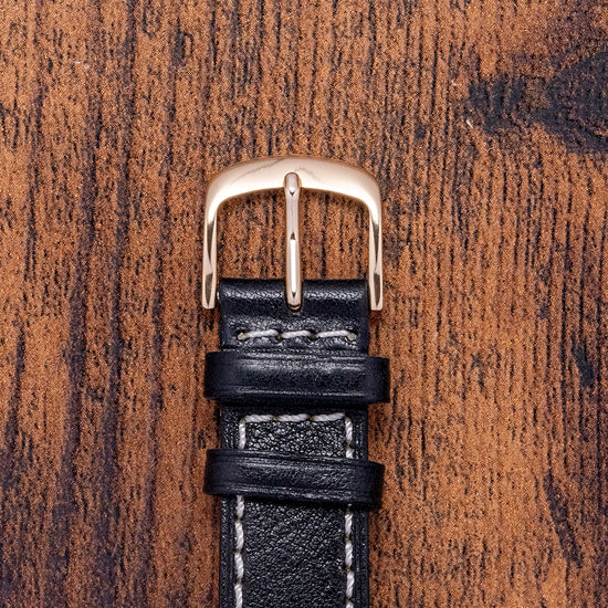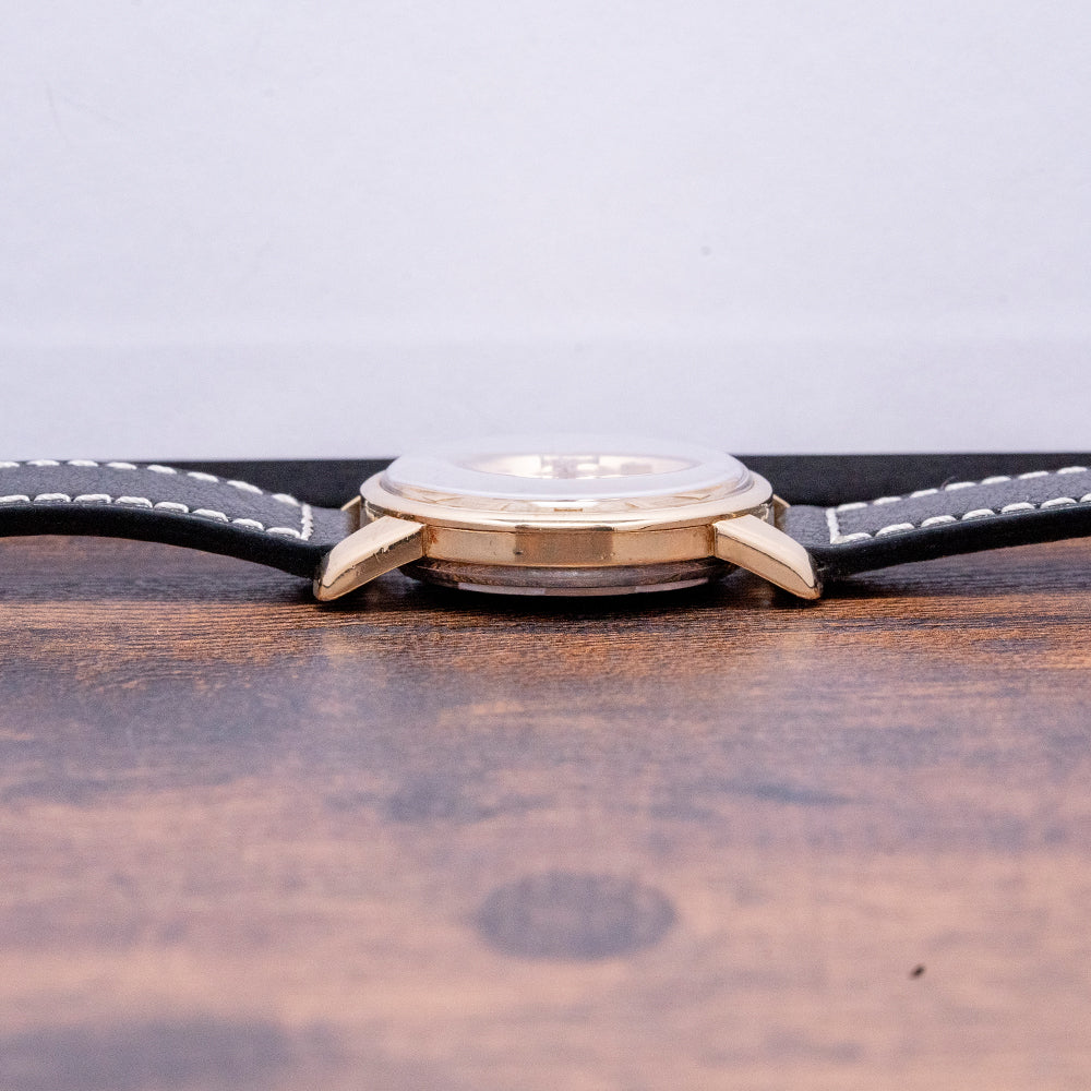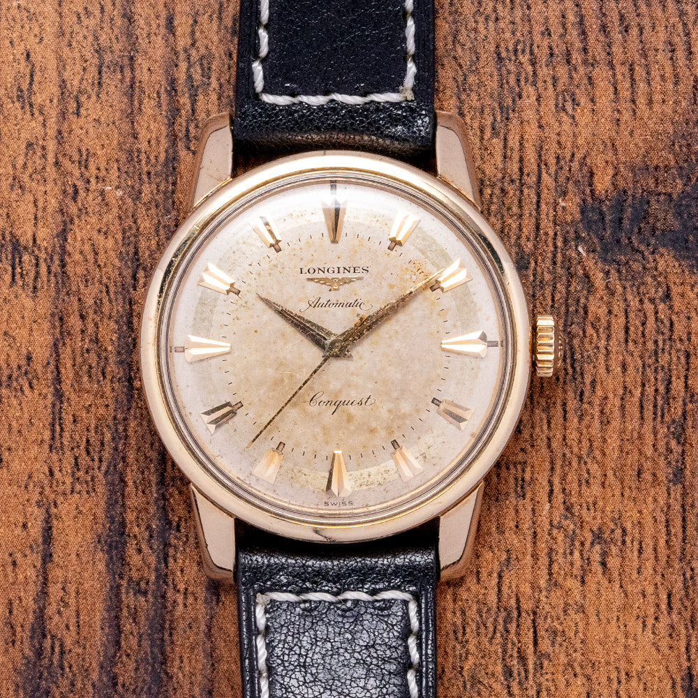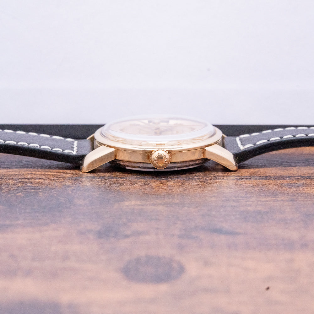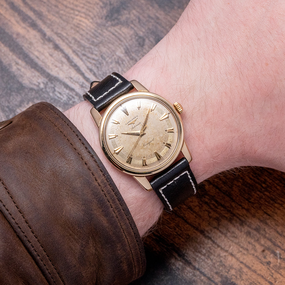 Here we have a 1955 Longines Conquest Automatic Gold Capped 9002 with a 35mm Gold-capped case, which means a thick layer of Gold has been mechanically heated and applied in layers on top of the stainless steel case. Thick tapered lugs with a lug-to-lug length of 42mm and a case thickness of 11mm ensure the watch comfortably fits your wrist. On the right side is a large signed crown. The smooth bezel holds a domed crystal above a two-tone champagne-coloured dial with an even patina, attractive applied gilt double-faceted indexes mark the hours, and an inner minute track has lume pips on the hour. Elegant gilt dauphine hands are complemented by a delicate tapered second hand; at 12 o’clock, we have the applied Longine motif with Automatic in an attractive font, and at 6 o’clock, “Conquest” completes this dynamic dress watch. On the reverse, a screw-down case back with the golden medallion embossed Conquest fish and remnants of the green enamel in the centre, inside an automatic Longines Cal. 19AS, 19 jewels, beating at a leisurely 18,000 beats per hour. The watch comes paired with an 18mm black leather strap.