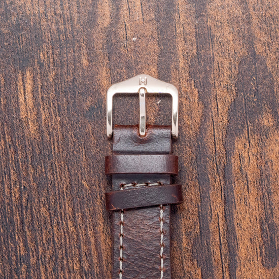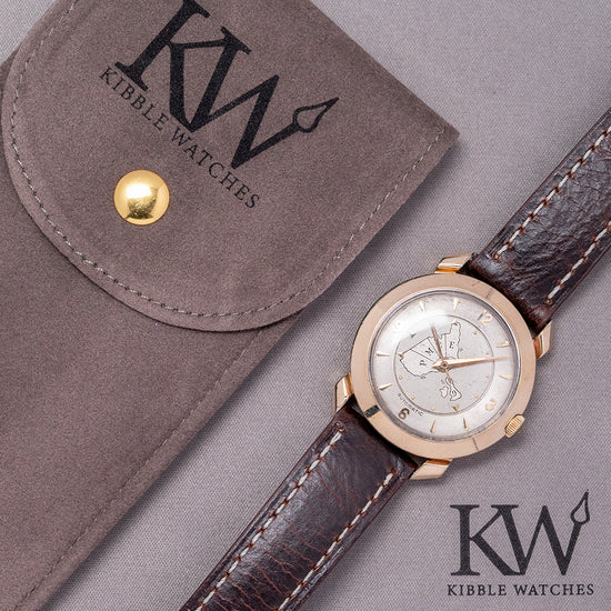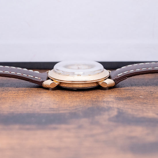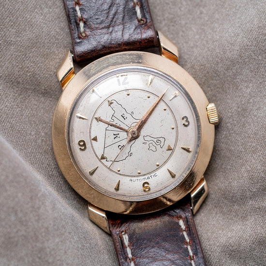 Here we have a rare 1956 Hamilton Transcontinental A Automatic 667, released by Hamilton in 1956. It was produced for two years, at a time when you could fly coast to coast in a day rather than several days by train. It showcases an innovative way for a business traveller to set a specific time zone in the USA or the UK, using GMT. Featuring a round ‘flying saucer’ shaped 32.5mm 10k yellow gold-filled case that sits comfortably on your wrist with fancy rounded lugs. Its curved flanks lead to a lug-to-lug length of 38mm and a case thickness of 12mm. On the right, a coin-edged crown sits slightly recessed in the case. A wide, smooth bezel holds a domed crystal above a dynamic dial. The outer ring features the applied gold-toned dagger and Arabic numeral indices marking the hours. An inner rotating disc shows the four USA time zones: ‘E’ marks Eastern Zone, ‘C’ marks Central Zone, ‘M’ marks Mountain Zone, ‘P’ marks Pacific Zone and ‘G’ marks Greenwich Mean Time Zone, each with pips and an arrow indicating the hour. A gold-toned Dauphine minute hand and gold-toned flat hour hand connected to the rotating disc are complemented by a tapered sweeping second hand. At noon, we have the Hamilton motif, and at 6 o’clock, ‘Automatic’ completes this Transcontinental traveller's timepiece. On the reverse, a screw-down stainless steel case back, inside an automatic Hamilton Cal. 667, 17 jewels movement. It comes paired with a well-suited 17mm leather strap and pin buckle.