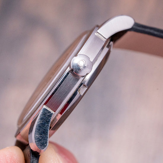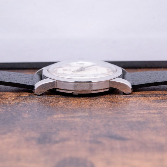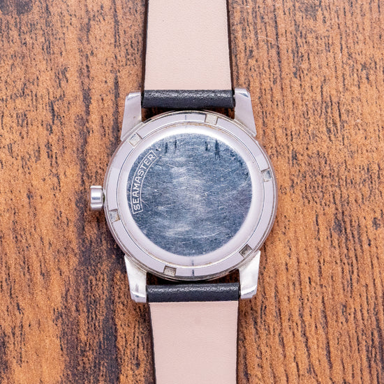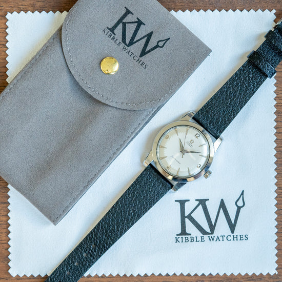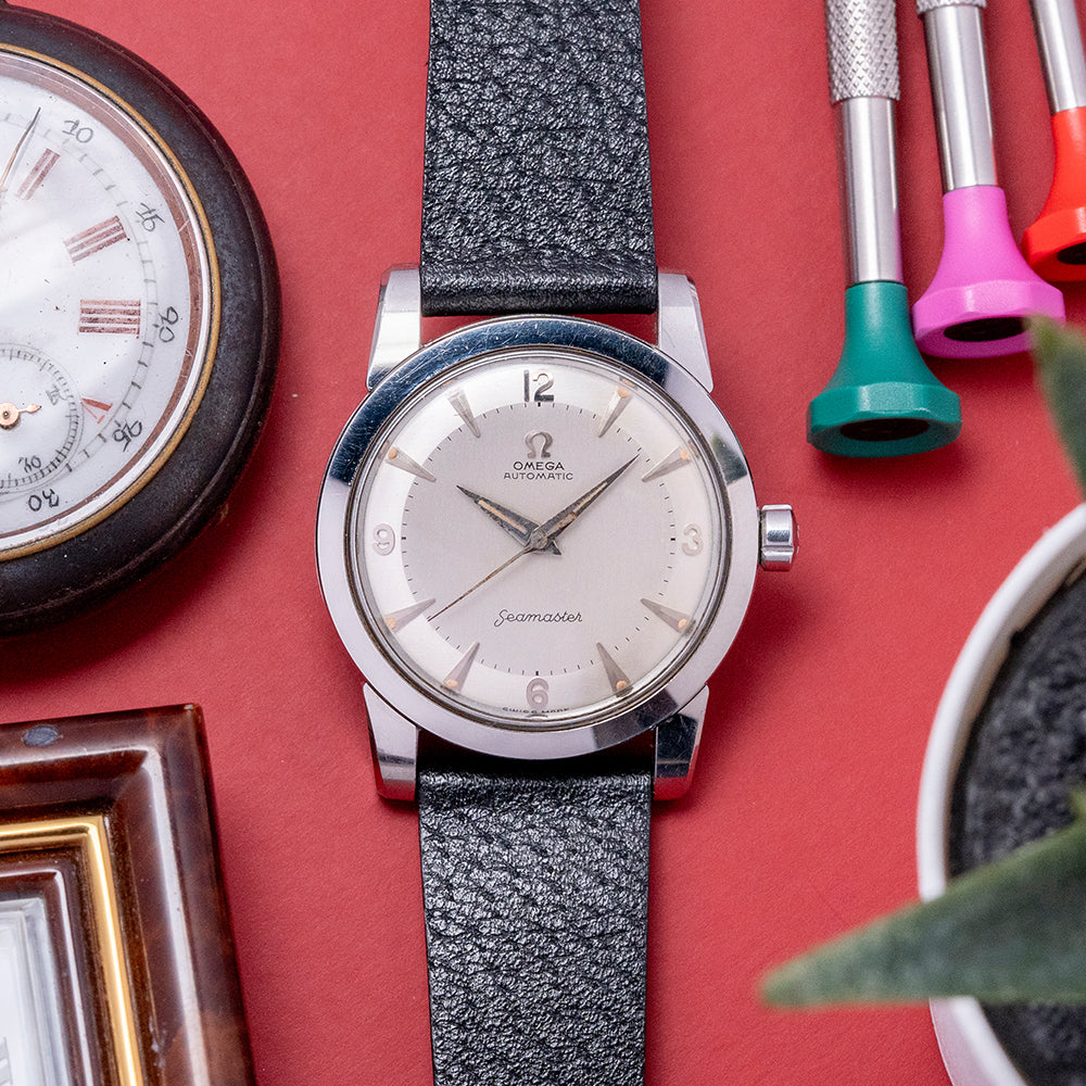 Here is a stunning early example of the 1956 Omega Seamaster Bumper Automatic 2577-6 SC with a 34mm stainless steel round case that curves over your wrist thanks to the tapering thick lugs for that comfortable fit. Polished surfaces throughout lead to a lug-to-lug length of 41.5mm and a case thickness of 9.5mm with a stepped polished bezel. Domed crystal protects the star of the show, a silver two-tone sector dial, applied polished arrowhead indexes with Arabic numerals at 12, 3, 6 and 9. Play with the light as you rotate your wrist. Elegant steel Dauphine hands complete with a centre seconds hand that sweeps around this rare dial. Text is kept to a minimum with “Omega Automatic” at 12 o’clock and “Seamaster” at 6 o’clock. On the reverse, a screw-down case back, inside a high-grade Bumper Automatic Omega Cal. 354, 17 jewels movement. It comes paired with a well-fitted 18mm black leather strap and pin buckle.
