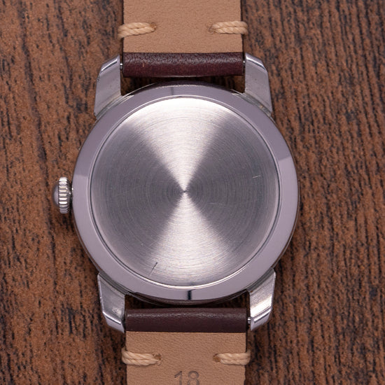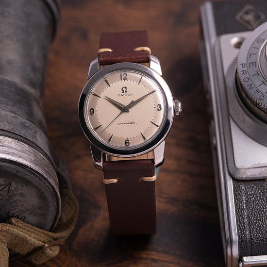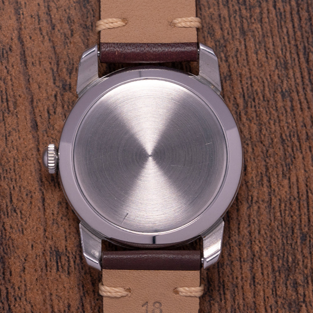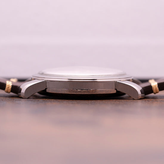 Here we have a stunning 1956 Omega Seamaster Manual Cal. 420 Dennison 803 with a 34mm stainless steel case made by Dennison, A.L.Dennison moved to Birmingham around 1871, where he produced high-quality watch cases, in no time Omega took notice and decided to commission ALD, some of Omega’s finest cases are made by Dennison. Tapering fat lugs provide a comfortable fit on the wrist, and polished and brushed surfaces transition with crisp lines throughout with a stepped polished bezel. A domed Omega signed crystal protects the magnificent champagne sector-style dial, applied polished arrow-pointed indexes with Arabic numerals at 12, 3, 6 and 9 mark the hours. Elegant Dauphine hands with a centre seconds hand that sweeps around the dial, the text is kept to a minimum with the Omega motif at 12 o’clock and Seamaster at 6 o’clock. On the back, we have an engine-turned case back, and inside the case back, we have a stamped “PAT Applied For” (could be referring to their O’Ring gasket Technology), “DeniSteel” stainless steel, DeniSteel was a trading name registered in 1934 by the English case maker Dennison; its own type of Staybrite, Staybrite Steel had been introduced to the Swiss watch industry in the 1920s by Firth Steel Sales AG, founded in 1919 in Switzerland as a subsidiary of Firth Brown, we most commonly find the DeniSteel stamp inside case backs from the 1940s to the 1960s on UK market models by Omega, Rolex, and IWC. While an excellent case manufacturer, Dennison most likely didn’t blend its steel, and it most likely would have been supplied by Brown Firth or one of its competitors. Inside a Manually Wound Omega Cal. 420, 17 jewels, beating at 18,000 beats per hour. The watch comes fitted on a well-suited 18mm brown vintage-style strap.