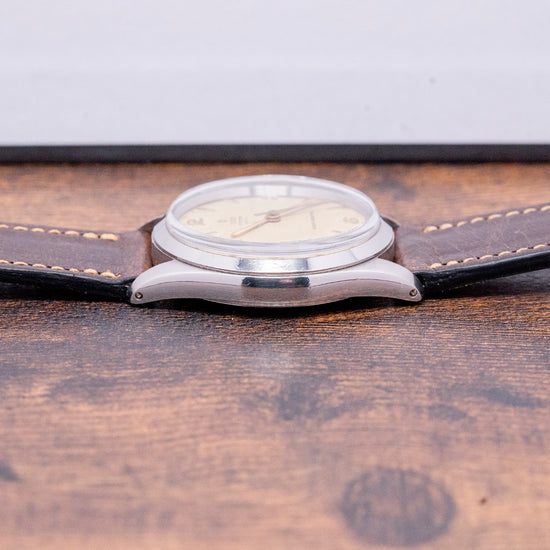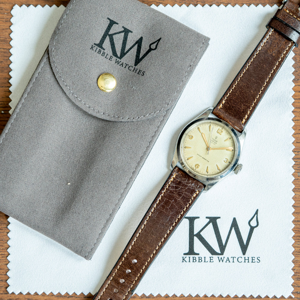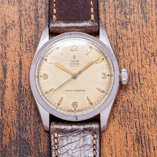 Here we have a 1956 Tudor Oyster Royal Honeycomb Dial 7934 that has a 34mm round Rolex Oyster stainless steel case with tapered drilled lugs, and a lug-to-lug length of 40mm and a case thickness of 9.5mm ensure a comfortable fit on your wrist. On the right side, the original Rolex signed screwed-down crown. The slim bezel holds a domed crystal above an attractive honeycomb “Explorer” dial, and an outer minute track with applied gold-toned dart hour markers and gold-toned Arabic numerals at 12, 3, 6, and 9. Gold-toned lance hands filled with lume and a fine tapered sweeping centre seconds hand complete this vintage dial. Text on the dial is precisely printed: “Tudor Oyster Royal” and “Shock Resisting”. On the reverse, a screw-down coin-edge case back, inside a manually wound Tudor Cal. 1156, 17 jewels, 18,000 beats per hour. The watch is paired with a well-suited 19mm aftermarket leather strap and pin buckle.