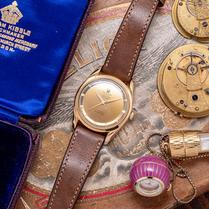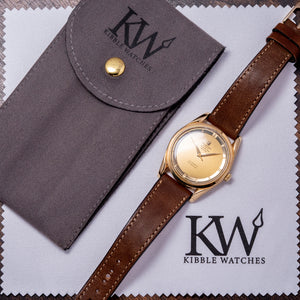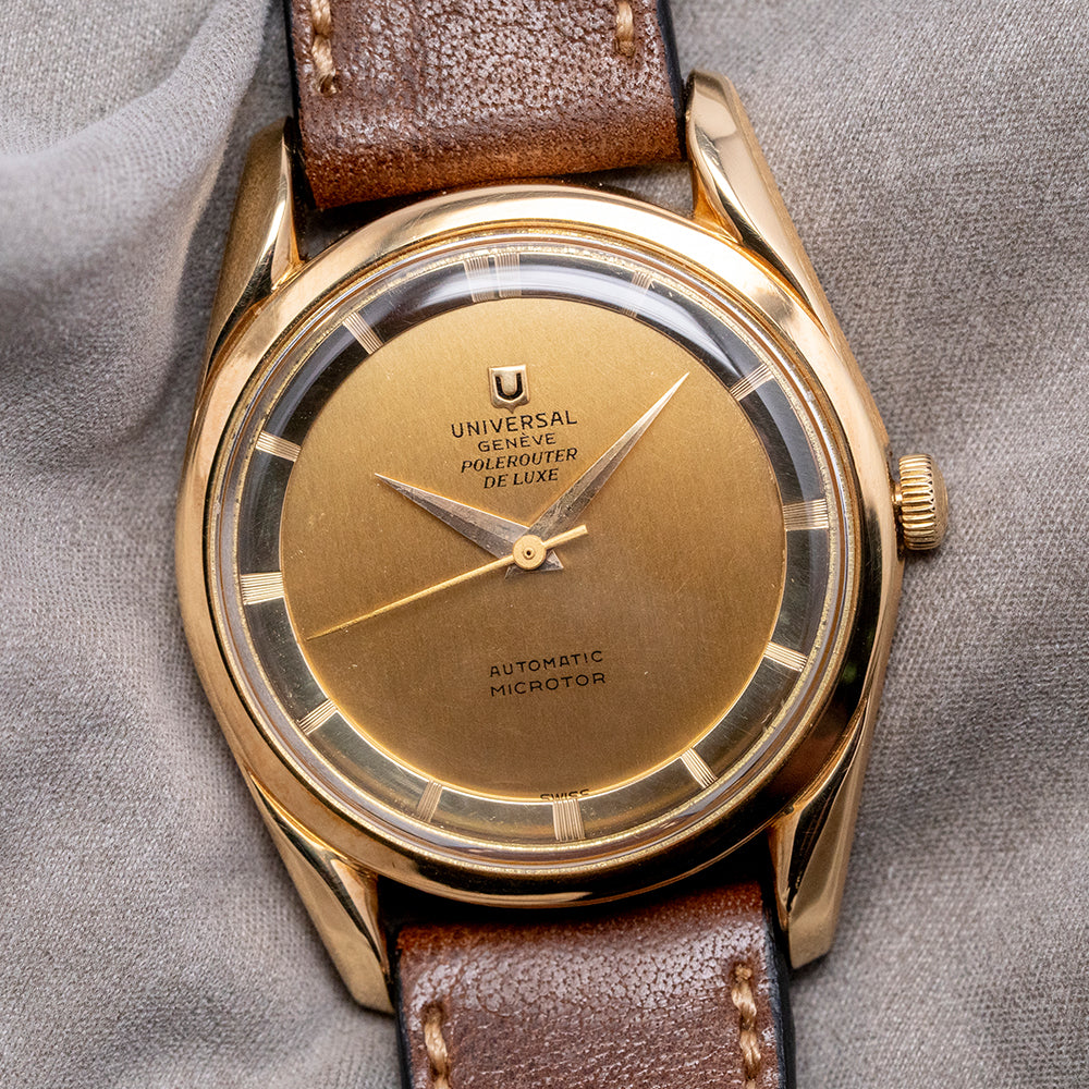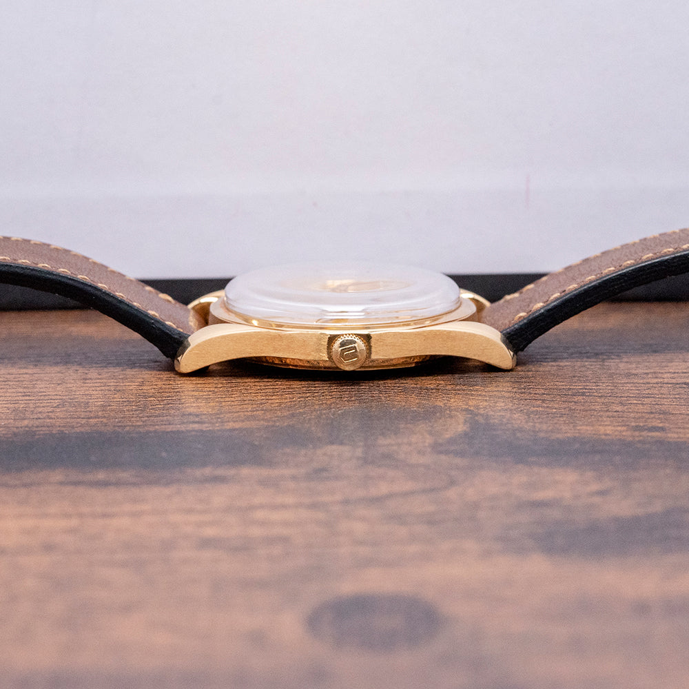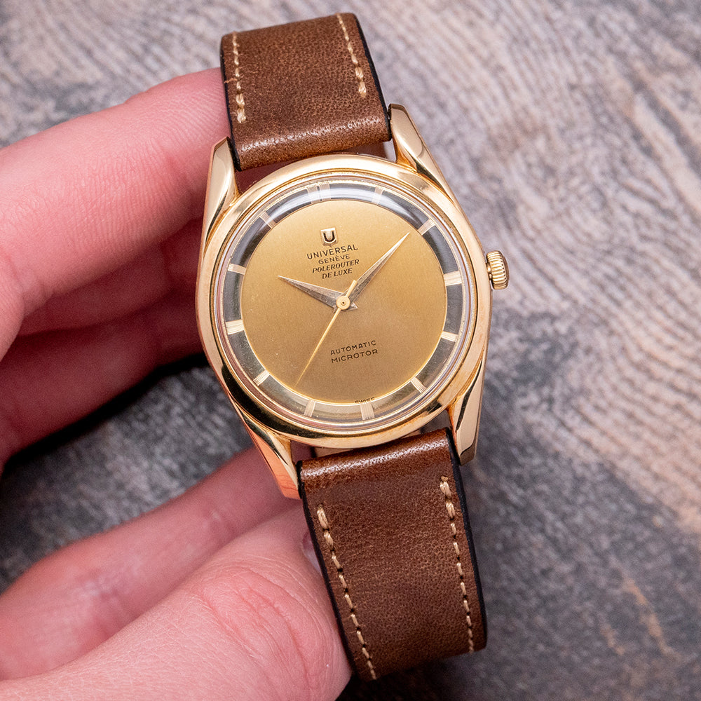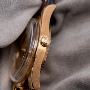 Here we have a classic 1956 Universal Geneve Polerouter Deluxe 18ct Gold 10357-1 with a stunning 34mm 18ct Yellow Gold round case. The Polerouter was first introduced in 1954 and was worn by commercial flight captains for the Scandinavian Airlines System (SAS). Their flights took them from Europe to America via Greenland, over the polar region, hence the “Polerouter” name. The Polerouter was designed by Gérald Genta at the age of 24. Tapered hallmarked twisted lugs gently curve over your wrist with a lug-to-lug length of 42mm and a case thickness of just 9mm to ensure a comfortable fit on your wrist. On the right side is an 18ct Yellow gold Universal signed crown. A thin, smooth bezel holds a domed crystal above a striking gold dial, and a raised, polished chapter ring has attractive engraved markers for the hours. Elegant dauphine hands are complemented by a tapered sweeping second hand. At 12 o’clock, we have the applied Universal Geneve motif and “Universal Geneve Polerouter De Luxe” printed underneath and at 6 o’clock “, Automatic Microtor” completes this incredible, sophisticated dress watch. On the reverse, a screw-down brushed solid 18ct Yellow Gold case back, inside a Micro-Rotor Universal Geneve Cal. 215, 28 jewels, beating at a leisurely 18,000 beats per hour and comes paired with a well-suited aftermarket 18mm brown leather strap.