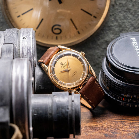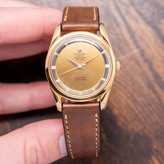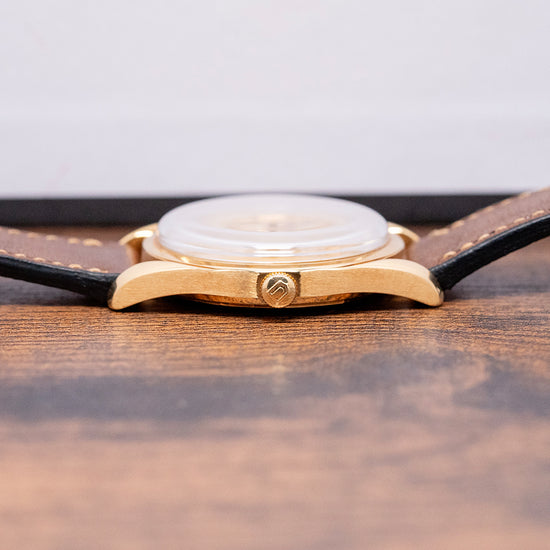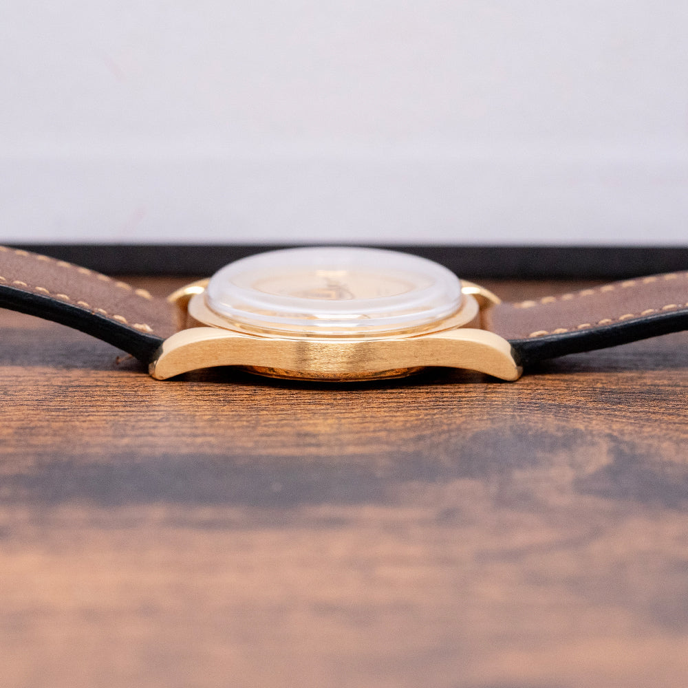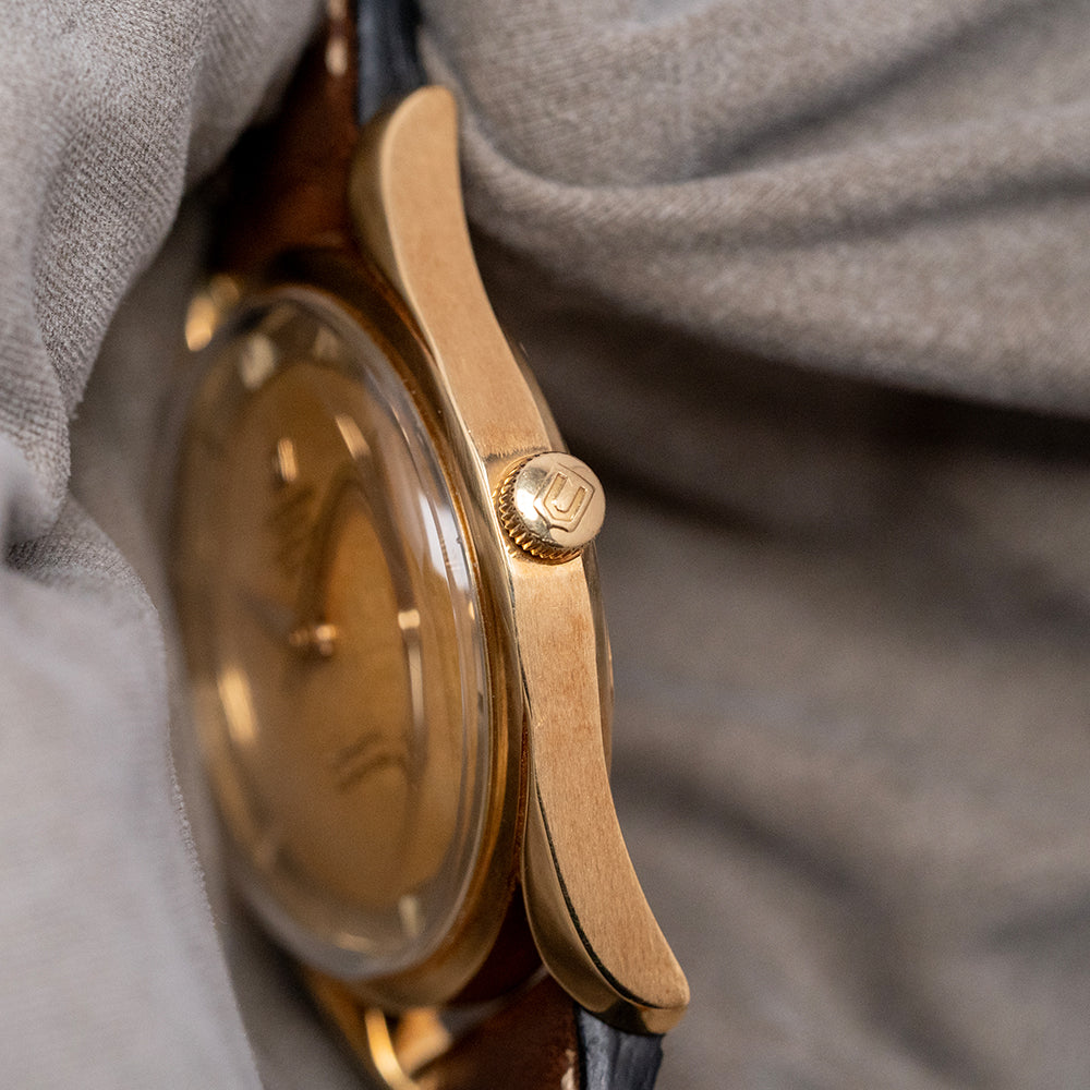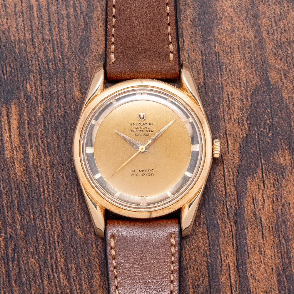 Here we have a classic 1956 Universal Geneve Polerouter Deluxe 18ct Gold 10357-1 with a stunning 34mm 18ct Yellow Gold round case. The Polerouter was first introduced in 1954 and was worn by commercial flight captains for the Scandinavian Airlines System (SAS). Their flights took them from Europe to America via Greenland, over the polar region, hence the “Polerouter” name. The Polerouter was designed by Gérald Genta at the age of 24. Tapered hallmarked twisted lugs gently curve over your wrist with a lug-to-lug length of 42mm and a case thickness of just 9mm to ensure a comfortable fit on your wrist. On the right side is an 18ct Yellow gold Universal signed crown. A thin, smooth bezel holds a domed crystal above a striking gold dial, and a raised, polished chapter ring has attractive engraved markers for the hours. Elegant dauphine hands are complemented by a tapered sweeping second hand. At 12 o’clock, we have the applied Universal Geneve motif and “Universal Geneve Polerouter De Luxe” printed underneath and at 6 o’clock “, automatic Microtor” completes this incredible, sophisticated dress watch. On the reverse, a screw-down brushed solid 18ct Yellow Gold case back, inside a Micro-Rotor Universal Geneve Cal. 215, 28 jewels, beating at a leisurely 18,000 beats per hour and comes paired with a well-suited aftermarket 18mm brown leather strap.