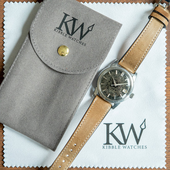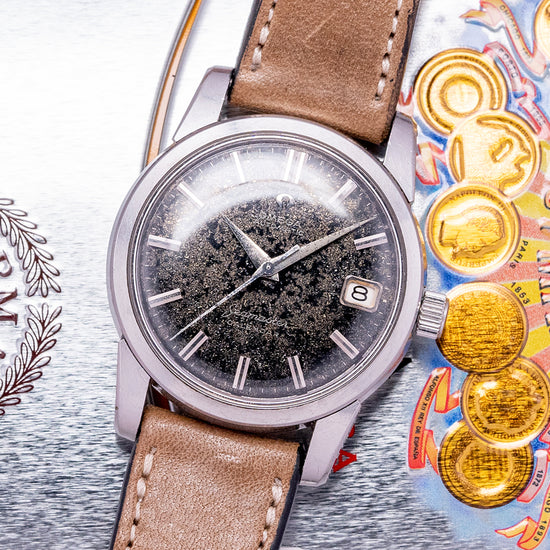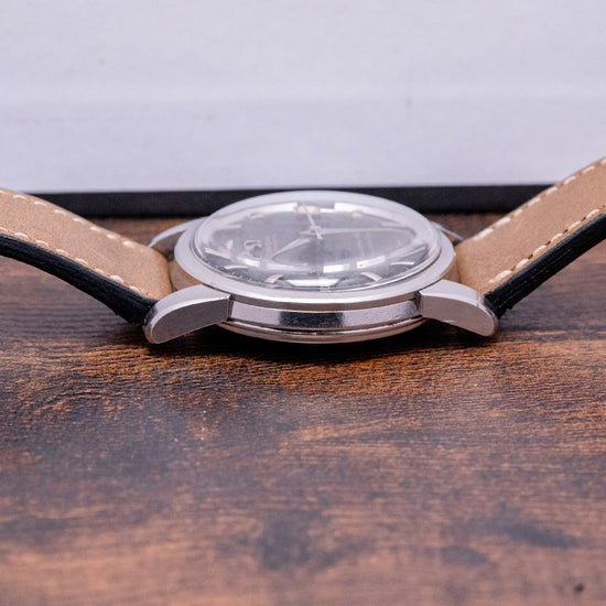 Here we have a 1958 Omega Seamaster Automatic "Star Dial" 2849 with a 34mm stainless steel case that curves over your wrist with thick lugs, a lug-to-lug length of 41.5mm and a case thickness of 12mm to ensure a comfortable fit on the wrist. On the right side is a signed crown. The smooth bezel holds a domed crystal protecting a black dial with an even patina pattern, resembling a starry night sky; hence the name “Star dial”, and an outer minute track surrounds applied steel facet baton indexes marking the hours and, at 3 o’clock, a framed date window. Elegant steel Dauphine hands are complemented by a tapered centre seconds hand. Text is kept to a minimum with an applied Omega motif “Omega Automatic” at noon and “Seamaster Calendar” at 6 o’clock. On the reverse, we have a case back with an engraving and an embossed Hippocampus “Seamaster” in the centre, representing Neptune, the God of the sea; Pierre Borie conceived it after seeing a picture of Neptune riding a chariot pulled by seahorses; it is the reason why the seahorses are wearing a bridle, there is also an engraving on the case back. Inside is an automatic Omega Cal. 503, 20 jewels, beating at 19,800 beats per hour. The watch comes paired with an 18mm leather strap and pin buckle.
