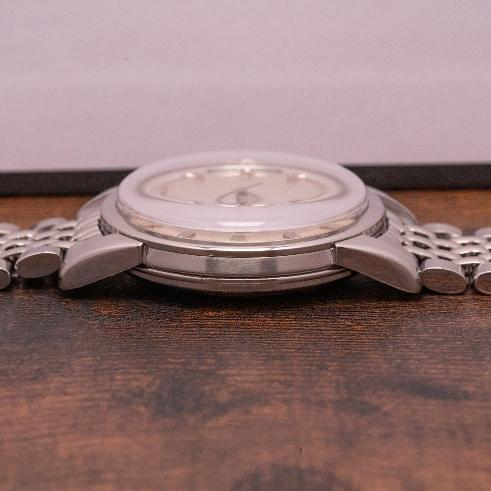The Seamaster was first introduced in 1948 to celebrate Omega’s 100th anniversary, it was an immediate success and is Omega’s longest-running model. Based on the waterproof designs used during World War 2, it was improved upon with the addition of an “O” ring gasket which improved its water resistance. Omega’s first diving record came in 1955 when diver Gordon McLean reached a depth of 62.5 metres (205 ft) in Australia; the engineers were so confident of the durability that they strapped one to the outside of an aircraft that flew over the North Pole in 1956. Here we have a 1958 Omega Seamaster automatic 2846 with a stainless steel 34mm case that curves over your wrist with thick tapered lugs, a lug-to-lug length of 42mm and a case thickness of 11.5mm ensuring a comfortable fit on the wrist. A polished smooth bezel holds a domed acrylic crystal above a beautifully refinished dial, the two-tone silver and white dial has applied faceted indexes marking the hours, and elegant Dauphine hands are infilled with luminance complemented with a tapered sweeping centre seconds hand. At 12 o’clock we have an applied Omega “Automatic” and at 6 o’clock “Seamaster” in a characteristic script. On the reverse, a case back with the embossed Hippocampus in the centre, a seahorse that represents Neptune the God of the sea, it was conceived by Pierre Borie after seeing a picture of Neptune riding a chariot pulled by seahorses, it is the reason why the seahorses are wearing a bridle. Inside we have the automatic Omega Cal. 501, beating at 19,800 beats per hour. The watch comes fitted with an original 18mm Omega bead of rice stainless steel bracelet with a signed folding clasp.