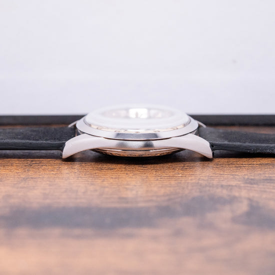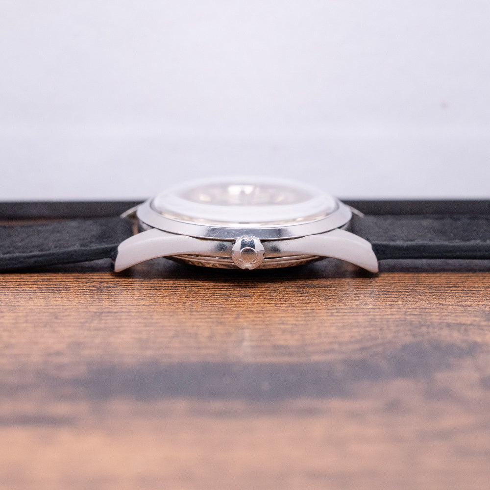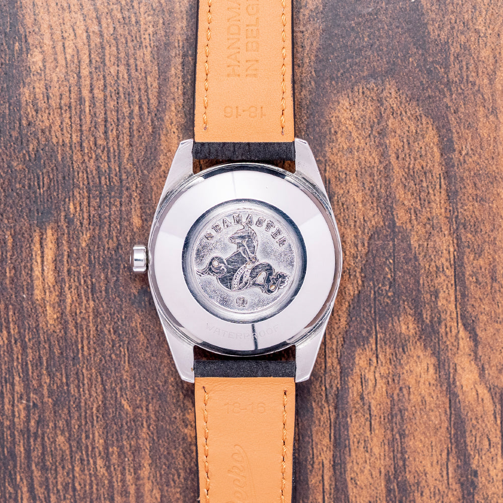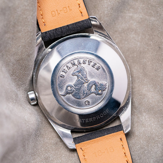 Here we have a retailer co-branded 1958 Omega Seamaster 'Turler' Automatic 2975-3. Turler is a retail company founded by the brothers César Alexander and Jean Henri Türler in 1883 in Bielle, Switzerland. In 1907, they opened their first store. Over the years, they established relationships with many renowned brands, including IWC, Jaeger-LeCoultre, Universal Geneve, Blancpain, and Omega. The company continues to operate today, with locations in Zurich. Featuring a 35mm stainless steel case that curves over your wrist with thick tapered lugs. Its curved flanks give it a lug-to-lug length of 43mm and a case thickness of 12mm, ensuring a comfortable fit on the wrist. On the right side is a signed crown. The smooth bezel holds a domed crystal protecting an even patina cream dial, and an outer minute track surrounds applied facet-edged baton indexes marking the hours. Elegant steel Dauphine hands are complemented by a tapered centre seconds hand. Text is kept to a minimum with an applied Omega motif ‘Omega Automatic TURLER’ at 12 o’clock and “Seamaster” at 6 o’clock. On the reverse, we have a case back with an embossed Hippocampus “Seamaster” in the centre, representing Neptune, the God of the sea. Pierre Borie conceived it after seeing a picture of Neptune riding a chariot pulled by seahorses; this is why the seahorses are wearing a bridle. Inside an automatic Omega Cal. 501, 19 jewels, beating at 19,800 beats per hour. The watch comes paired with an 18mm suede strap and a pin buckle.
