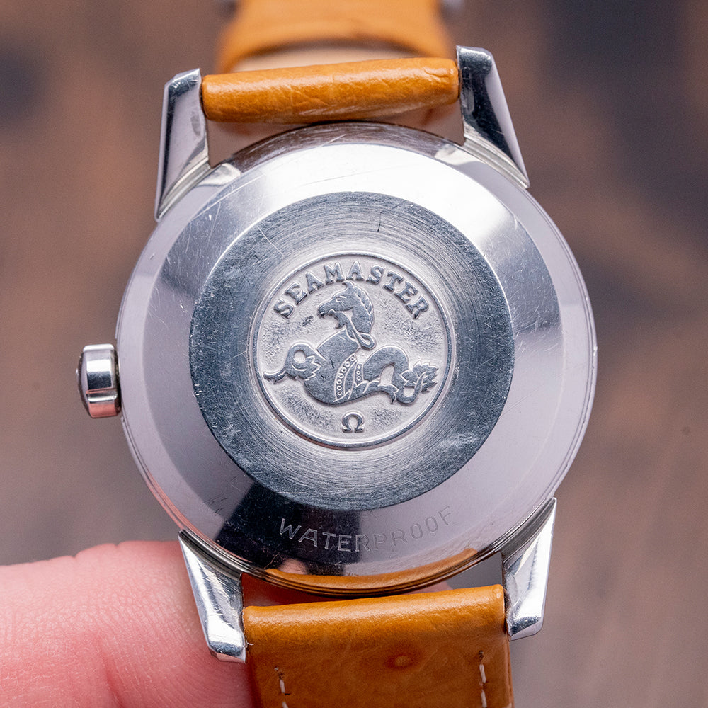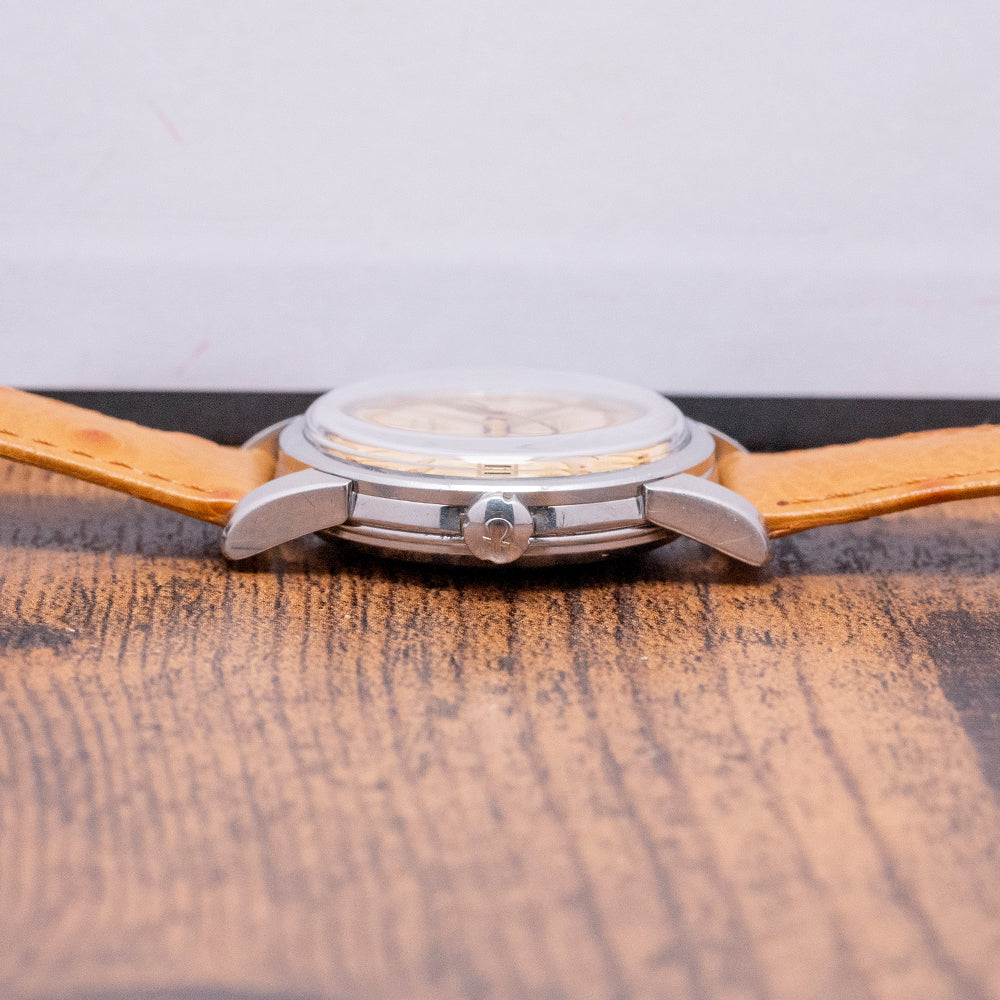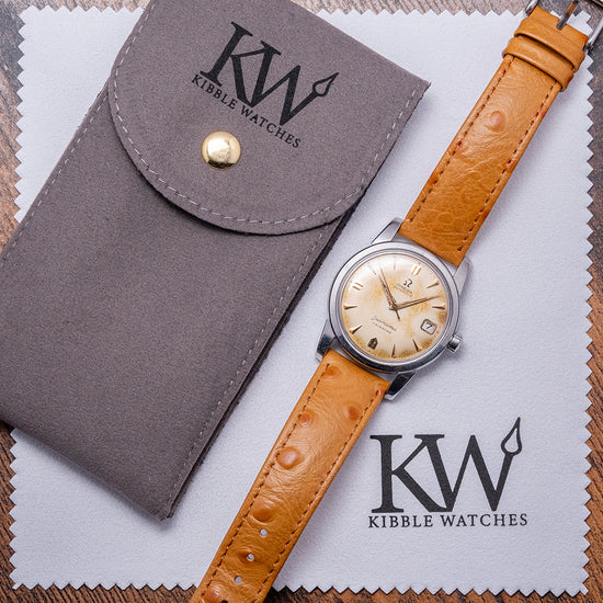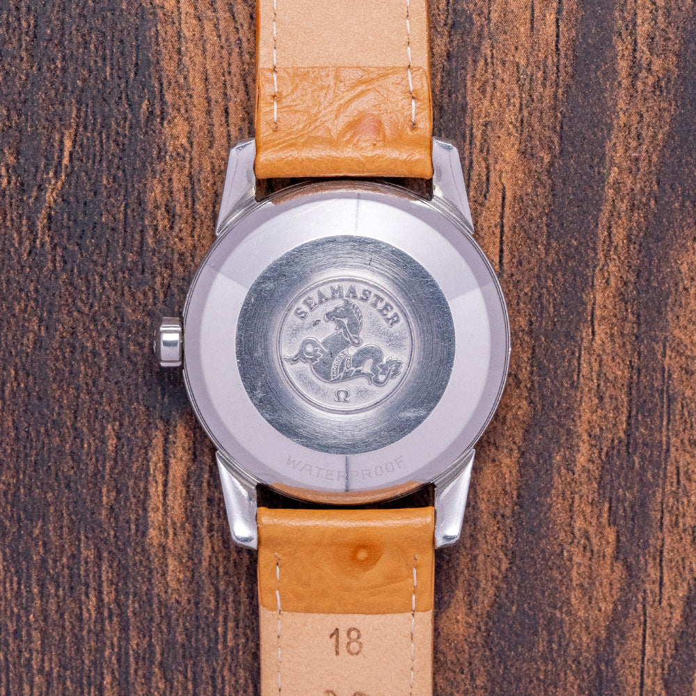 Here we have a 1959 Omega Seamaster Calendar 'Crème Brûlée' 2849 with a 34mm stainless steel case that curves over your wrist with thick lugs; its smooth flanks lead to a lug-to-lug length of 41.5mm and a case thickness of 12mm to ensure a comfortable fit on the wrist. On the right side is a signed coin-edged crown. The smooth bezel holds a domed crystal protecting a cream dial with an even patina pattern, resembling the crisp top of a delicious 'Crème Brûlée' dessert, hence the name, and an outer minute track surrounds applied steel facet dagger indexes marking the hours, that magically reflect the light as you rotate your wrist and, at 3 o’clock, a framed date window. Elegant steel Dauphine hands are complemented by a tapered centre seconds hand. Text is kept to a minimum with an applied Omega motif “Omega Automatic” at noon and “Seamaster Calendar” at 6 o’clock. On the reverse, we have a case back with an engraving and an embossed Hippocampus “Seamaster” in the centre, representing Neptune, the God of the sea; Pierre Borie conceived it after seeing a picture of Neptune riding a chariot pulled by seahorses; it is the reason why the seahorses are wearing a bridle, there is also an engraving on the case back. Inside is an automatic Omega Cal. 503, 20 jewels, beating at 19,800 beats per hour. The watch comes paired with a well-suited 18mm leather strap and pin buckle.