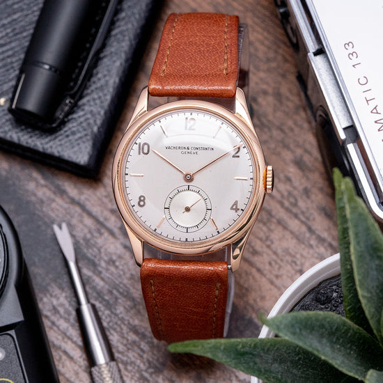 Here we have a 1960 Vacheron Constantin Patrimony 18ct Pink Gold P453/3B with a curvaceous 33.5mm 18ct Pink Gold case, slender tapered lugs, a lug-to-lug length of 40mm and a case thickness of just 9mm ensuring a comfortable fit and a classic profile. On the right side an 18ct Pink Gold crown. A thin bezel holds a domed crystal above a white dial, an outer minute track surrounds applied Gold-toned Arabic numerals and baton indexes mark the hours, slender sword hands sit above large, precisely executed, sub-seconds at 6 o’clock and at noon we have the Vacheron Constantin motif completing this beautifully crafted dress watch. On the reverse 18ct Pink Gold snap-off case back, stamped on the inside with its relevant hallmarks, inside a manually wound Vacheron Cal. P453/3B, 17 jewels, beating at a leisurely 18,000 beats per hour. The watch comes paired with a well-suited 19mm leather strap and an 18ct Pink/Rose Gold pin buckle, stamped with its relevant hallmarks.