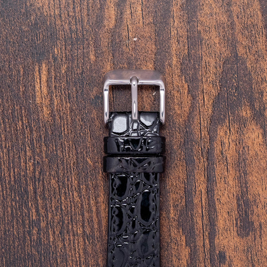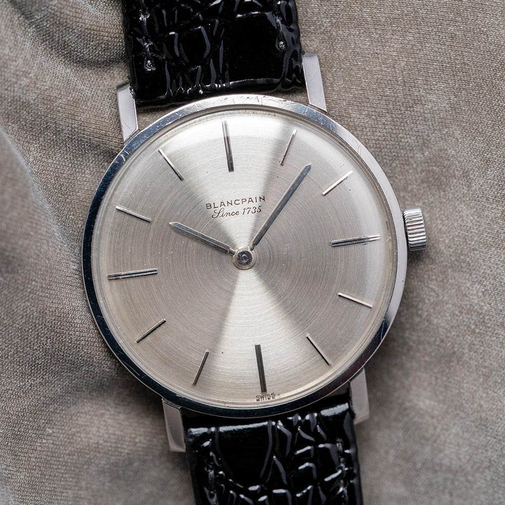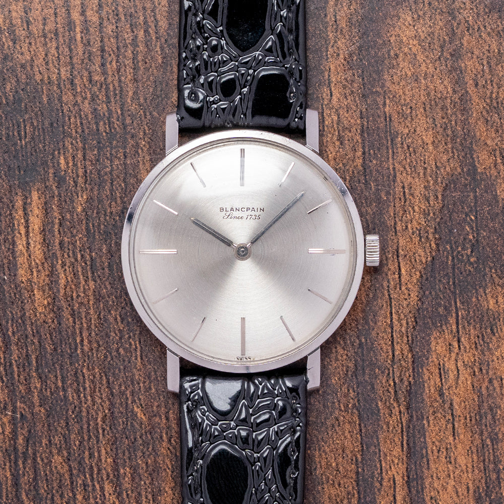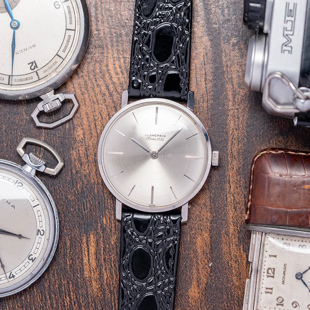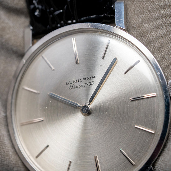 Here we have a 1960s Blancpain Rayville 'Ultra Thin' Steel featuring a curvaceous 34mm stainless steel round case that gently curves over your wrist, thanks to straight lugs. Its slim profile leads to a lug-to-lug length of 40mm, and a case thickness of just 7mm ensures a comfortable fit on your wrist. On the right side, there is a coin-edged crown. A bevel-edged smooth bezel holds a domed crystal above a striking silver engine-turned dial, applied slim baton indexes mark the hours, and elegant hands sit majestically in the centre. At 12 o’clock, the Blancpain motif completes this sophisticated dress watch. On the reverse, a snap-off case back with the details of the watch engraved, inside a manually wound Peseux Cal. 7000, 21 jewels, beating at a leisurely 18,000 beats per hour. The watch comes paired with a well-suited 18mm leather strap and a pin buckle.