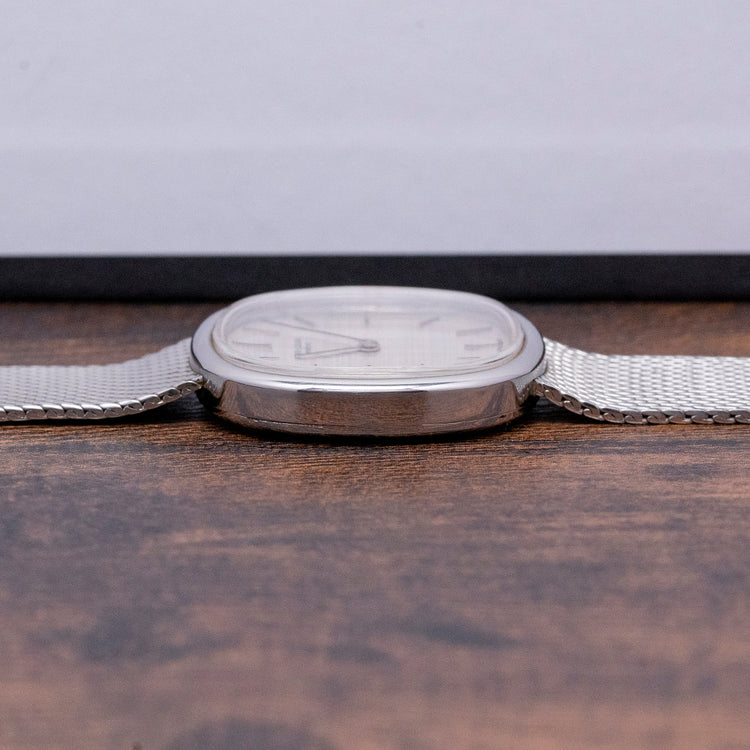 Here we have a 1960s Favre-Leuba Geneve Manual "Ellipse" on a Bracelet with a 32mm Ellipse-shaped stainless steel case that gently curves over your wrist with finely tapered lugs, and a lug-to-lug length of 32mm and a case thickness of just 7.5mm ensures a comfortable fit. On the right side is a signed push/pull crown sitting slightly recessed for a seamless profile. The slim bezel holds a flat crystal above an attractive crosshatch textured silver dial. Applied stick indexes mark the hours and matching stick hands sit majestically in the centre. At noon we have the Favre-Leuba Geneve motif that completes this sophisticated vintage dress watch. On the reverse a snap-off case back, inside a manually wound Favre-Leuba Cal. 252, 17 jewels, beating at a leisurely 18,000 beats per hour. The watch comes paired with its original flowing Favre-Leuba 16.5mm stainless steel mesh bracelet with a signed folding clasp, and this watch is sold with its Favre-Leuba box but without its paperwork.
