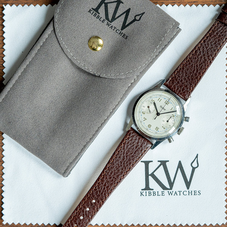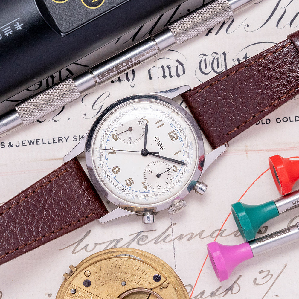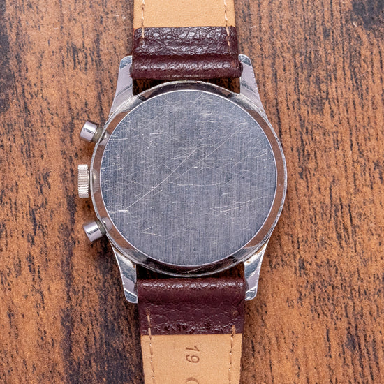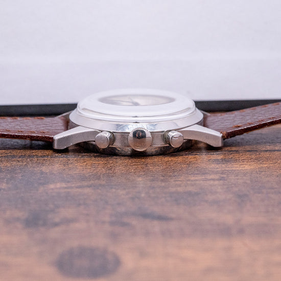 Here we have a 1960s GALLET Multichron 45 Chronograph Valjoux 7730 with a 35mm stainless steel case that curves over your wrist with long tapered lugs, and a lug-to-lug length of 44mm and a case thickness of 11.5mm ensures a comfortable fit. We have the piston-style chronograph pushers down the right side and a large crown in the centre. A smooth bezel holds a domed crystal above a silver dial. An outer tachymeter scale, a minute track and an inner Telemeter scale in blue, each precisely printed. Large Arabic numerals are infilled with Tritium marking the hours, at 3 o’clock a 45-minute register, which gives the watch its name MultiChron 45 and at 9 o’clock the small seconds register, each with an engine-turned pattern and fine hands, elegant slender sword hands infilled with Tritium and complemented by a tapered chronograph hand. At 12 o’clock, we have the Gallet motif completing this vintage multi-scaled bicompax chronograph. On the reverse a brushed and polished case back, inside a manually wound Valjoux 7730, 17 jewels, beating at a leisurely 18,800 beats per hour; this cam-shifting chronograph movement was originally the Venus 188 introduced in 1948 until they were bought by Valjoux in 1966 changing the name to the 7730, it remained in production from 1966 until 1973 and was a base used by many brands such as Panerai, Breitling, IWC, and Heuer. The watch comes paired with a suitable 19mm strap.