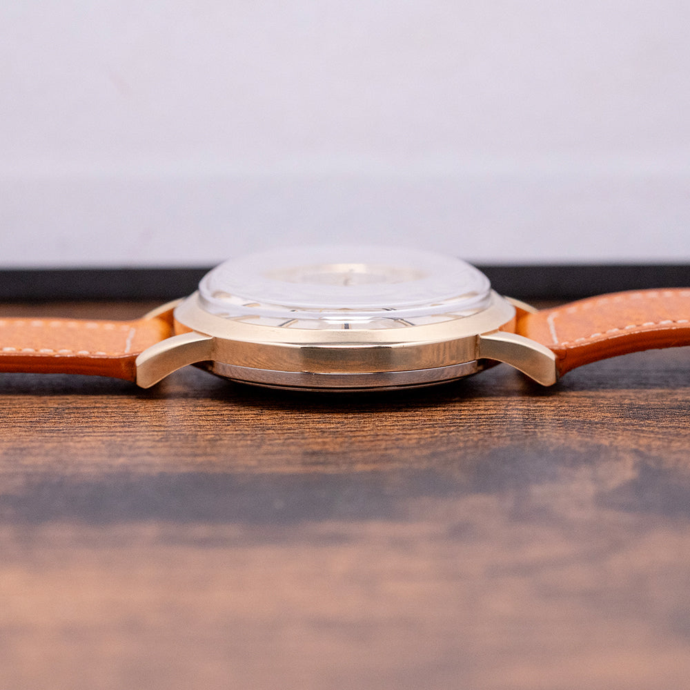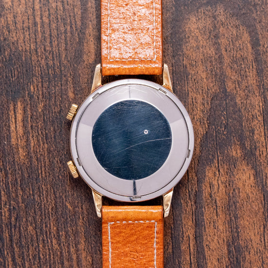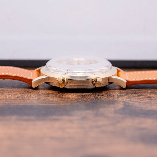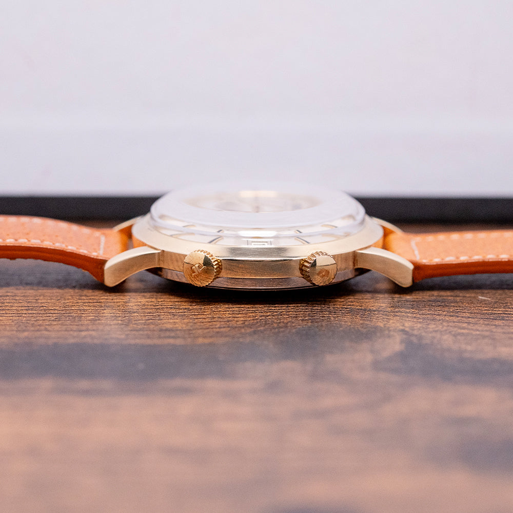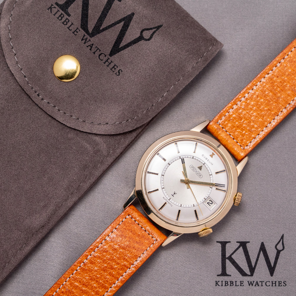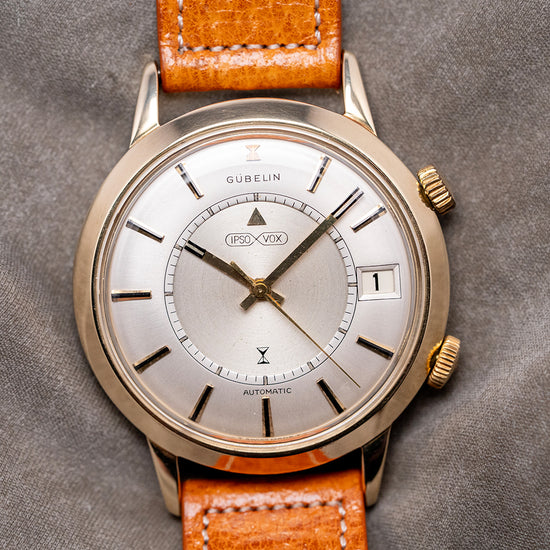 Here we have a rare 1960s Gübelin 'Ipso-Vox' Alarm by Jaeger-LeCoultre 855. The Ipso-Vox is Gübelin’s version of the Jaeger-LeCoultre reference E855 Memovox that was introduced in 1960. This watch features a 36.5mm heavy gold-plated case that gently curves over your wrist with tapered lugs. Its curved flanks lead to a comfortable 45.5mm and a case thickness of 11.5mm. Down the right side, we have two coin-edged crowns, the top one winds and sets the alarm, and the bottom sets the time and date. A smooth sloping bezel holds a domed crystal above a striking domed silver dial. Applied gold-plated batons have a black painted line through them marking the hours, surrounding a minute and hour track with Tritium pips, sitting above a rotating disc featuring an arrow indicator for the alarm. A framed date window at 3 o’clock. At noon, we have the Gübelin motif, and on the disc, 'Ipso-Vox' completes this sophisticated vintage alarm timepiece. On the reverse, a stainless steel screw-down case back, inside the bumper automatic JLC Cal. K825, 17 jewels, beating at a leisurely 18,000 beats per hour, the movement is wound by a half-oscillating weight that "bumps" back and forth, rather than a complete 360-degree rotor. Its mechanical alarm is set using the upper crown and indicated by a rotating central disc on the dial. The alarm is known for its distinctive buzzing sound. It comes paired with a well-suited 18mm strap and pin buckle.