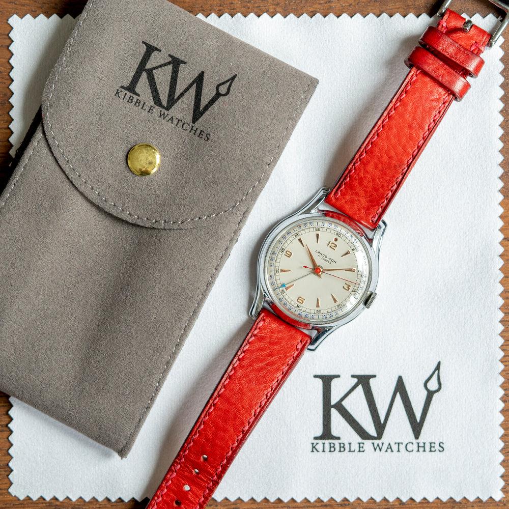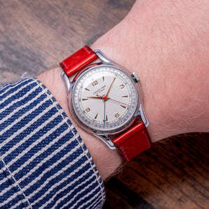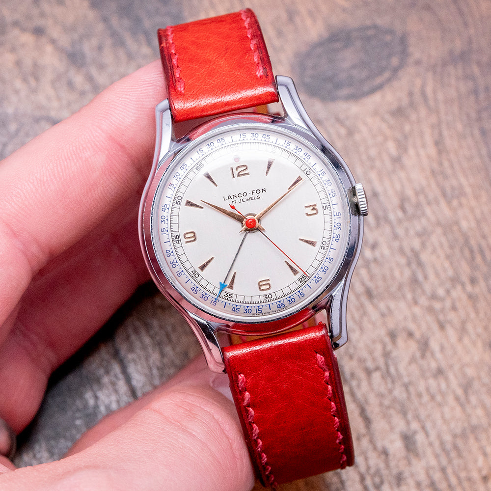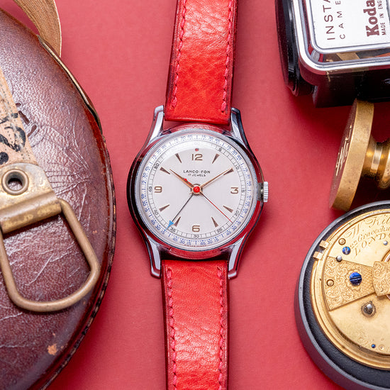 Here, we have a 1960s Lanco Lanco-Fon Alarm 1241 with a 36.5mm Fancy Chrome Case with an attractive scalloped lug that curves over your wrist, the continuous scalloped edge leads to a lug-to-lug length of 45.5mm and a case thickness of 12mm, ensuring a comfortable fit on your wrist. On the right side is a coin-edged push/pull crown. A smooth bezel holds a domed crystal above a dial. An outer quarter of the hour scale surrounds a minute track precisely executed; Arabic and triangle indices mark the hours, slender sword hands are complemented by a red tapered second hand and a blue arrow hand indicating the alarm; at 12 o’clock, we have the alarm on/off indicator hole, applied Lanco-Fon and 17 Jewels printed underneath, at 6 o’clock “Shock Resistant.” On the reverse, a solid case back with Lanco-Fon engraved in the centre, inside a manually wound Lanco Cal. 1241, 17 jewels, beating at a leisurely 18,000 beats per hour. Winding the crown clockwise powers the alarm, and winding anticlockwise powers the watch mainspring; in the first position, turning the crown anticlockwise sets the alarm, and pulling the crown into its second position, you can set the hands. The watch comes paired with an 18mm well-suited aftermarket strap and pin buckle.