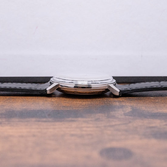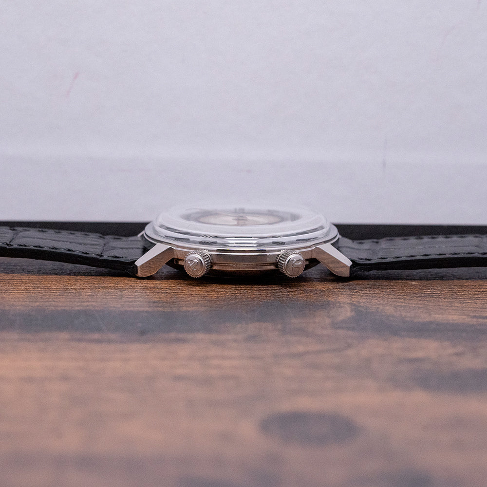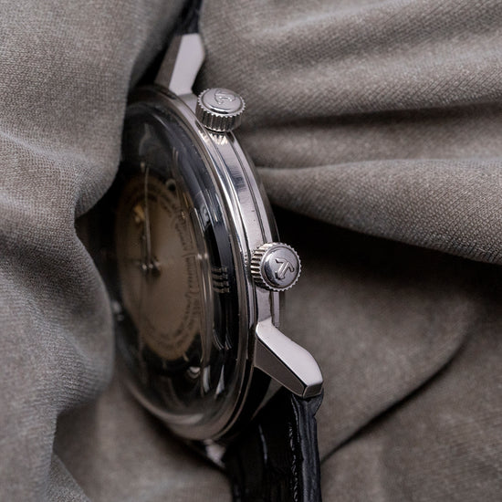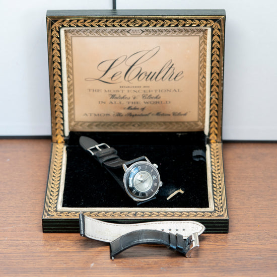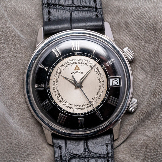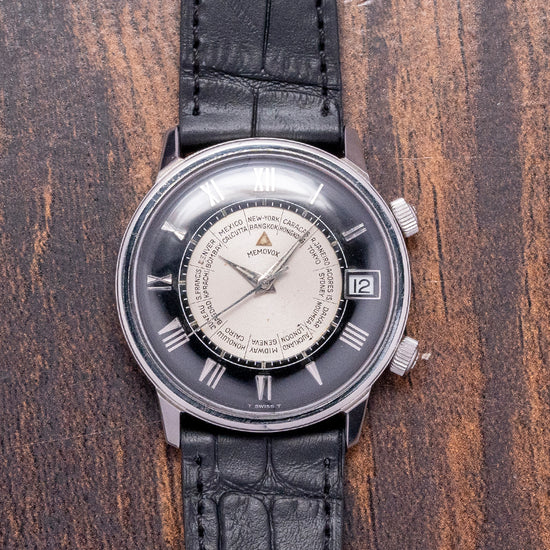 Here we have a beautifully appointed, rare 1960s LeCoultre Memovox 'Tuxedo' Dial World Timer Cal. K911. Introduced in 1950, it was originally called the “Wrist Alarm” but was later changed to “Memovox” for the 1950 Basel watch fair. The name in Latin means “Memor” (Remember) and “Vox” (Memory), a clever play on words. It was a direct competitor of the 1949 Vulcain Cricket Alarm. A 34mm stainless steel round case sits comfortably on your wrist thanks to the tapered, angled lugs, and the curved flanks lead to a lug-to-lug length of 37.5mm and a case thickness of 10mm. On the right side, we have a coin-edge signed crown at two o’clock to rotate the alarm disc and wind the alarm and a coin-edged signed crown at four o'clock to adjust the time. A smooth bezel holds a domed crystal above a striking black and silver domed ‘Tuxedo’ dial. Applied polished steel Roman numerals mark the hours surrounding an inner minute track with Tritium pips at the hour. The inner rotating disc incorporates a ring of worldtimer cities and an Alarm with a helpful arrow showing where it is set; steel Dauphine's hands filled with Tritium are complemented by a tapered second hand. At 3 o’clock, we have a framed date window. At 12 o’clock, we have the Memovox motif, completing this striking Worldtimer Alarm timepiece. On the reverse, a solid case back, inside a Manually Wound LeCoultre Cal. K911, 17 jewels, beating at a leisurely 19,800 beats per hour, the alarm hammer makes a distinctive buzzing sound, double barrel (time and Alarm), and the ‘K’ designates the Kif shock protection system. This incredible movement was launched in 1965. It comes paired with a quick-release 19mm leather strap, plus a 20mm black leather JLC strap that was squeezed on in the original LeCoultre box.