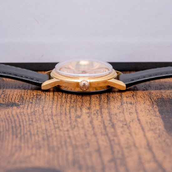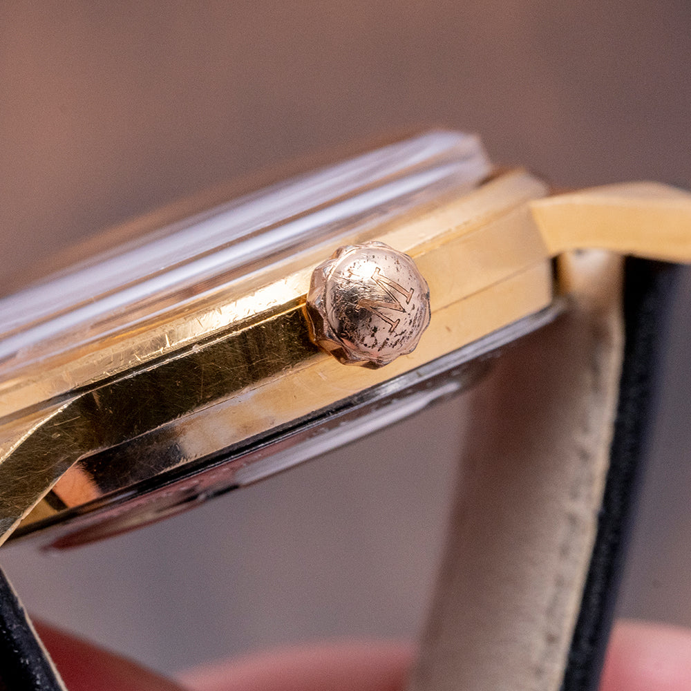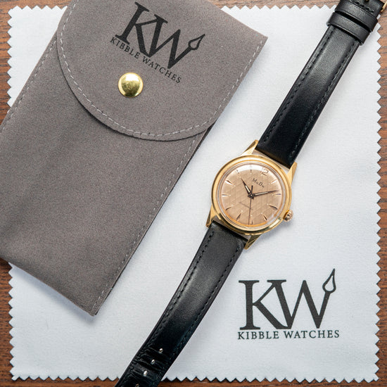 Here we have a 1960s MuDu Doublematic Textured Dial Automatic with a curvaceous 32mm round gold-plated case that comfortably sits on your wrist thanks to the sculpted tapered lugs, and its slender profile leads to a lug-to-lug length of 40mm and a case thickness of 10mm. On the right side a coin-edged signed domed crown. The smooth bezel holds a domed crystal above a stunning crosshatch textured dial. Attractive gold-plated facet dagger indexes with lume pips and Arabic “12” mark the hours, magically catching the light as you rotate your wrist; elegant gold-plated Dauphine hands filled with lume are complemented by a tapered second hand; at 12 o’clock, we have the MuDu motif and at 6 o’clock “doublematic” completing this mesmerising sophisticated dress watch. On the reverse, a screw-down stainless steel case back, engraved with the details of the watch around its edge and MuDu doublematic in the centre, inside is an automatic Felsa Cal. 4000, 17 jewels, beating at a leisurely 18,000 beats per hour.