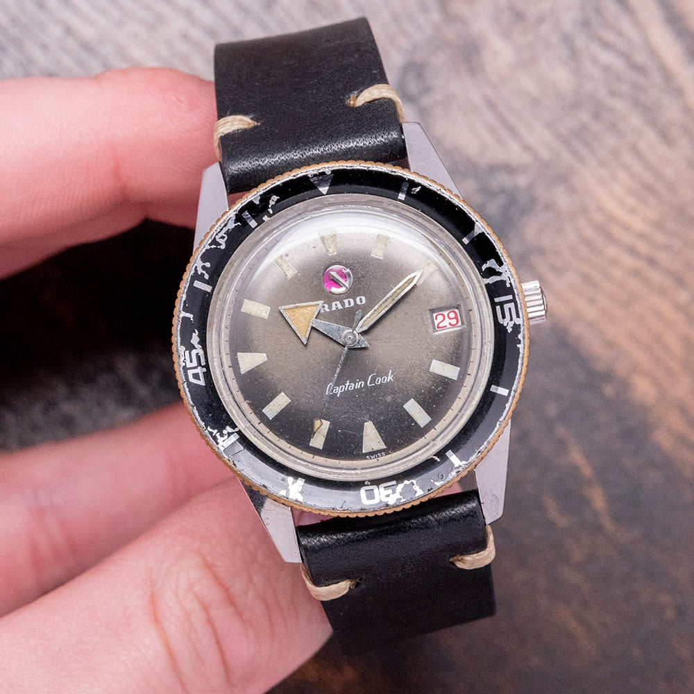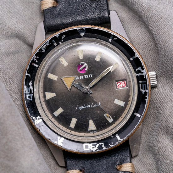 It's not often we see original vintage Rado Captain Cook come to market, and this example we have here is a lovely one with deep patina and wear throughout, showing that it was used as it was intended to be used throughout the years, as a true tool. We often forget that watches like this one were made with a clear purpose in mind, so finding perfectly untouched and mint examples is near impossible. I do imagine what stories this watch could tell us if it could talk, it certainly went on some adventures. Do not hesitate to add this vintage gem to your collection today!