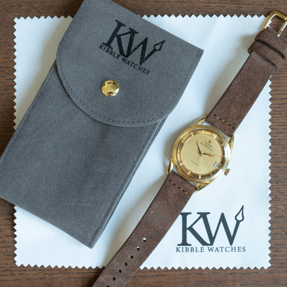 This watch is sold “Watch Only” and therefore comes with no original Universal Geneve box or papers. The watch comes paired with an 18mm brown suede strap. The watch is from Circa. 1960s in very fair vintage condition for its age. The reference and Serial numbers are no longer visible on the case back due to being polished one too many times, it also features a rose-gold Universal signed crown as you can see from the photographs. The watch comes with our 12-Months NON-Waterproof Warranty.