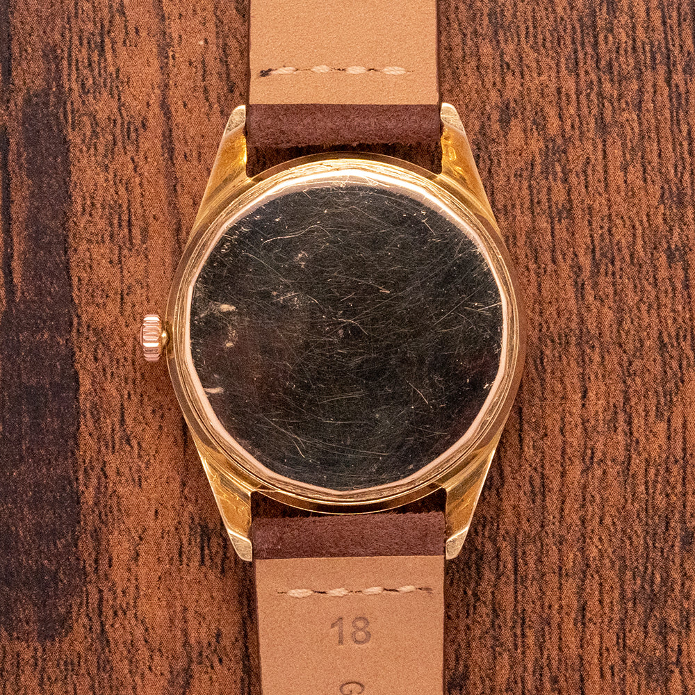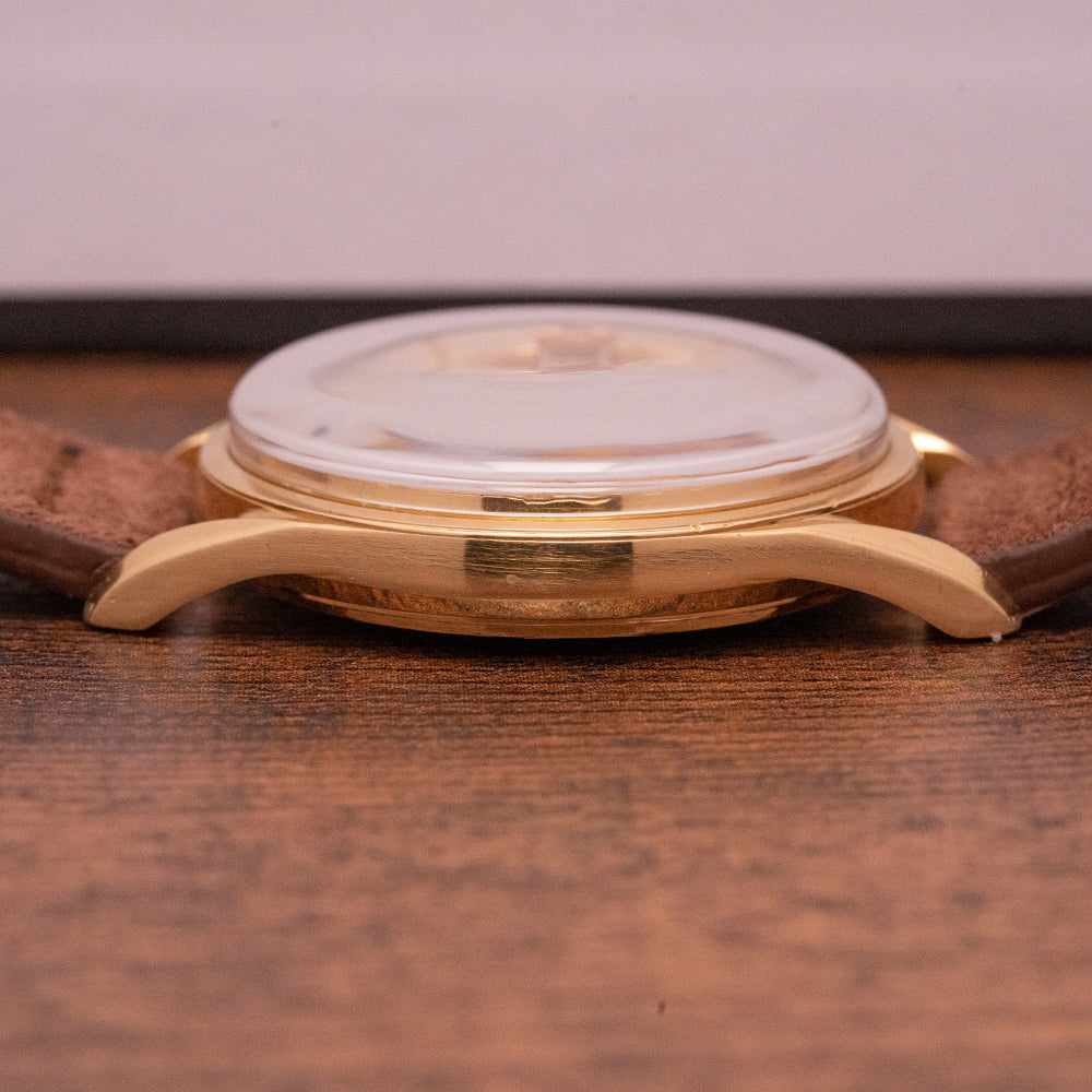Here we have a 1960s Universal Geneve Polerouter Date Automatic that has a stunning 34mm 18ct Yellow Gold case. The Polerouter was first introduced in 1954 and was worn by commercial flight captains for Scandinavian Airlines System (SAS). Their flights took them from Europe to America via Greenland, over the polar region hence the “Polerouter” name. The Polerouter was designed by Gérald Genta at the age of 24. Tapered twisted lugs with a lug-to-lug length of 42.5mm and a case thickness of just 9mm ensure a comfortable fit on your wrist, on the right side is a rose-gold signed crown. A thin smooth bezel holds a domed crystal above a striking gold dial, a raised outer edge with applied hour markers and at 3 o’clock a framed date window. Elegant dauphine hands are complemented by a tapered sweeping second hand. On the reverse, a screw-down polished case back, inside an automatic Universal Geneve Cal. 218-2, 28 jewels, beating at a leisurely 18,000 beats per hour. The watch comes fitted on an 18mm brown suede strap.