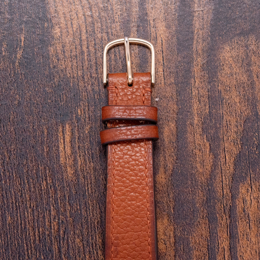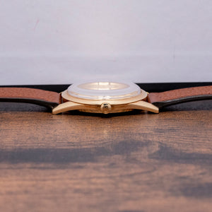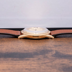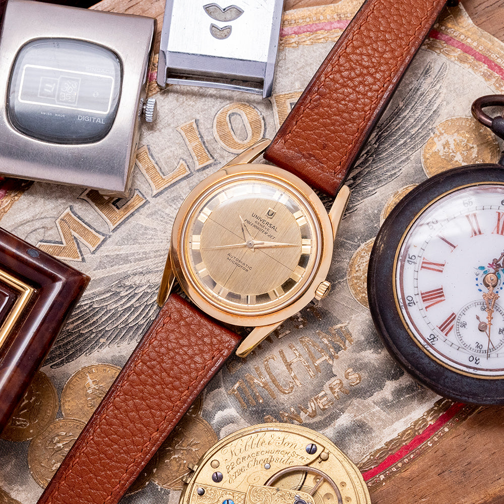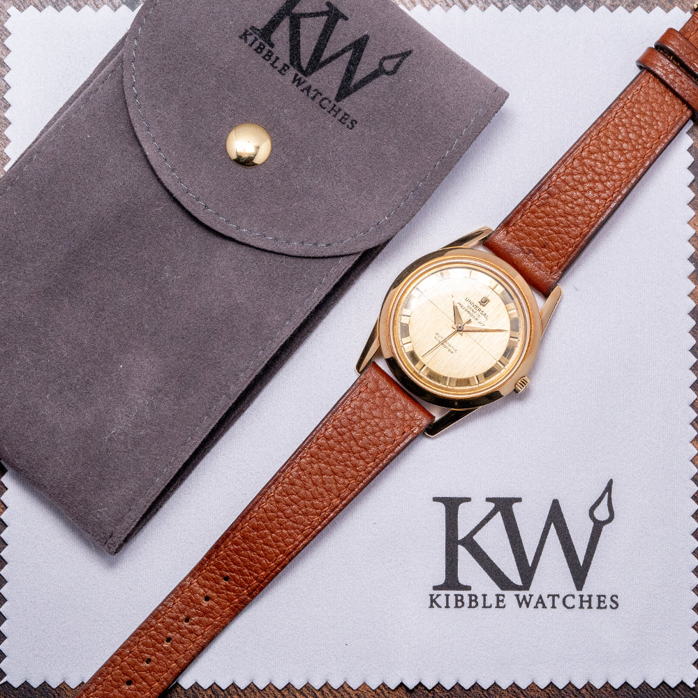 On the reverse, a screw-down 18ct yellow gold polished and machine-turned case back, engraved on the inside with the Swiss hallmarks and the Universal Genève shield, inside an automatic Universal Geneve Cal. 215-9, 28 jewels, beating at 21,600 beats per hour, this micro-rotor movement was launched in 1958. It comes paired with a well-suited 18mm brown leather strap.