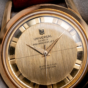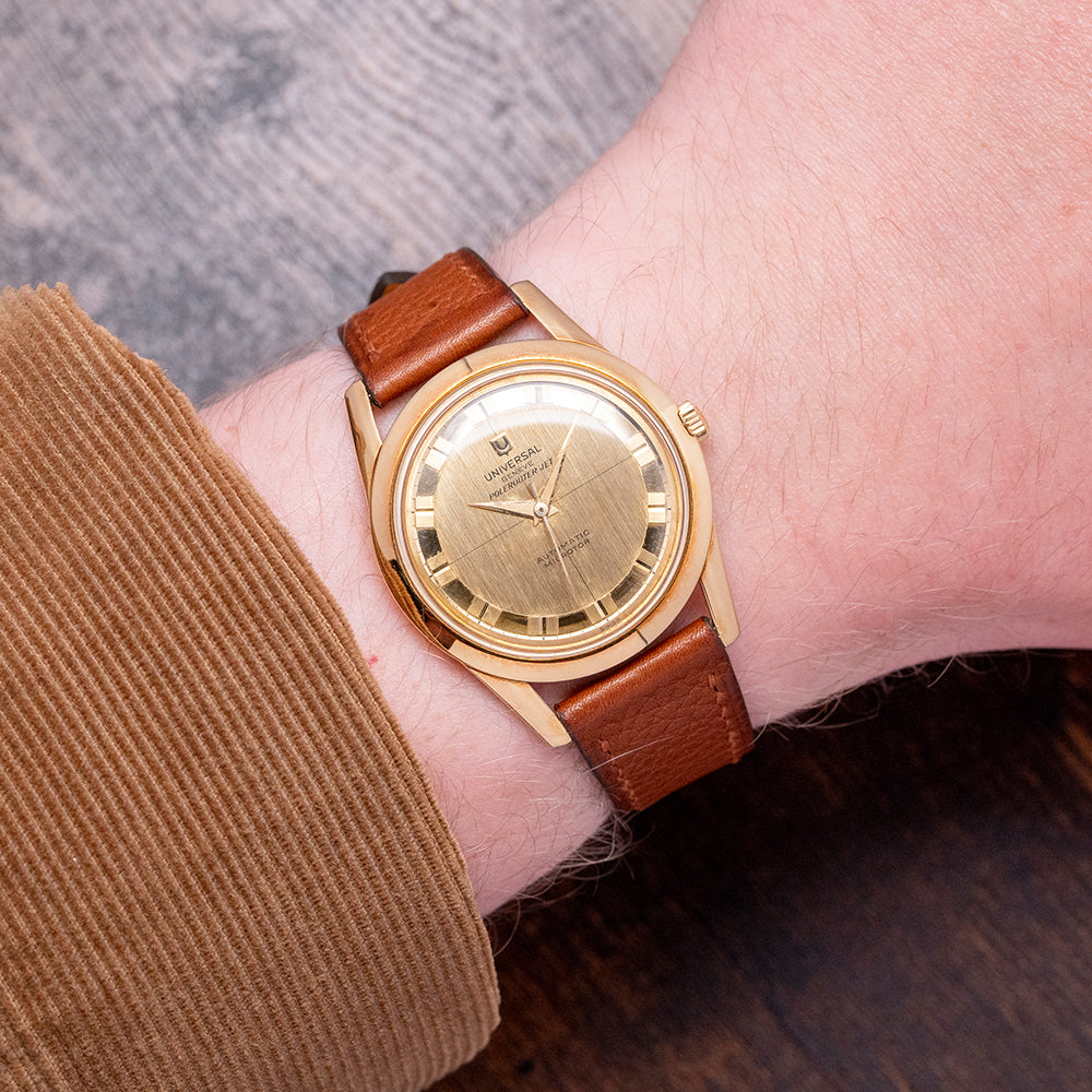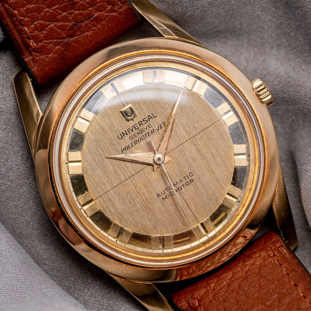 Here we have a rarely seen 1960s Universal Genève Polerouter Jet 18ct Gold Micro-Rotor 10364-1 that has a stunning 34.5mm 18ct Yellow Gold case. The Polerouter was first introduced in 1954 and was worn by commercial flight captains for Scandinavian Airlines System (SAS). Their flights took them from Europe to America via Greenland, over the polar region, hence the “Polerouter” name. The Polerouter was designed by Gérald Genta at the age of 24. Tapered flat-ended lugs are hallmarked with a lug-to-lug length of 43mm and a case thickness of just 9mm, ensuring a comfortable fit on your wrist. On the right side is a yellow-gold, coin-edged crown. A thin, smooth, chamfered-edged bezel holds a domed crystal above a striking gold, vertically brushed dial; an outer minute track surrounds a polished ring with double block hour markers, which catch the light as you rotate your wrist. Elegant Dauphine hands are complemented by a tapered sweeping second hand. At 12 o’clock, we have the Universal Genève motif “Polerouter Jet” and at 6 o’clock “, Automatic Microtor” completes this sophisticated dress watch.
