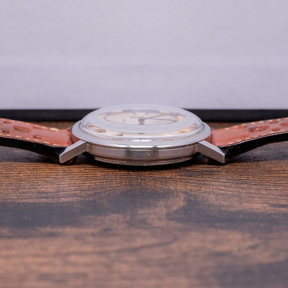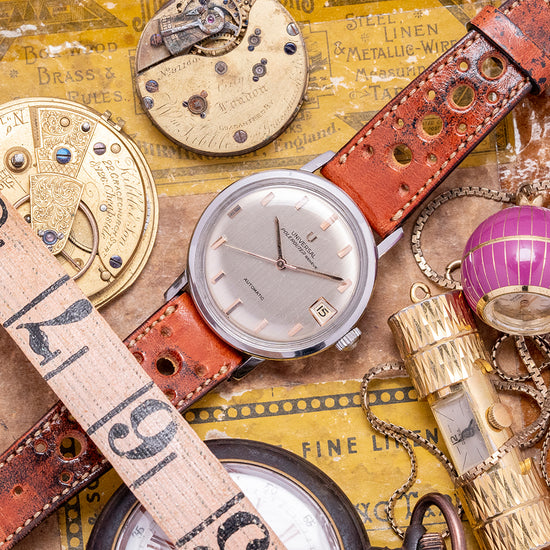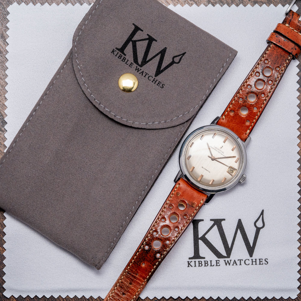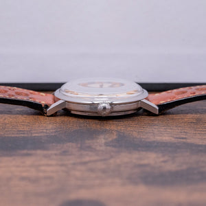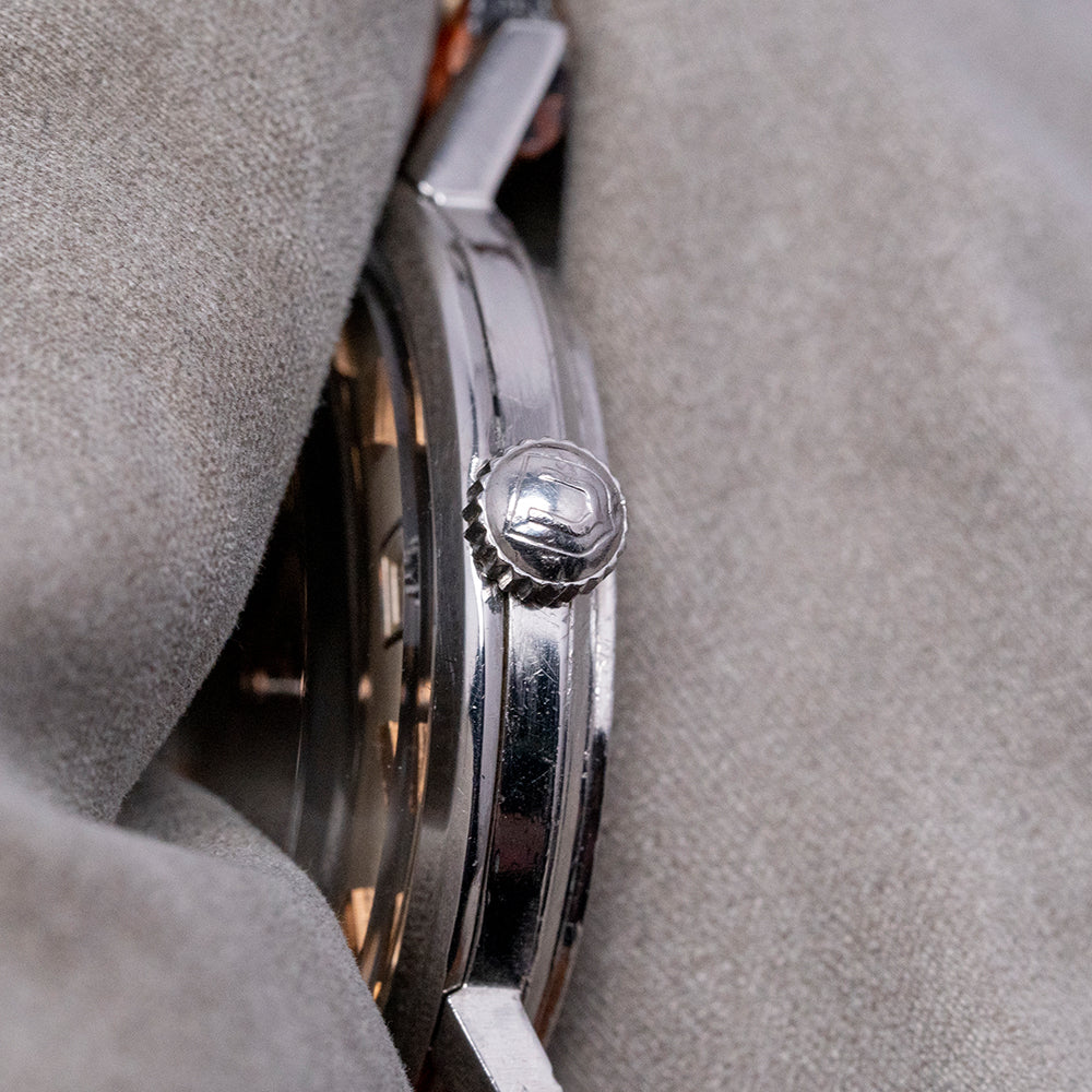 Here we have a 1960s Universal Geneve Polerouter Automatic Date 104604 that has a curvaceous 34mm stainless steel case. The Polerouter was first introduced in 1954 and was worn by commercial flight captains for the Scandinavian Airlines System (SAS). Their flights took them from Europe to America via Greenland, over the polar region, hence the “Polerouter” name. The Polerouter was designed by Gérald Genta at the age of 24. Straight lugs with a lug-to-lug length of 41mm and a case thickness of just 9.5mm ensure a comfortable fit on your wrist; on the right side is a signed crown. A thin, smooth bezel holds a domed crystal above a striking vertical brushed silver dial; vertically applied Art Deco gold facet hour markers add interest and dimension, catching the light as you rotate your wrist and, at 3 o’clock, a framed date window. Elegant gold hands are complemented by a tapered sweeping second hand. On the reverse, a screw-down polished case back, inside an automatic Universal Geneve Cal. 218-2, 28 jewels, beating at a leisurely 18,000 beats per hour, fitted with a micro-rotor. The watch comes paired with an 18mm brown leather strap.