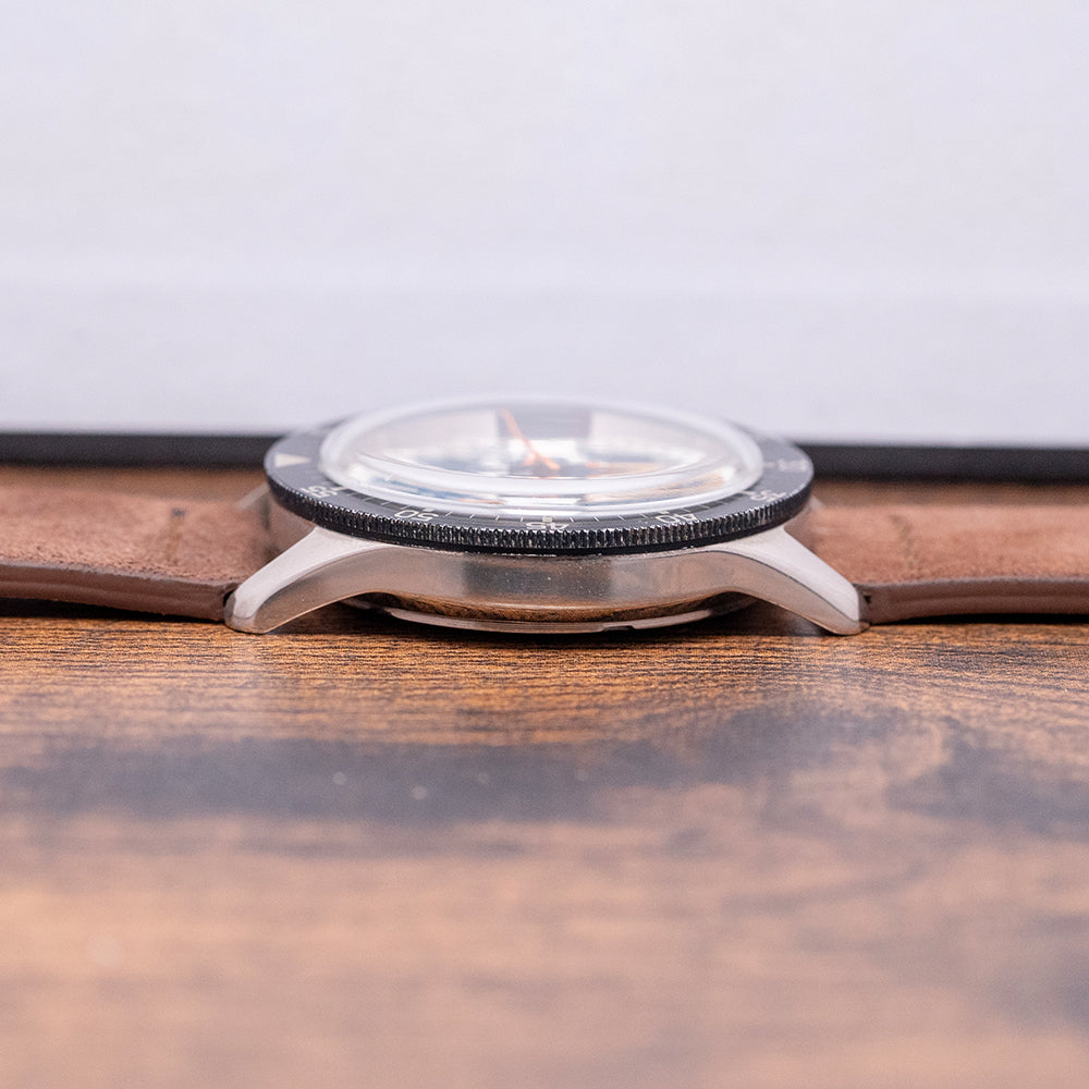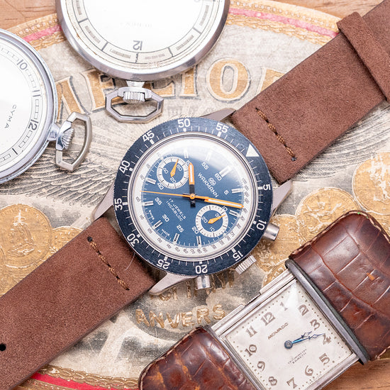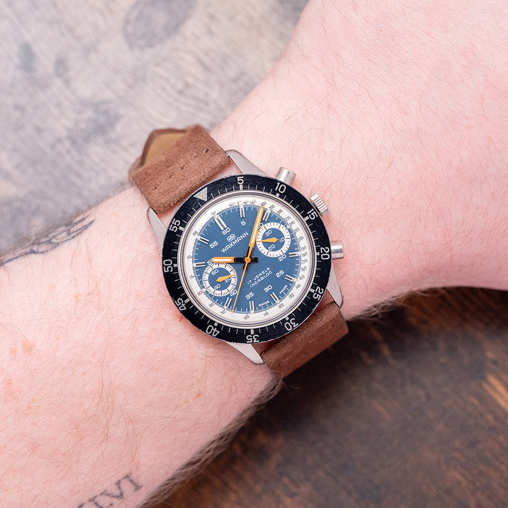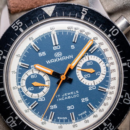 Here we have a 1960s Wakmann Chronograph "Big Boy" Valjoux 236 featuring a 40mm chrome case that sits comfortably on your wrist with tapered lugs. Its curved flanks lead to a lug-to-lug length of 46.5mm and a case thickness of 11.5mm, giving the watch an impressive wrist presence. On the right side are the chronograph pushers, and in the centre is a deep-knurled crown. The characteristic wide rotating bezel features a black insert with a silver 60-minute scale. A domed crystal sits above a striking blue bicompax dial. An outer Tachymeter scale is printed on a white chapter ring surrounding a precisely executed minute track with applied baton indexes marking the hours and 60-minute numerals printed underneath. At 3 o’clock, a white ringed 30-minute register and at 9 o’clock, a white ringed running seconds, each with a tapered orange hand. Orange and black hands filled with lume are complemented by a tapered chronograph hand. At noon, we have the Wakmann motif and at 6 o’clock, ‘17 Jewels Incabloc’ completes this colourful vintage chronograph. On the reverse, a screw-down stainless steel solid case back, engraved around its edge with the details of the watch and the embossed sailing ship in the centre, inside an early manually wound Valjoux Cal. 236, 17 jewels, beating at 21,600 beats per hour. It comes paired with a well-suited 22mm strap and pin buckle.