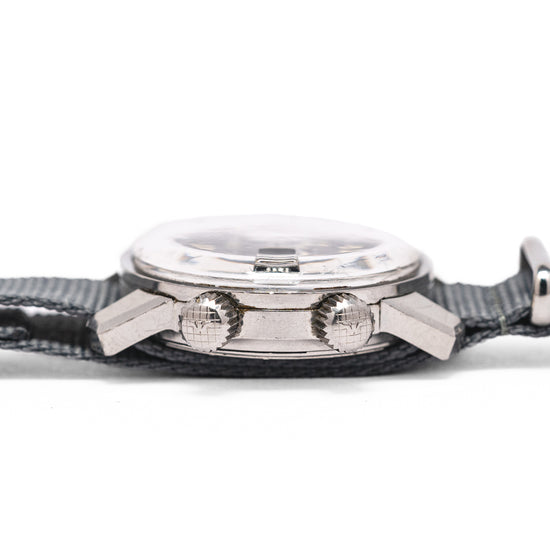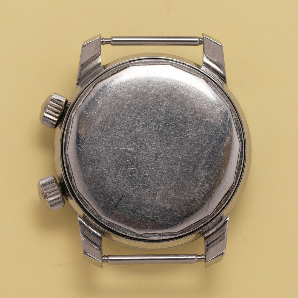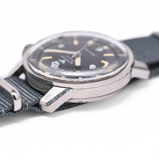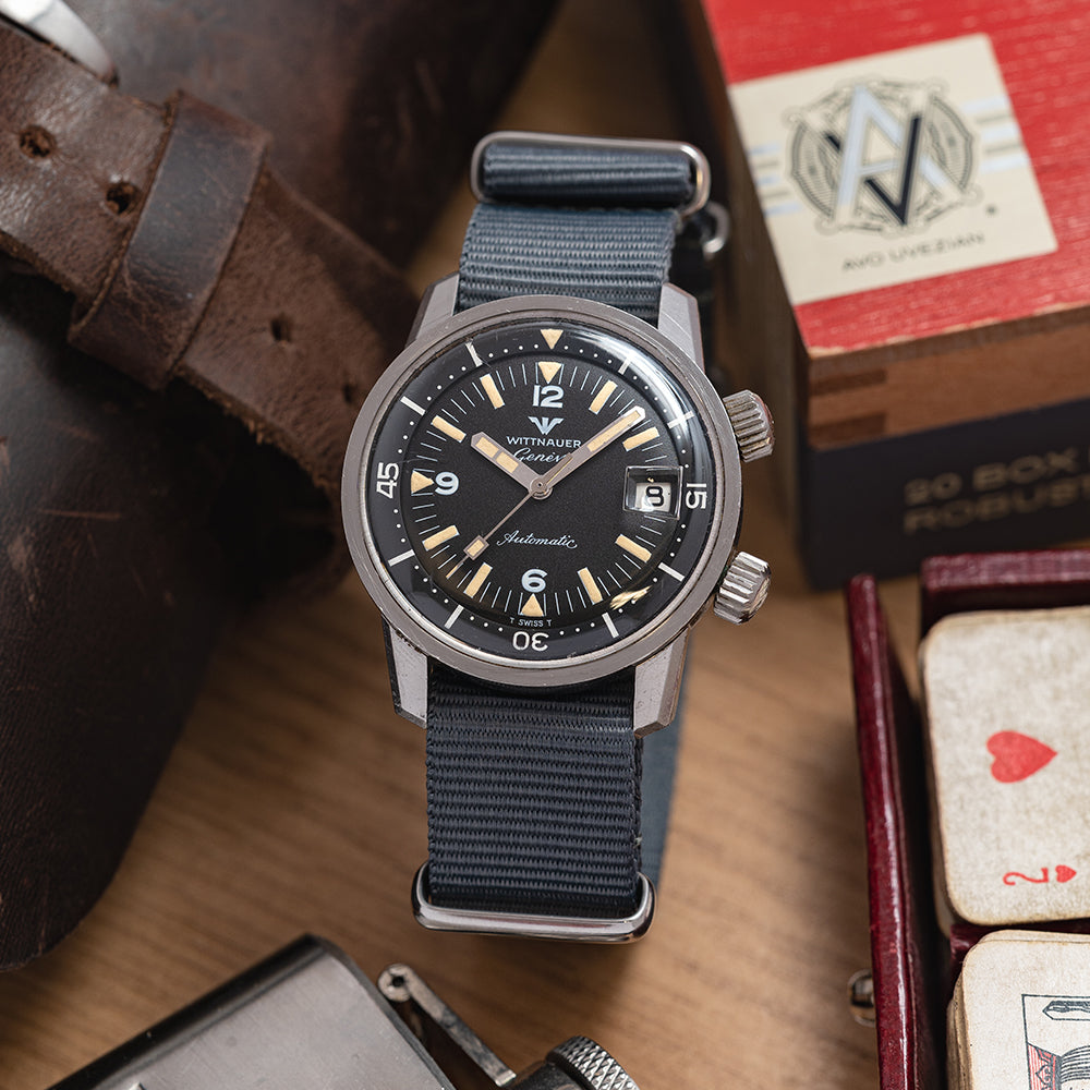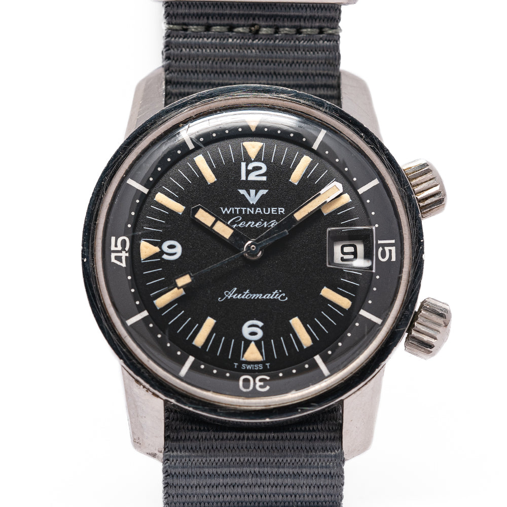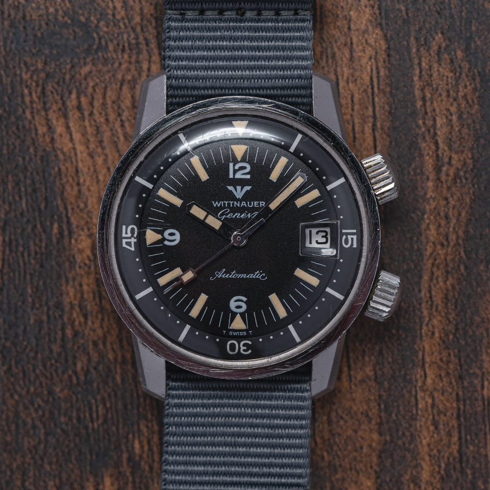 Here we have a 1960s Wittnauer Geneve Automatic Compressor Diver with a 36mm stainless steel Super Compressor case designed and developed by Ervin Pequerez and was adopted by Enicar, Longines and Universal Geneve. A gentle curve over your wrist with bevel-edged thick tapered lugs, a lug-to-lug length of 42.5mm and a case thickness of 12.5mm gives the watch an impressive wrist presence. On the right side, we have two crowns, one at 2 o’clock with cross-hatching and an embossed “W” to adjust the rotating bezel and at 4 o’clock a crown with cross-hatching and an embossed “W” to adjust the time, winding and changing the date. A thin bezel holds a domed crystal above a black dial, a rotating 60-minute inner bezel has white markings and 15, 30, and 45 numerals, Tritium coated triangles and batons mark the hours with 12, 6 and 9 numerals. At 3 o’clock a framed date window, and thick baton hands are infilled with Tritium complemented by a rectangular counterweighted sweeping second hand. At 12 o’clock we have the Wittnauer motif and at 6 o’clock “Automatic” in a flowing font completes this vintage compressor diver. On the reverse, a screw-down case back, inside an automatic Wittnauer Cal. C11KAS1, 17 jewels, beating at 19,800 beats per hour, this movement was a Record design and is equivalent to the Record 1955 and Longines 501. The watch comes fitted on a 19mm leather strap.
