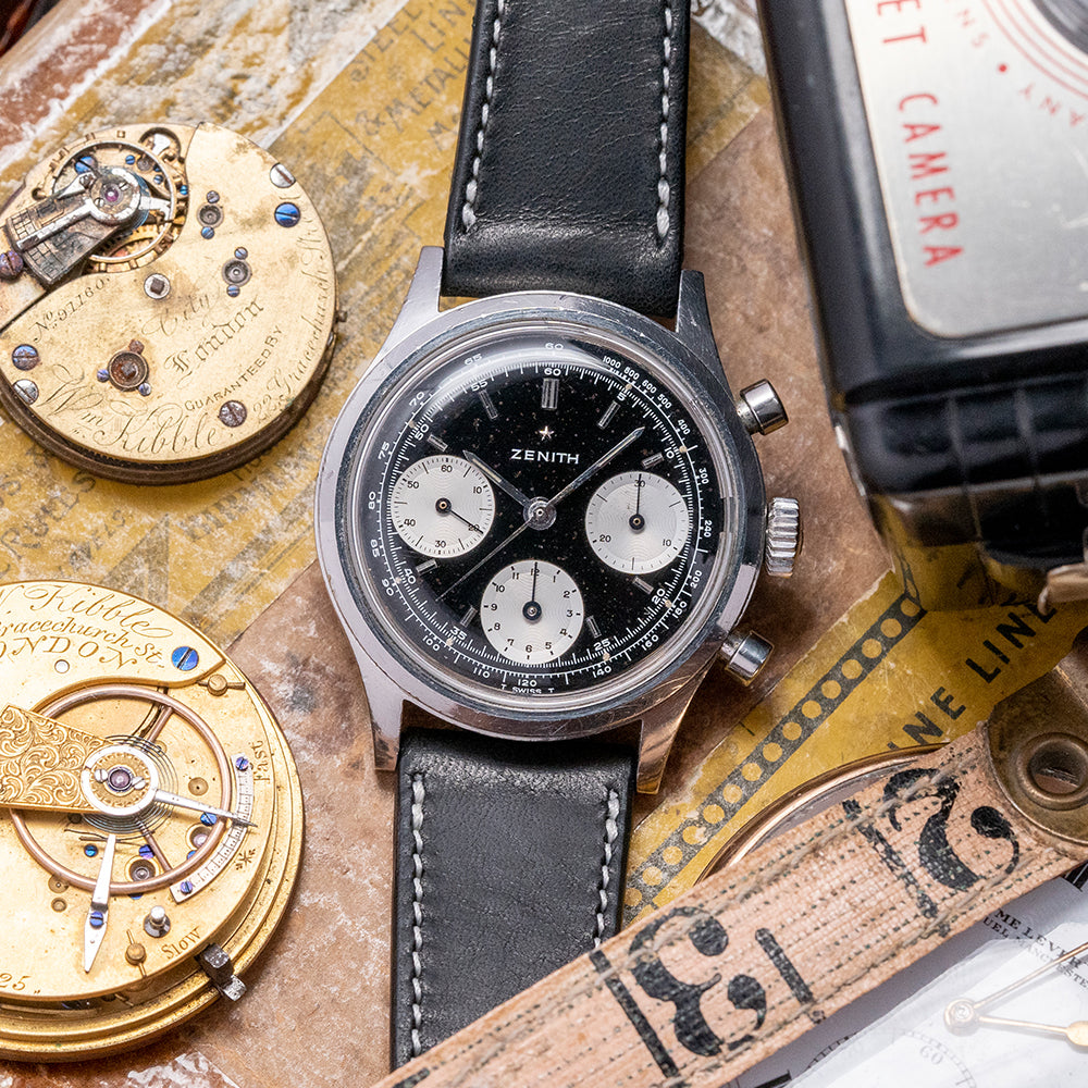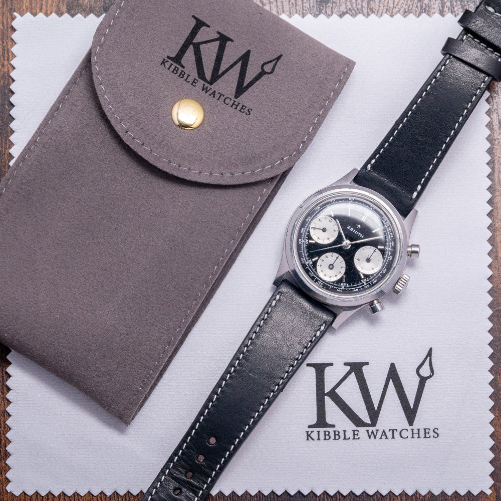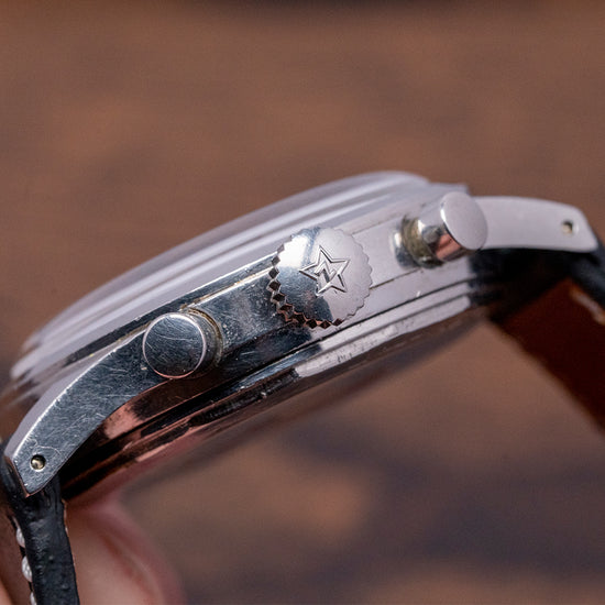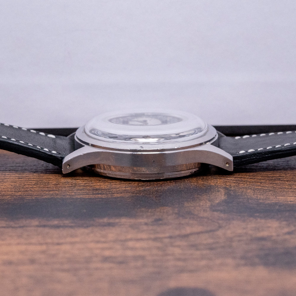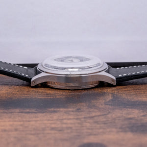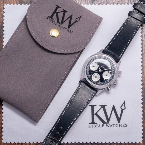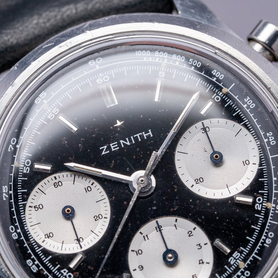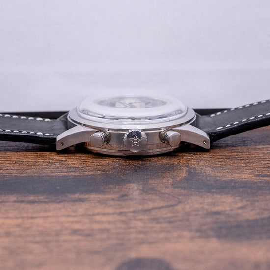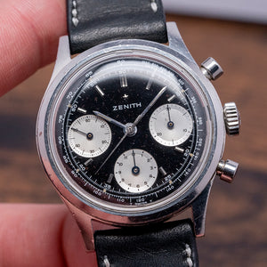 Here we have a classic 1960s Zenith Black Chronograph Cal. 146 HP AH2711 with a 38mm stainless steel case that sits comfortably on your wrist thanks to the tapered lugs, and its curved flanks lead to a lug-to-lug length of 44.5mm and a case thickness of 13mm. Down the right side, we have the piston chronograph pushers and a signed coin-edged crown in the centre. A smooth, bevelled-edged bezel holds a domed crystal above a reverse panda dial. An outer Tachymeter scale surrounds a precisely executed minute track; applied steel baton indexes mark the hours, the chronograph consists of three white recessed registers, a 30-minute, 12-hour and small seconds, steel hands filled with Tritium are complemented by a tapered chronograph hand, at 12 o’clock we have the Zenith motif, completing this dynamic vintage chronograph. On the reverse, a solid case back with the embossed Zenith motif in the centre, inside a manually wound Zenith Cal. 146 HP, one of the last manually wound chronograph movements Zenith made. The "HP'' stood for the three register chronograph designation. "DP" was a 2-register chronograph of the same calibre. The excellent chronograph calibre 146-HP was built from the same Martel components as Universal Genève movements of the 60s. By 1960, Zenith had purchased Martel outright, along with its production facility in Pont de Martel, Switzerland. The very same facility wherein, in 1965, the first prototypes of the El Primero were produced. It comes paired with a well-suited 20mm leather strap and pin buckle.