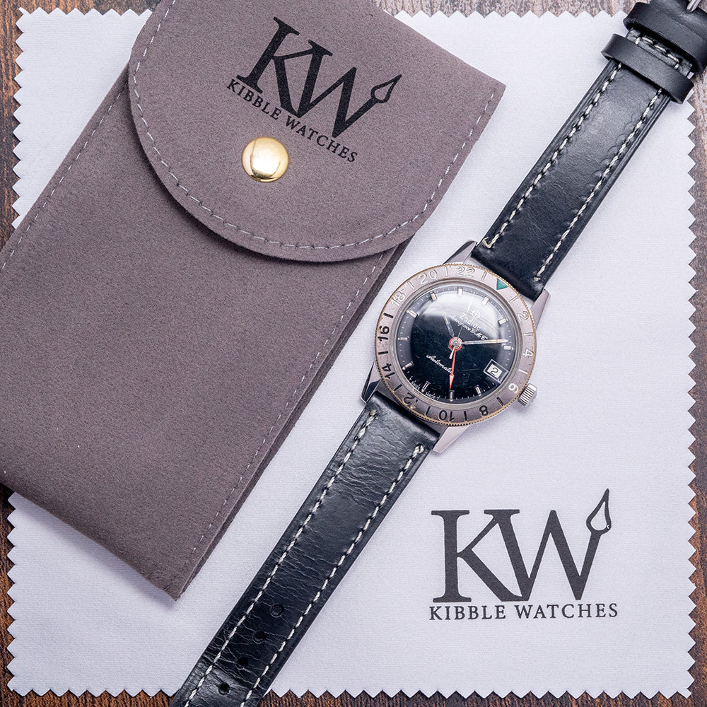 Here we have a classic 1960s Zodiac Aerospace GMT Automatic 752-925 with a 35mm stainless steel case that curves over your wrist with tapered flat-ended lugs, and a lug-to-lug length of 42.5mm and a case thickness of 11.5mm ensures a comfortable fit on your wrist. On the right side is a signed coin-edged crown. The coin-edged friction-fit bezel has an engraved 24-hour scale in white and black holding a domed crystal above a glossy black dial. An outer minute track with Tritium pips surrounding applied facet-edged block indexes marking the hours; at 3 o’clock, a framed date window, steel baton hands filled with Tritium are complemented by a tapered second hand and a red GMT hand; at 12 o’clock, we have the Zodiac motif “Aerospace GMT” printed underneath, “Automatic” completes this vintage traveller companion. On the reverse, a screw-down case back engraved with the details of the watch around its edge, inside an automatic Zodiac Cal. 70-72, beating at 21,600 beats per hour. It comes paired with a well-suited 18mm quick-release strap and pin buckle.