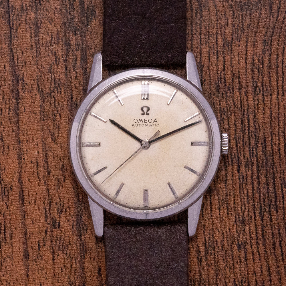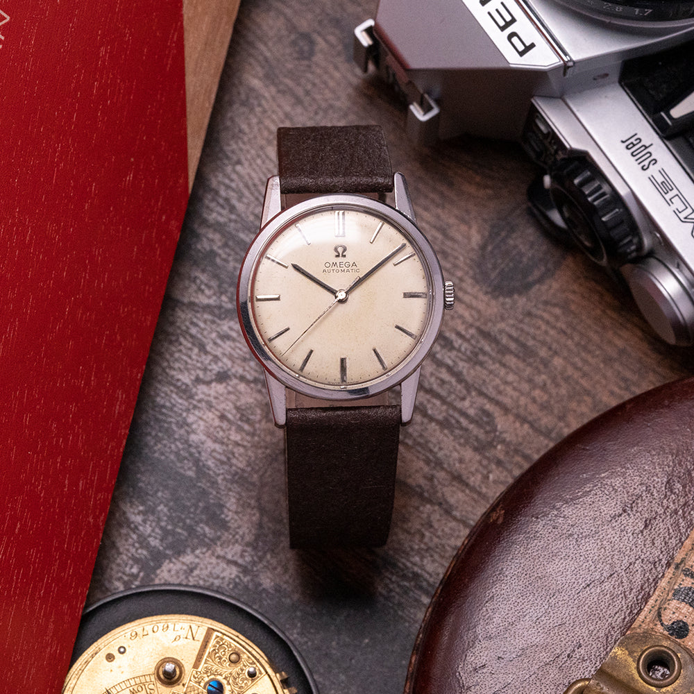 Here we have a 1961 Omega Automatic Classic 14748 SC-61 with a 33mm stainless steel case that curves over your wrist with chamfered-edges tapered lugs, a lug-to-lug length of 41mm and a case thickness of 9mm ensuring a comfortable fit. On the right side, a signed crown and a smooth bezel hold a domed crystal above an eggshell-coloured dial with an even patina. An outer minute track surrounds applied slender baton indexes marking the hours, elegant slim baton hands are complemented by a tapered sweeping second hand, and at 12 o’clock we have the Omega motif and “Automatic” printed underneath completing this simple dress watch. On the reverse a plain case back which is aged and worn, inside an automatic Omega Cal. 552, 24 jewels, beating at 19,800 beats per hour, this workhorse movement was in production from 1958 until 1969. The watch comes paired with a suitable 18mm leather strap.