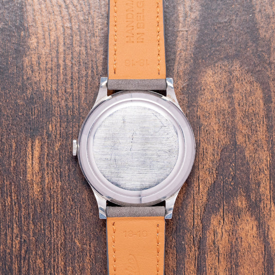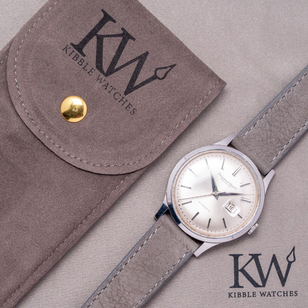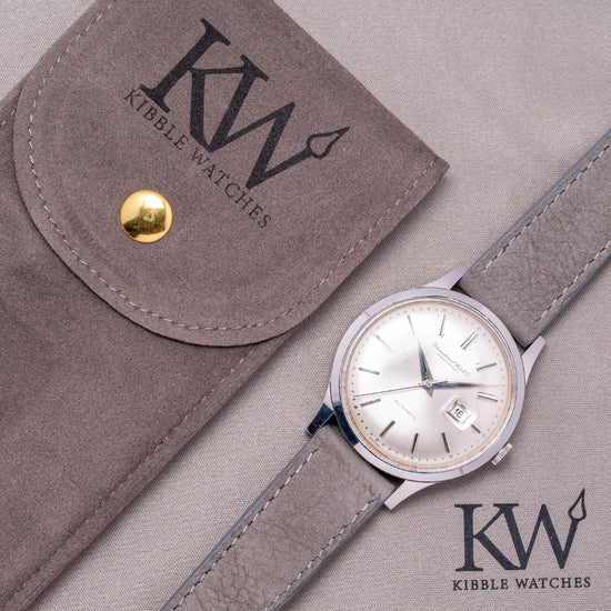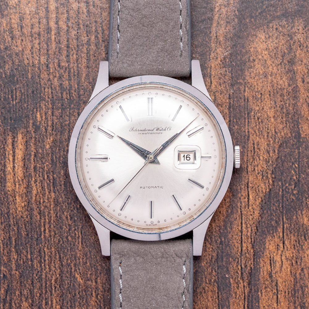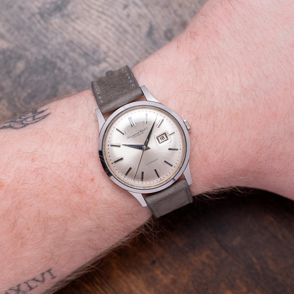 Here we have a curvaceous 1962 IWC Auto Cal. 8531 'Calatrava' Silver Dial R 647A featuring a rare ‘Jumbo’ 36.5mm brushed and polished stainless steel round case that sits comfortably on your wrist, thanks to the curved drilled lugs. The brushed flanks lead to a lug-to-lug length of 43mm and a case thickness of 10.5mm, and on the right side is a push/pull crown with a coin edge for grip. A thin, smooth polished bezel holds a domed crystal above a striking sunburst silver ‘Calatrava’ dial, an outer ring of pips mark the minutes surrounding applied polished facet baton indexes marking the hours; they magically play with the light as you rotate your wrist, elegant slim Dauphine hands are complemented by a tapered second hand, at 3 o’clock we have a framed date window with cyclops magnification, at noon you find the original International Watch Company motif in its distinctive swirling script and at 6 o’clock “Automatic” completes this incredibly sophisticated dress watch. On the reverse, a polished and brushed case back, inside an automatic IWC Cal. 8531, 21 jewels, based on the IWC-exclusive Pellaton automatic winding system, developed by Albert Pellaton in 1950, this new self-winding mechanism was deemed groundbreaking for its era. It revolutionised the traditional approach by enabling the transfer of energy from the bidirectional rotor to the mainspring. This innovative solution proved to be considerably more efficient compared to other self-winding movements of the time. It comes paired with its well-suited aftermarket 18mm leather strap and pin buckle.