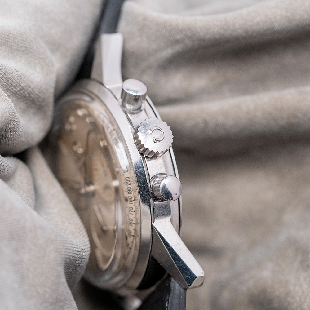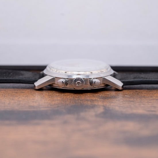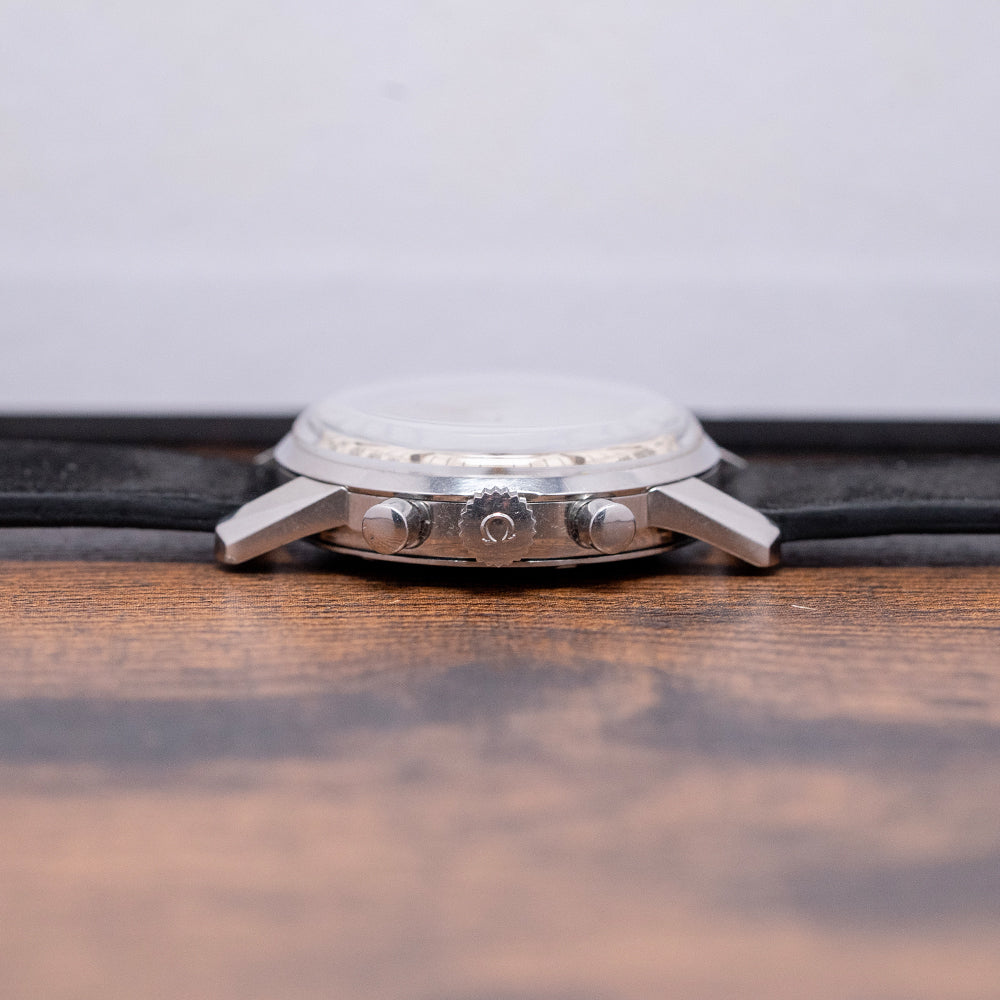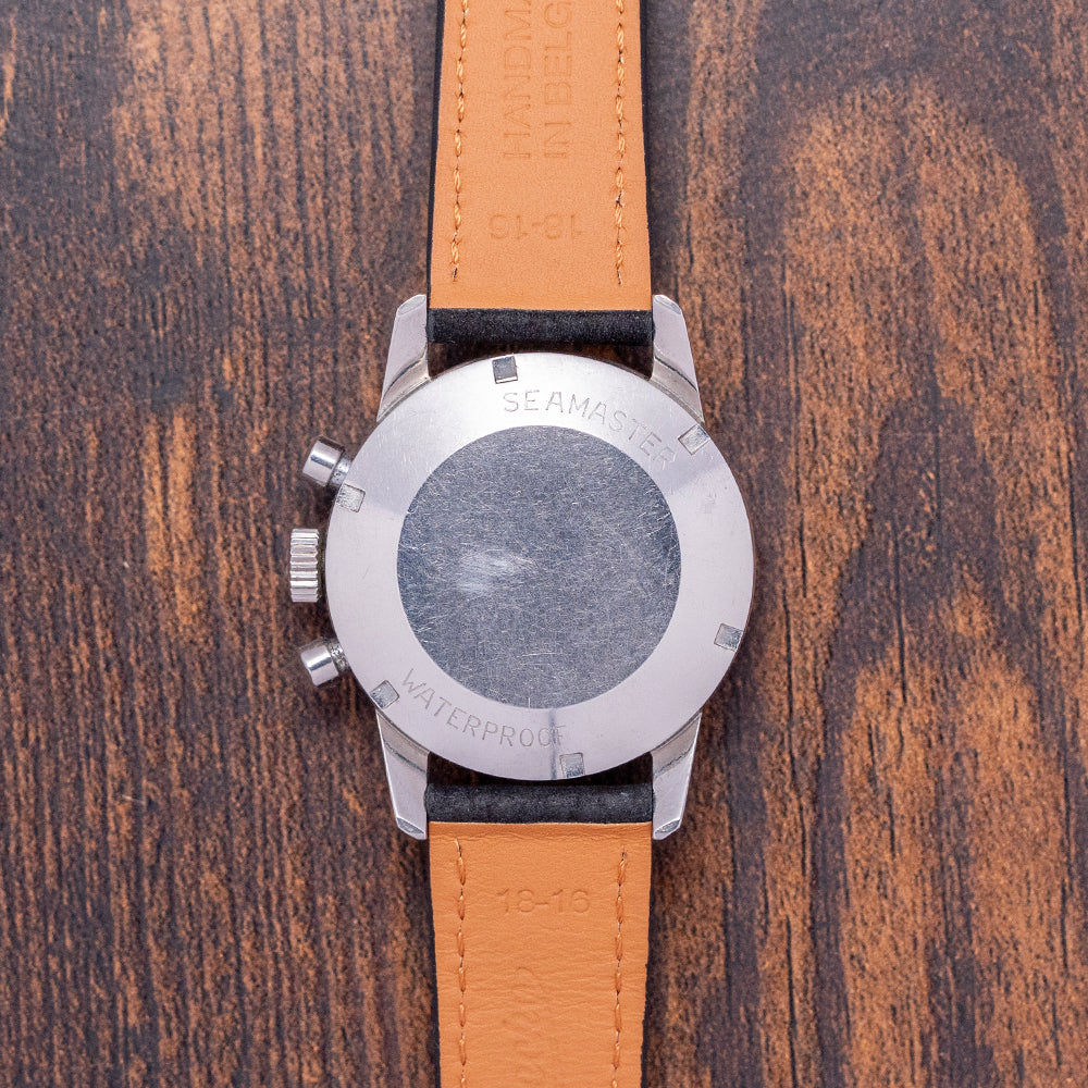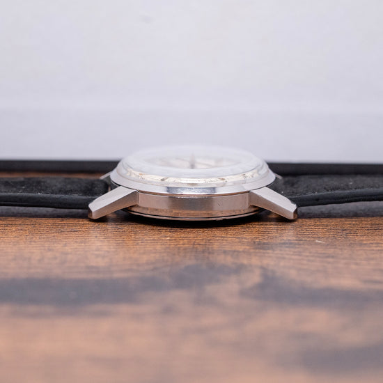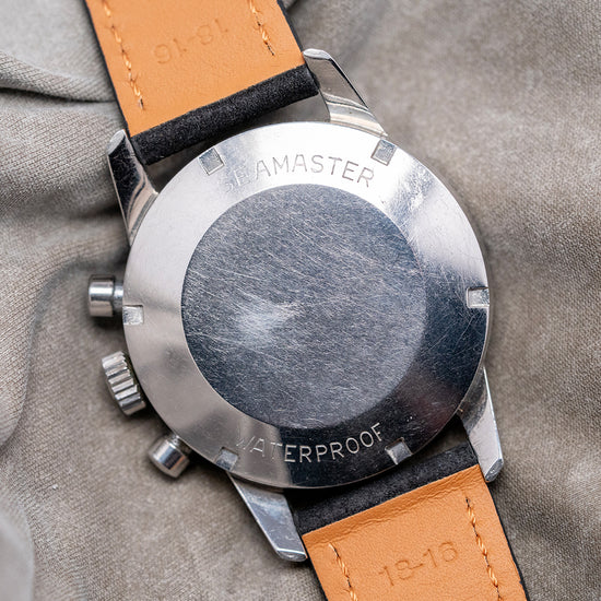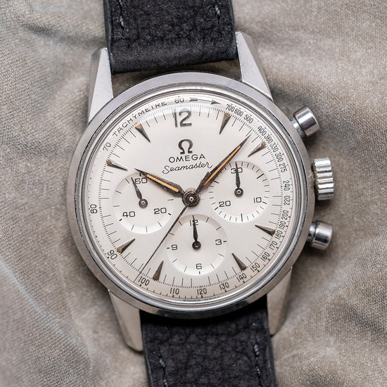 Here we have an incredible classic 1962 Omega Seamaster Chronograph Cal. 321 14364, featuring a 35mm stainless steel case that gently curves over your wrist, with chamfered, tapered, flat-ended lugs. Its curvaceous flanks lead to a comfortable lug-to-lug length of 43.5mm and a case thickness of 12.5mm. On the right side are piston-style chronograph pushers, and in the centre, there is a large coin-edged, signed crown. A slim bezel holds a domed crystal above an attractive cream dial. An outer Tachymeter scale sits above a precisely executed minute track, surrounding the applied Arabic ‘12’ and facet dagger indexes that mark the hours, complete with lume pips. At 3 o’clock, a recessed 30-minute register; at 6 o’clock, a recessed 12-hour register and finally at 9 o’clock, a recessed running seconds. Elegant, slim steel Alpha hands are lume-filled and complemented by a tapered chronograph hand. At noon, we have the Omega motif and ‘Seamaster’ printed underneath, completing this distinguished vintage chronograph. On the reverse, a solid screw-down case back ‘Seamaster Waterproof’ engraved, inside a manually wound Omega Cal. 321, 17 jewels, beating at a leisurely 18,000 beats per hour, column wheel chronograph, created for the first Speedmaster in 1957 in collaboration with Lémania based on the Albert Piguet designed Lémania 2310 found in Vacheron Constantin, Audemars Piguet and Patek Philippe chronographs and remained in production until 1968, when it was replaced by the Omega Cal. 861. The watch comes paired with a well-suited 18mm leather strap and pin buckle.