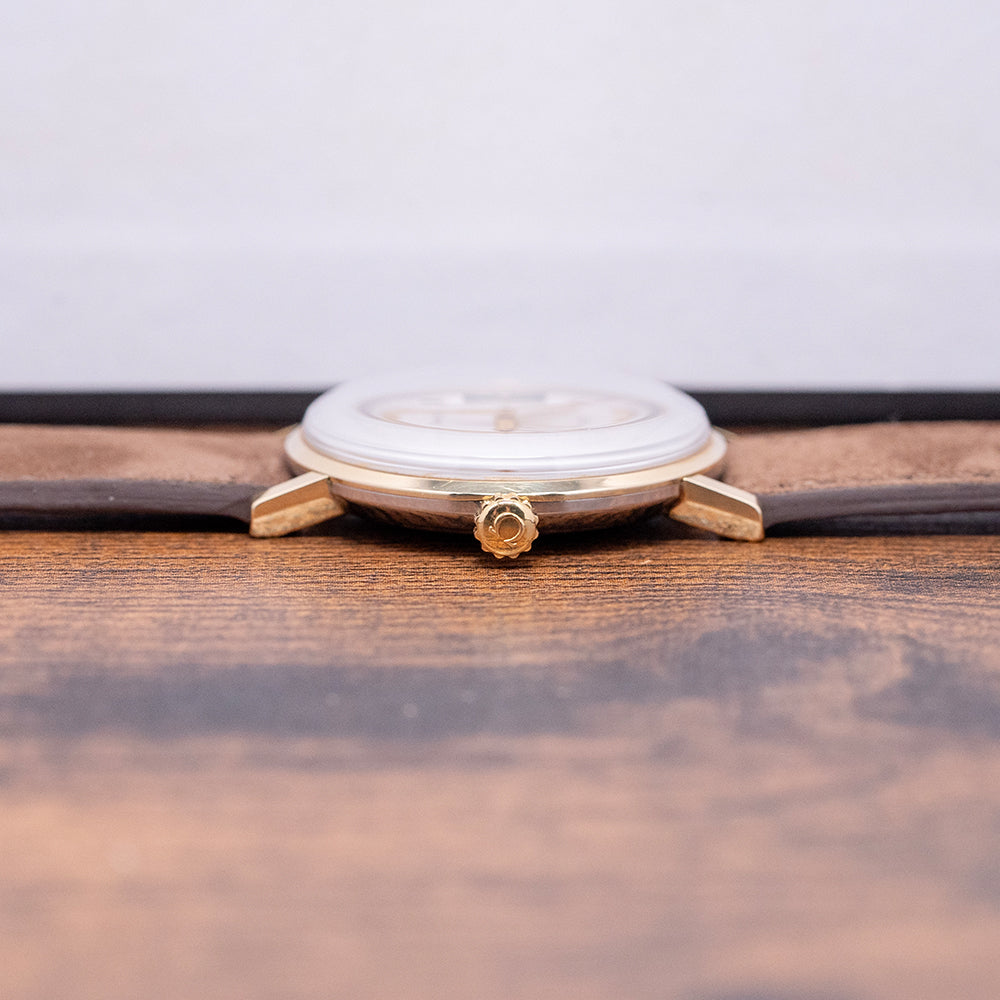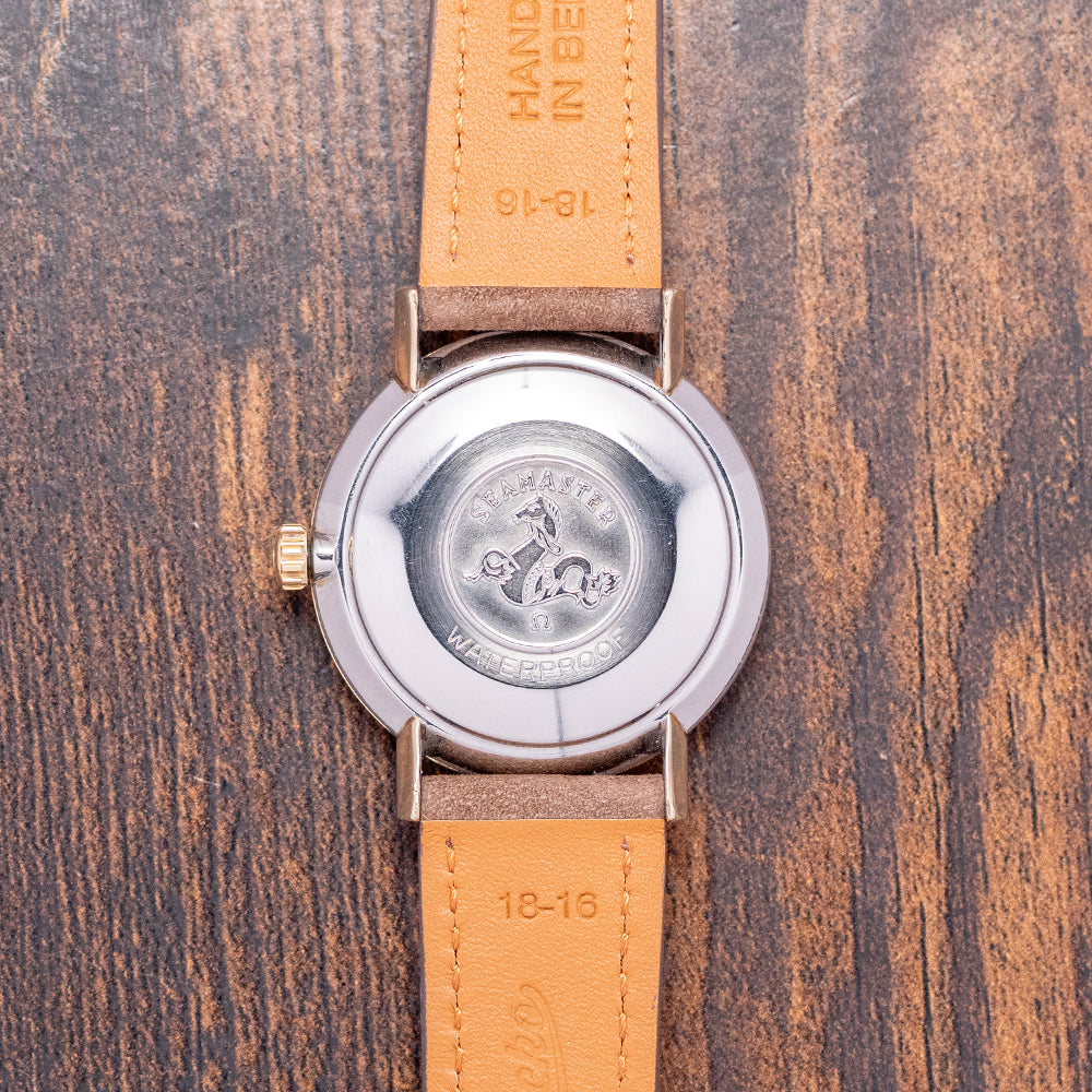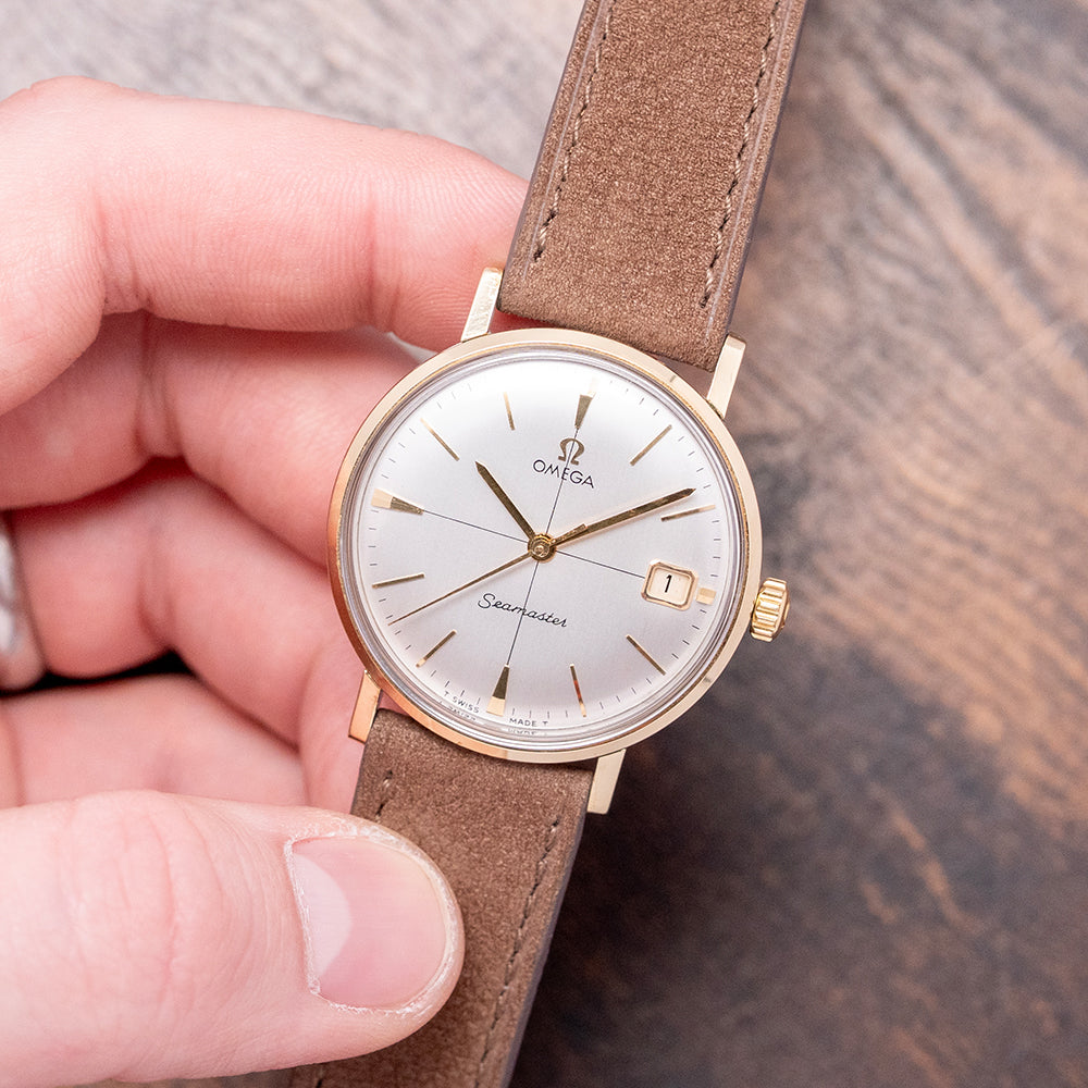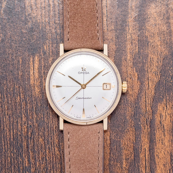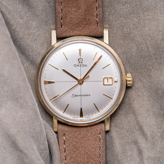 Here we have a 1962 Omega Seamaster Crosshair 14775 featuring a 34mm gold-plated round case that gently curves over your wrist with straight, flat-ended lugs. Its slim curved flanks lead to a comfortable lug-to-lug length of 40mm and a case thickness of 9.5mm. On the right side, a signed push/pull crown. The smooth bezel holds a domed crystal above a stunning sunburst silver vertically brushed cross-hair dial. An outer minute track surrounds applied gold-plated indexes marking the hours. At 3 o’clock, a framed date window. Gold-plated hands are complemented by a tapered sweeping second hand. At noon, we have the applied Omega motif, and at 6 o’clock, ‘Seamaster’ completes this striking vintage timepiece. On the screw-down case back, we have the embossed hippocampus and a seahorse, which represent Neptune, the god of the sea. It was conceived by Pierre Borie after seeing a picture of Neptune riding a chariot pulled by seahorses. It is the reason why the seahorses are wearing a bridle and was first seen on the Seamaster in 1958. Inside a manually wound Omega Cal. 610, 17 jewels, beating at 19,800 beats per hour. It comes paired with a well-suited 18mm leather strap.