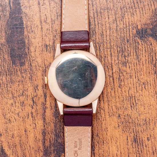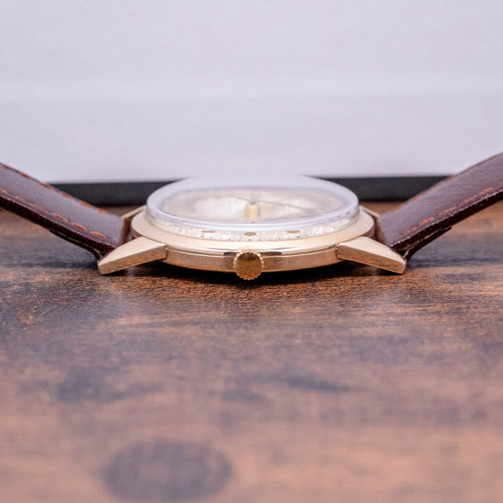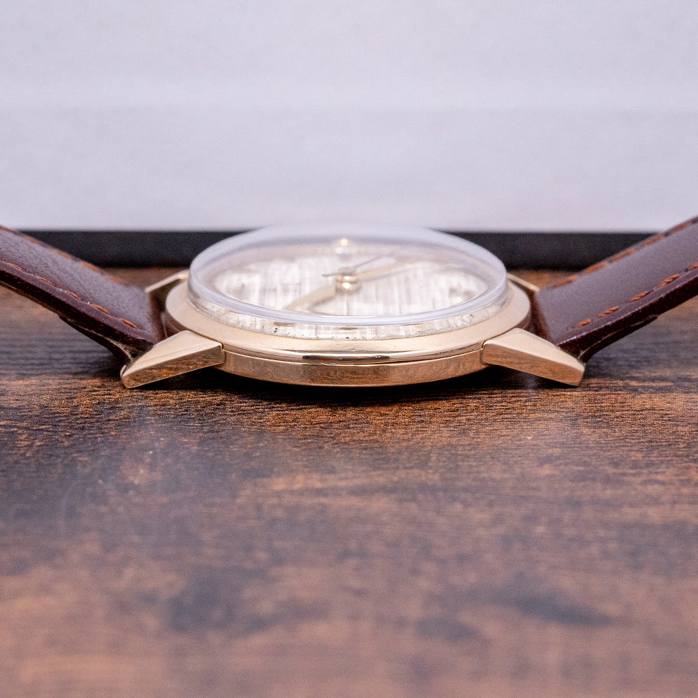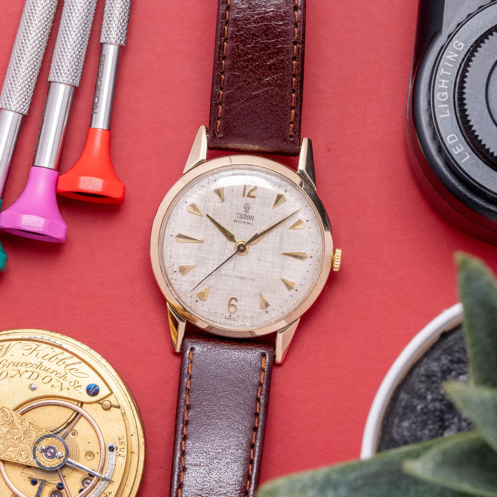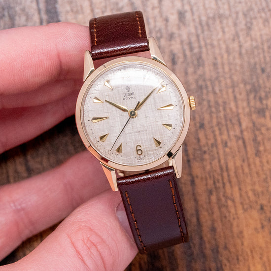 Here, we have a rare 1962 Tudor Royal 9ct Gold Linen Dial Mechanical, with a curvaceous 32mm round 9ct yellow gold Oyster case with tapered lugs, and a lug-to-lug length of 40mm and a thickness of 9mm ensures a comfortable fit on your wrist. On the right side, a signed crown. The slim polished bezel holds a domed crystal above a stunning and rare linen dial. An outer minute track with gilt facet dart hour markers and gilt applied Arabic numerals at 12 and 6 shine as you move your wrist. Gilt lance hands are complemented by a fine tapered sweeping centre seconds hand. Text on the dial is precisely printed; at 12 o’clock, we have the Tudor Rose motif “Royal” underneath and at 6 o’clock “Shock-resisting”. On the reverse, a screw-down case back. Inside a manually wound Tudor, 17 jewels movement. It comes paired with a well-suited 16mm leather strap.