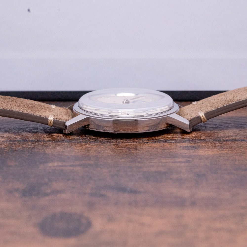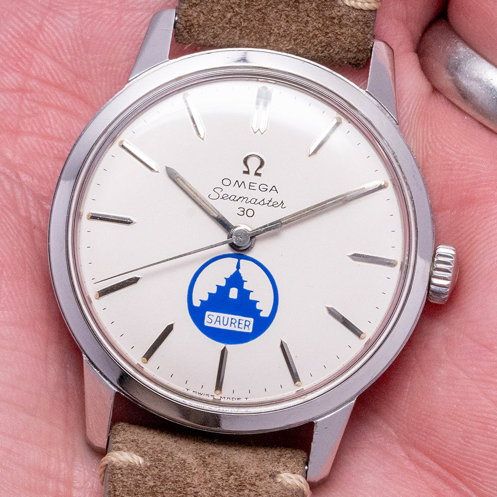 If this Omega Seamaster 30 didn't have the "Saurer" logo on the dial it would still be one of the nicest examples I have had in stock, the addition of that logo only adds to how special this reference 135.007 from 1963 is! Saurer was a company based in Switzerland that manufactured all sorts from embroidery machines to trucks. It is safe to assume this was commissioned by them for their staff, likely reserved for the big bosses or best performers. I would not hesitate to add this gem to your collection, finding another will be tough, especially in this condition and at this price.