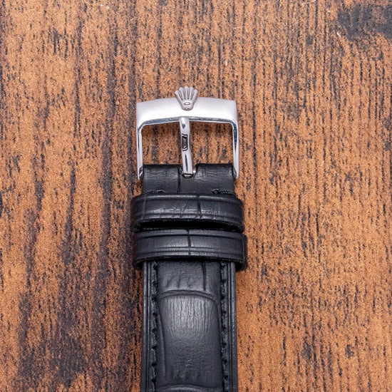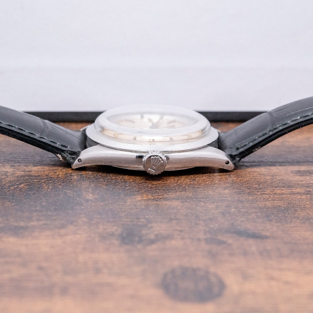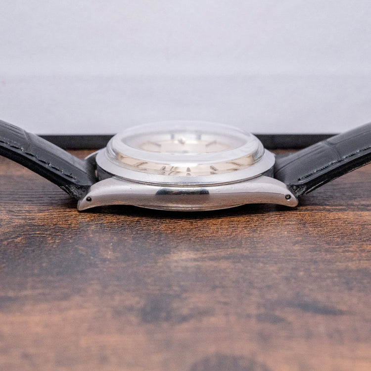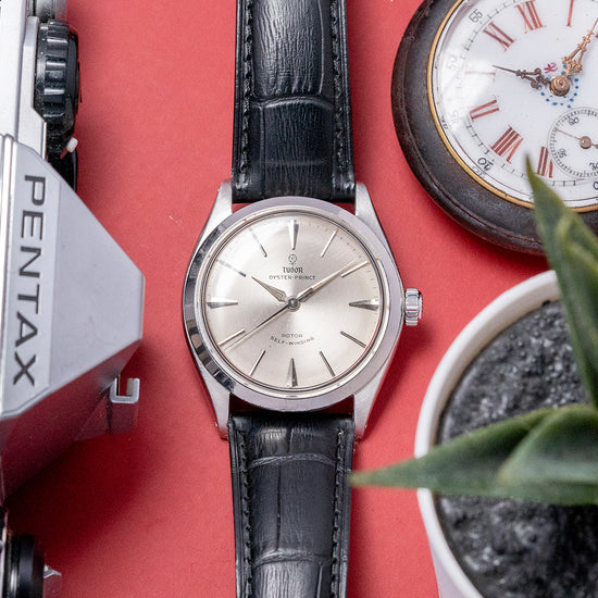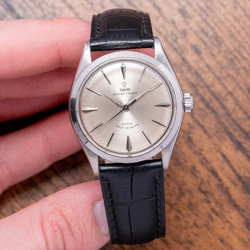 Here is a classic 1963 Tudor Oyster-Prince 34mm Automatic Silver Dial 7965. In 1947, Tudor introduced the Oyster, their first waterproof watch, building on the success of the Rolex Oyster of the same period. In 1952, 26 Tudor Oyster Prince watches were included in the British scientific expedition to Greenland organised by the Royal Navy and sponsored by the Queen. This showed the world how robust Tudor Oyster watches were. The 34mm round stainless steel Rolex Oyster case with tapered drilled lugs. The subtle curve of the flanks leads to a lug-to-lug length of 40mm and a thickness of 11.5mm, ensuring a comfortable fit on your wrist. On the right side, a signed screwed-down Rolex crown. The slim polished bezel holds a flat crystal above a stunning silver engine-turned dial. An outer minute track with facet dart hour markers and slim baton indexes mark the hours. Elegant lance hands are complemented by a fine tapered sweeping centre seconds hand. At 12 o’clock, we have the Tudor Rose motif, “Oyster Prince”, and at 6 o’clock “, Rotor and a smiley Self-Winding”, indicating an ETA movement inside. On the reverse, a screw-down case back, inside an automatic ETA Cal. 2484, 25 jewels beating at a leisurely 18,000 beats per hour. It comes paired with a 19mm Rolex strap and Rolex pin buckle.