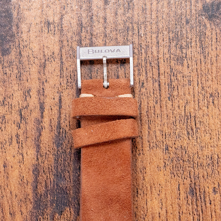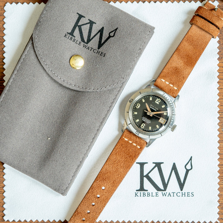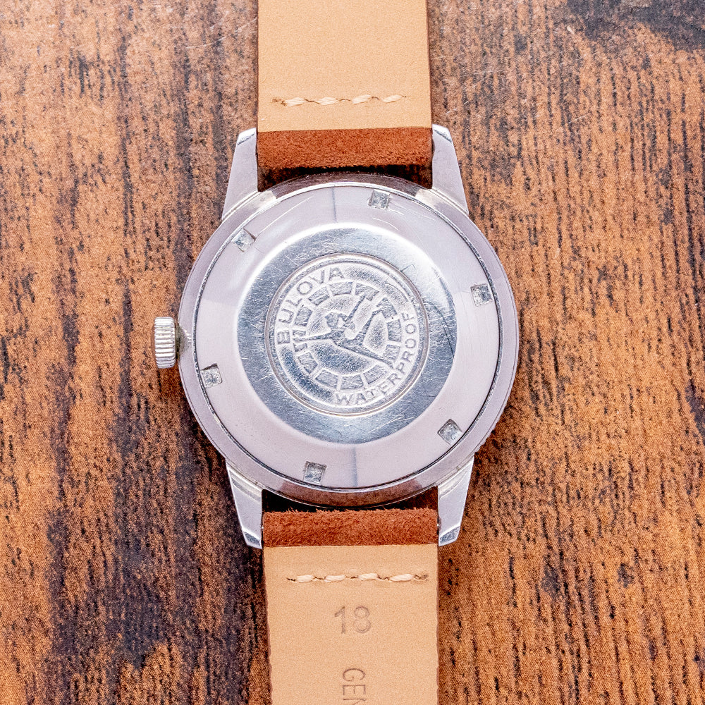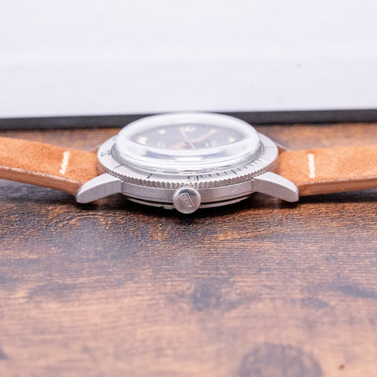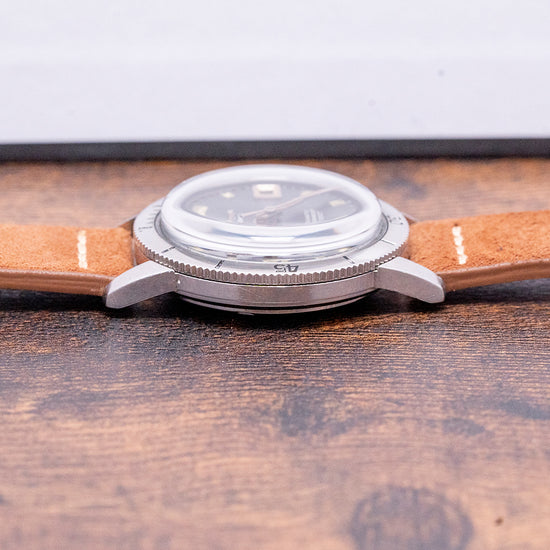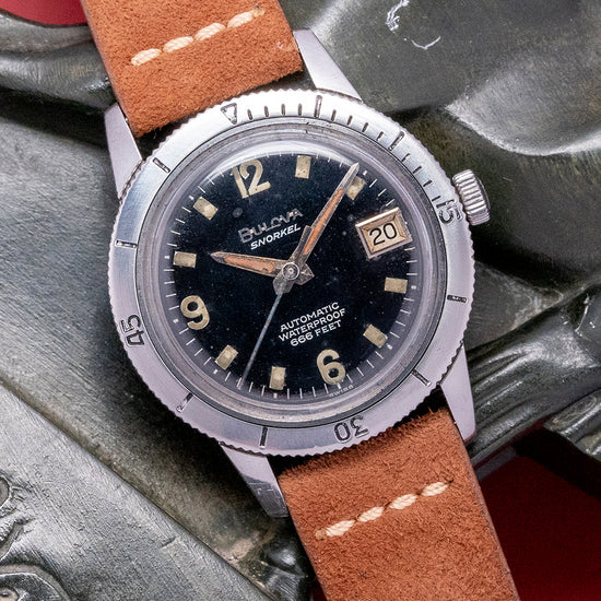 Here we have a 1964 Bulova Snorkel 666 "Devil Diver" Automatic 35mm 386-1. Launched in 1961, recreational Scuba diving was in its infancy, and this watch exceeded the previous dive record of 133m or 436 feet with 203m or 666 feet, hence the “number of the beast” Devil Diver name. It has a 35mm round stainless steel case with tapered lugs, a lug-to-lug length of 43mm, and a case thickness of 12.5mm that curves over your wrist for a comfortable fit. On the right side is a signed coin edge crown, a bidirectional stainless steel bezel that has a coin edge for grip and a deeply engraved 60-minute dive bezel with markings and numerals painted in black. A domed acrylic crystal sits above a black dial. An outer minute track surrounds an Explorer-style dial configuration 12, 6 and 9 and indexes coated in lume marking the hours, at 3 o’clock, a framed date window. Sword hands are filled with lume and complemented by a tapered second hand; at 12 o’clock, we have an applied Bulova motif “Snorkel” printed underneath, and at 6 o’clock “, Automatic Waterproof 666 Feet” completes this distinctive vintage dive watch. On the reverse, a screw-down case back with “Bulova Waterproof” and the dancing lady symbolising the Bulova Goddess of Time seen on their watches since the 1920s, inside an automatic Bulover Cal.11 ALACD, 17 jewels, beating at a leisurely 18,000 beats per hour and comes paired with a well-suited 18mm aftermarket suede strap and its original Bulova pin buckle.