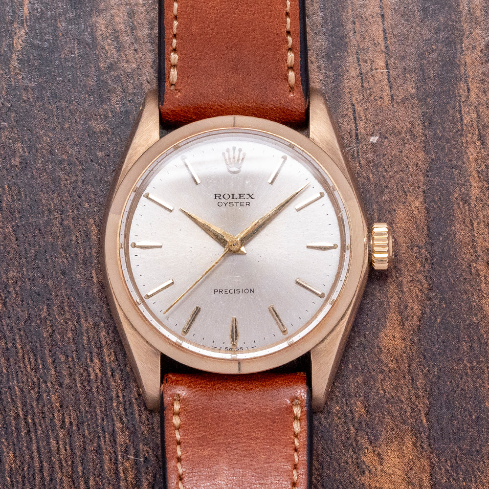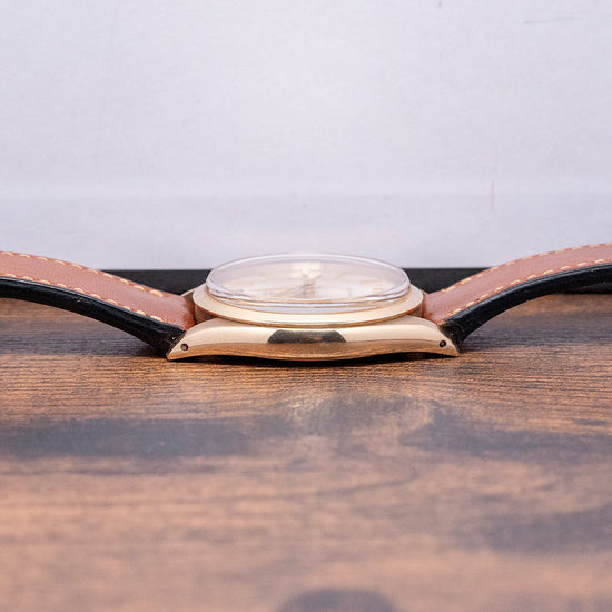 Here we have a rare 1964 Rolex Oyster Precision 6426 with a 34mm 9ct Gold Oyster case; the slender case has a subtle curve towards the satin-finished drilled lugs with a lug-to-lug length of 41.5mm and a thickness of 9.5mm, ensuring a comfortable fit on your wrist, the case profile has polished and brushed surfaces that transition with firm, crisp edges. On the right side, there is a signed screw-down crown. The polished chamfered smooth bezel holds a domed crystal above a sunburst silver dial, an outer minute track with Tritium lume pips and applied bevel-edged baton indexes mark the hours. Slender Dauphine hands filled with Tritium are complemented by a tapered centre second hand, text is precisely printed with “Rolex Oyster” underneath the applied Rolex crown. At 6 o’clock, you find “Precision”. On the reverse, a coin-edged screw-down case back, inside a manually wound Rolex Cal. 1215, 17 jewels, beating at a leisurely 18,000 beats per hour. It comes paired with a well-suited 19mm leather strap and gold-plated Rolex pin buckle.