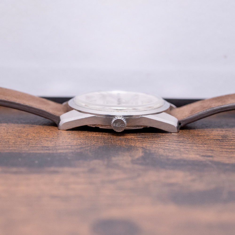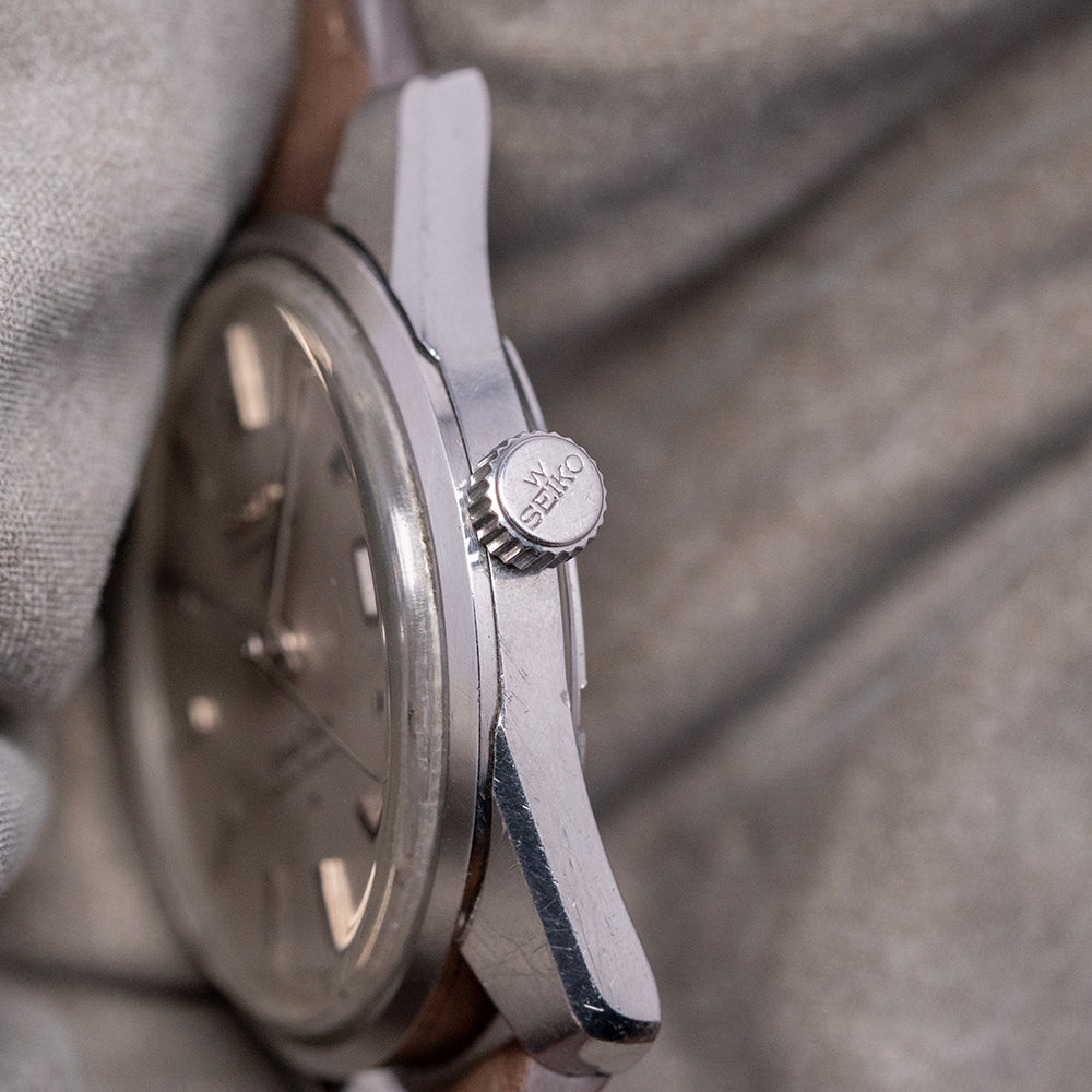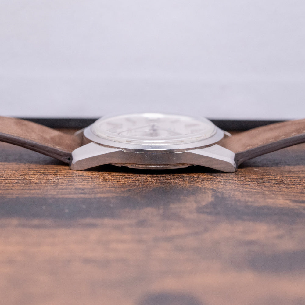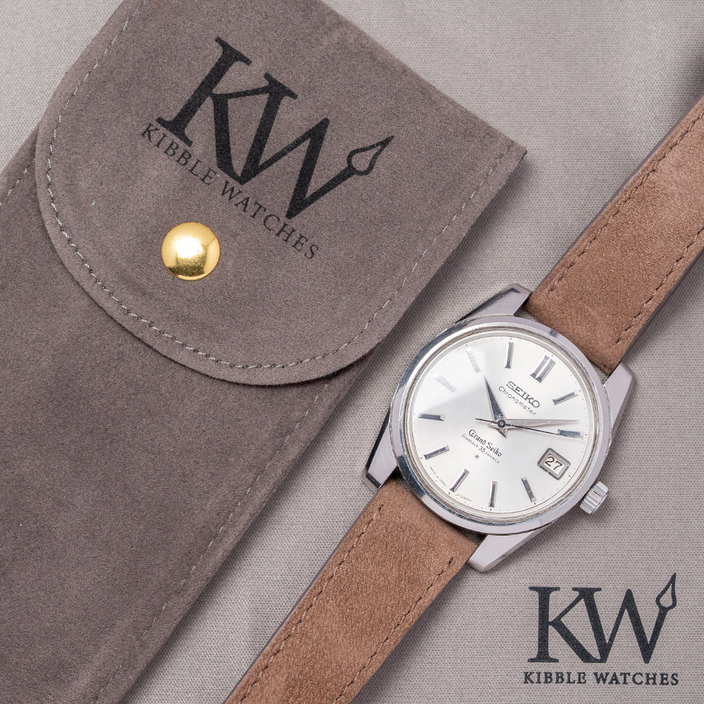 Here we have a classic 1965 Grand Seiko 57GS 'Chronometer' Manual model 5722-9990. Featuring a polished 36.5mm stainless steel round case, which sits comfortably on your wrist, thanks to the thick tapered flat-ended lugs. Its curved flanks lead to a lug-to-lug length of 43mm and a case thickness of 9.5mm. This sporty case adopts the principles of the "Grammar of Design." On the right side, there is the signed ‘Seiko W’ deep knurled crown. The smooth, recessed bezel holds a domed crystal above a striking sunburst silver ‘Special’ dial. An outer minute track surrounds the applied faceted rhodium-plated baton indices, marking the hours, with a framed date window at 3 o'clock. Elegant, rhodium-plated razor-edged hands are complemented by a tapered seconds hand. At noon, we have the applied ‘Seiko’ ‘Chronometer’ printed underneath and at 6 o’clock, a printed ‘Grand Seiko Diashock 35 Jewels’, and ‘Star’ completing this special, sophisticated timepiece. On the reverse, a screw-down solid case back is engraved with the details of the watch, surrounding the characteristic Grand Seiko gold medallion at its centre and inside a Suwa factory-made manually wound Seiko Cal. 5722A, 35 jewels, beating at a leisurely 18,000 beats per hour. It comes paired with a well-suited 19mm leather strap and pin buckle.