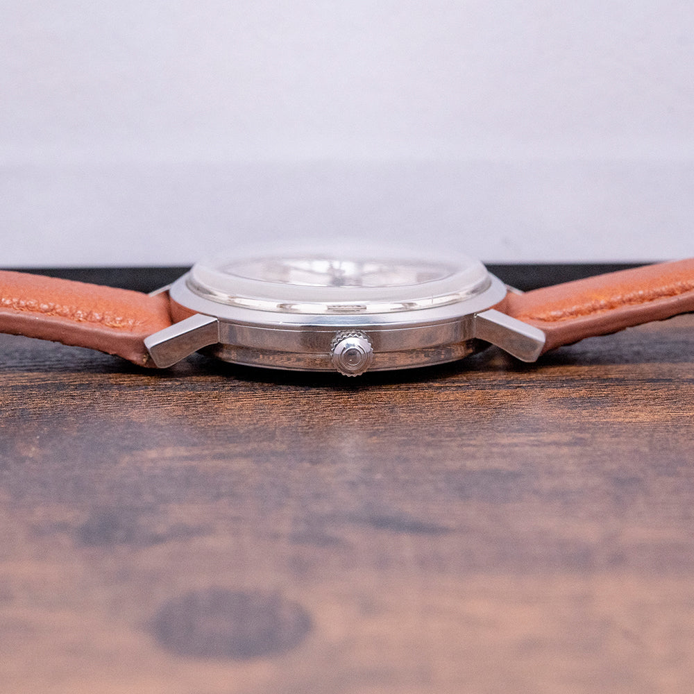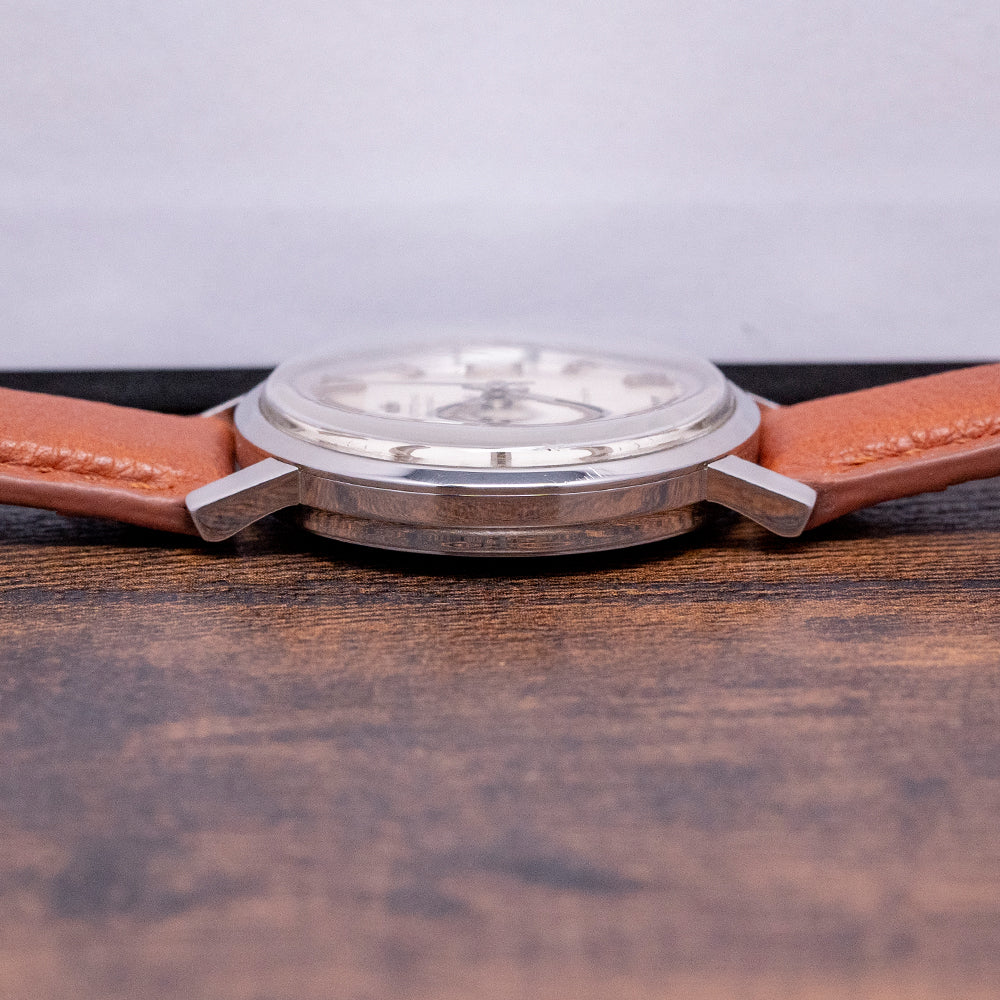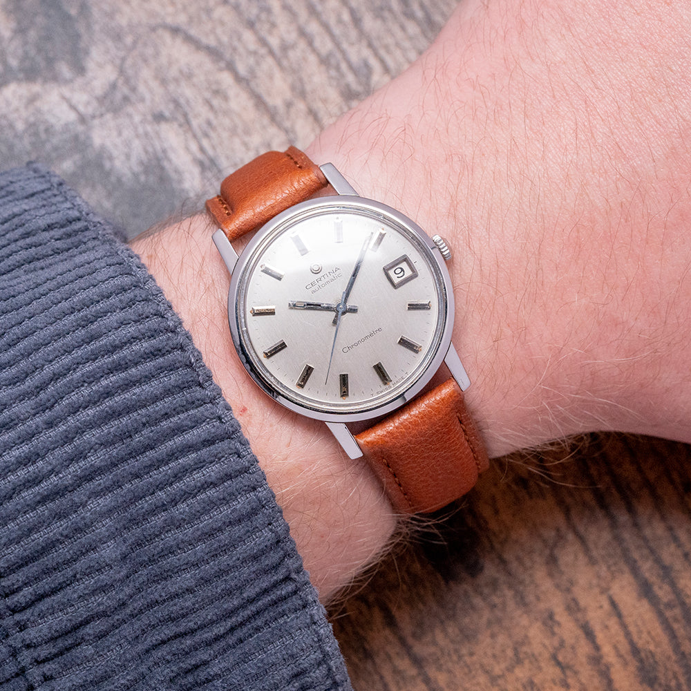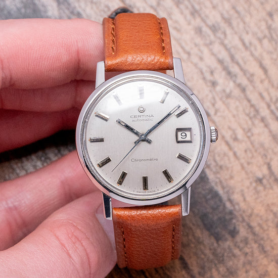 We have a clean 1966 Certina Automatic Chronometer 5801 200 with a 35mm brushed and polished stainless steel case. Slender lugs gently curve over your wrist, and a lug-to-lug length of 41.5mm and a thickness of 11mm ensure a comfortable fit. On the right side, a signed crown. A polished bezel holds a domed crystal over a brushed silver dial. An outer minute track surrounds applied steel baton indexes with chamfered edges to mark the hours and Tritium pip. At 3 o’clock, a framed date window. Slender baton hands are complemented by a fine tapered sweeping seconds hand. The dial and case are reminiscent of an Omega Constellation of the same period, which on the market can be found for double the price of our Certina. At 12 o’clock, an applied Certina motif with “Automatic” printed in black underneath. At 6 o’clock, “Chronometre” is printed, elevating this watch above its contemporaries. On the reverse, a screw-down case back with “Chronometre” embossed around the centre, inside an automatic "Chronometer", Certina Cal. 25-651, 27 jewels, 19,800 beats per hour. This movement was in production between 1960 and 1968 and was used in many of their models over that period due to its slimness and robustness. It comes paired with a well-suited 18mm leather strap and pin buckle and comes with a Certina presentation box.