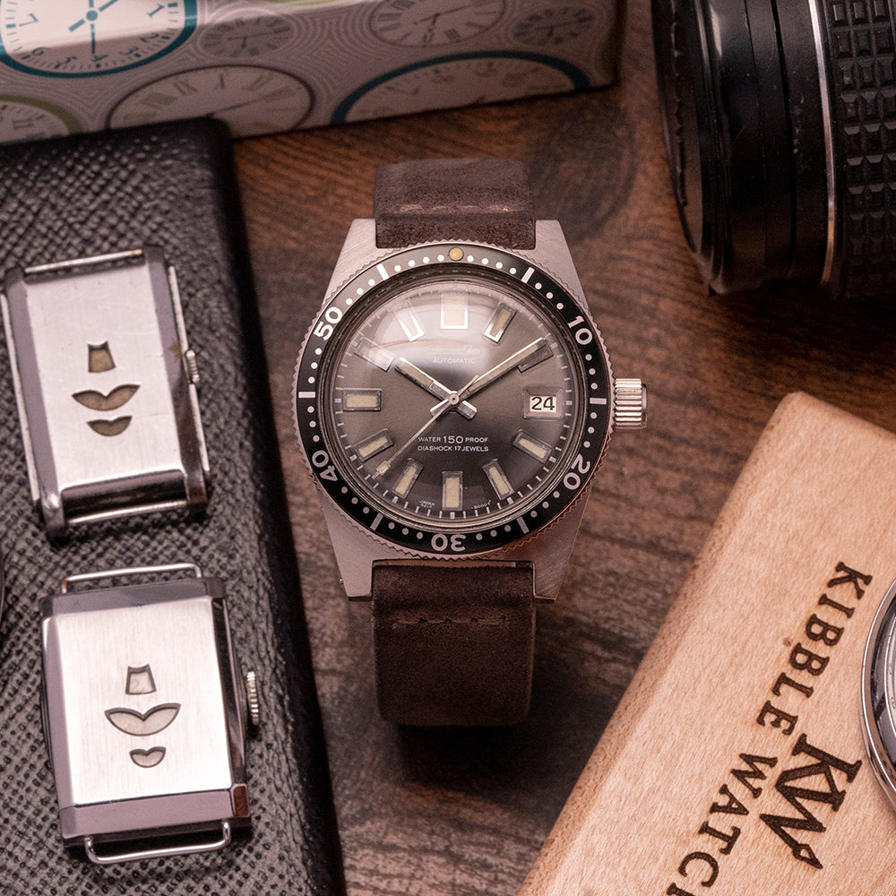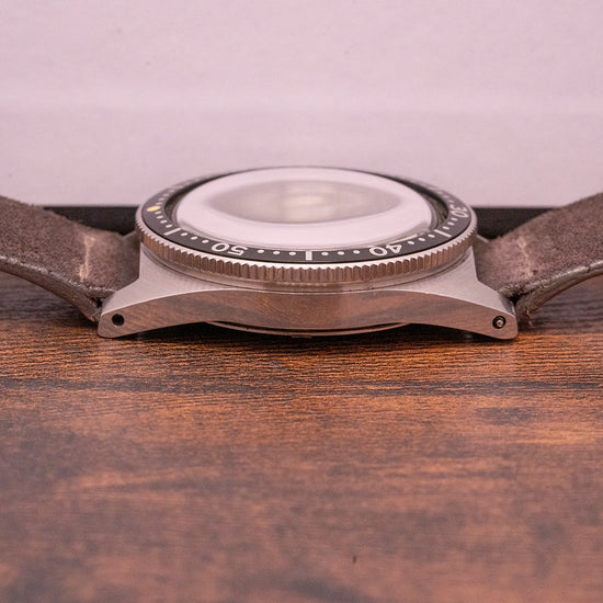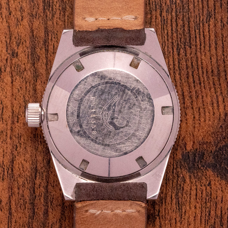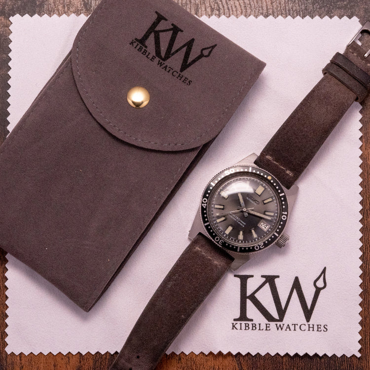We have here a 1966 Seiko Divers "62MAS" Big Crown 6217-8001, probably one of the best examples you’ll have seen in a while, the letters MAS come from Seikomatic Selfdater, the Cal. 62 was fitted to the Seikomatic 8000 range, first released in 1965. Seiko saw an opportunity to capture the recreational and professional dive market, such as saturation divers and welders, at 150m water resistance it was a true tool watch of its day, therefore finding examples in such fantastic condition is rare. Its 38mm stainless steel case, large for its time, has a curved profile making it very comfortable on the wrist, and a lug-to-lug length of 46mm and a case thickness of 13mm give the watch an impressive wrist presence. The edges of this example are razor-sharp and untouched, on the right side is a large original signed “Big” crown. The ridged bezel has a black insert with 60-minute markings and a lume pip at 12 o’clock. A heavily domed acrylic crystal is fitted above the black dial, which has turned a shade of grey in certain lights. Large applied baton markers with lume-infilled centres sit majestically above the dial, marking the hours. A date window is recessed at 3 o’clock. Broad baton hands with lume complemented with a centre seconds hand with a lume tip. At 12 o’clock we have the applied Seiko motif "Automatic" underneath and at 6 o’clock "Water 150 Proof Diashock 17 Jewels" completes this incredible vintage dive tool watch. On the reverse, is a screw-down case back with the Seiko Dolphin in the centre, inside we have the automatic Seiko 6217, 17 jewels beating at a leisurely 18,000 beats per hour with a quick set date. The watch comes fitted on a 19mm vintage-style leather strap with a pin buckle.