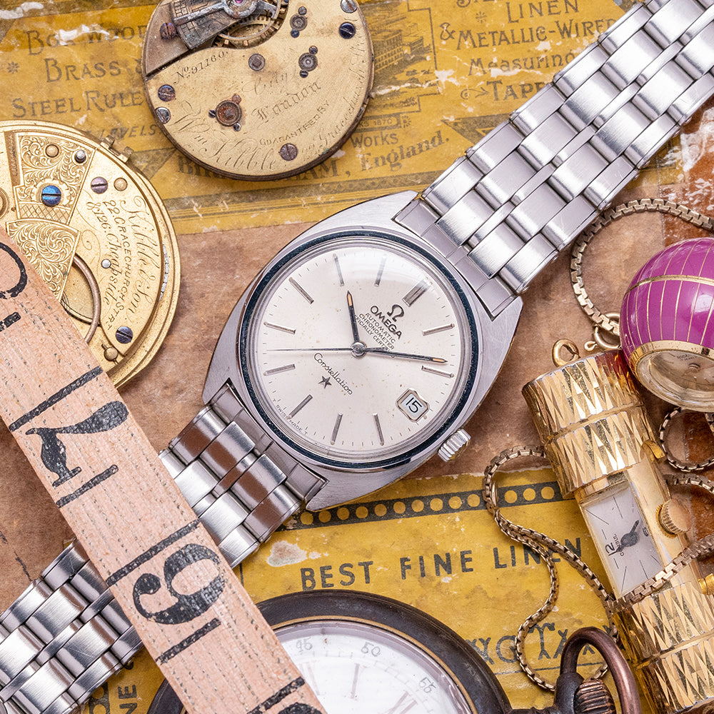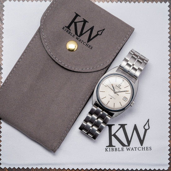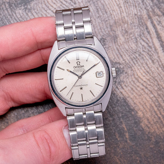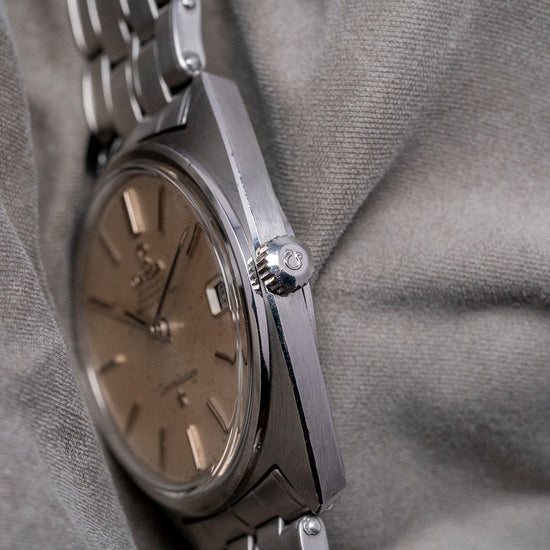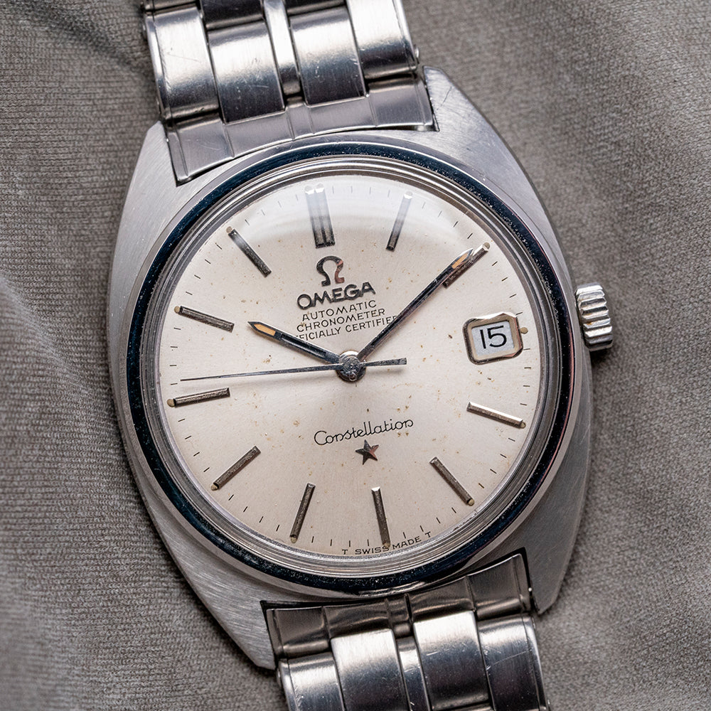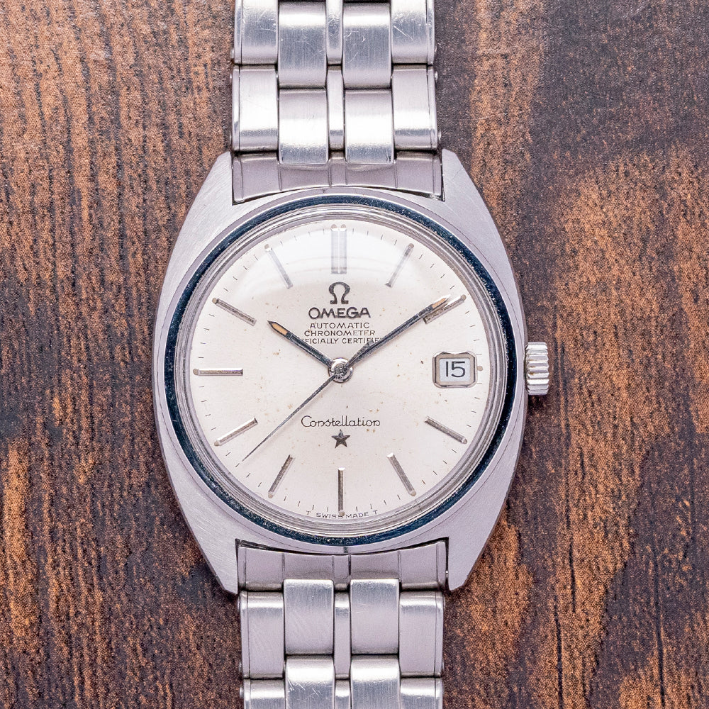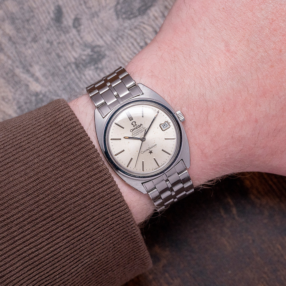 Here we have a classic 1967 Omega Constellation Auto 35mm Sprung Bracelet 168.017 with a satin-brushed and polished 34.5mm stainless steel C-shaped case comfortably sitting on your wrist like a cushion. Omega first introduced the Constellation in 1952, at the time, it was Omega's flagship timepiece; the first models had a Cal. 354 bumper movement in them. Later, in 1955, Omega introduced the Automatic Cal. 50x, followed in 1959 by the Cal.55x (no date) and 56x (date) versions. Many of the Constellations came with pie-pan dials, diamond indexes, and fancy lug configurations, and all the gold Constellations of that time had the Observatory of Geneva's hand engraved on the back. The stainless steel and stainless steel/gold versions had a gold medallion on the back with the Observatory of Geneva; the eight stars above the Observatory stand for the many exploits of Omega in the world Chronometer competition, celebrating the fact that all Constellations are Chronometer Certified. In 1964, Omega introduced its first Constellation with the “C” case; due to the case resembling two mirrored Cs, the “C” case was a modern move away from the popular round Constellations of the 1950s. The curvaceous flanks have a polished bevel edge leading to a lug-to-lug length of 40mm and a case thickness of 10mm, ensuring a comfortable fit on your wrist. An attractive, slim, smooth bezel holds the domed crystal above a silver dial with an outer minute track surrounding applied chamfered edge baton indexes that play with the light as you rotate your wrist. At 3 o’clock, a framed date window. Slender Dauphine hands are complemented with a tapered centre second hand. At 12 o’clock, an applied Omega and “Automatic Chronometer Officially Certified” printed in black. Below at 6 o'clock, “Constellation” and an applied star complete this sophisticated dress watch. On the reverse, there is a screw-down case back with an embossed observatory and eight stars, inside an automatic Omega Cal. 564, 24 jewels, 19,800 beats per hour. It comes paired with its rare 19mm Omega brushed stainless steel sprung bracelet secured by a signed folding clasp.