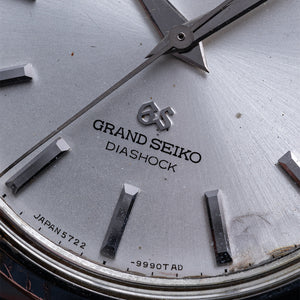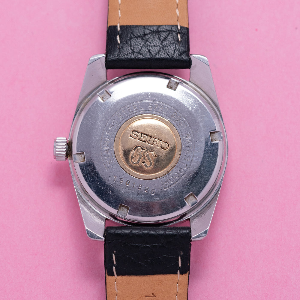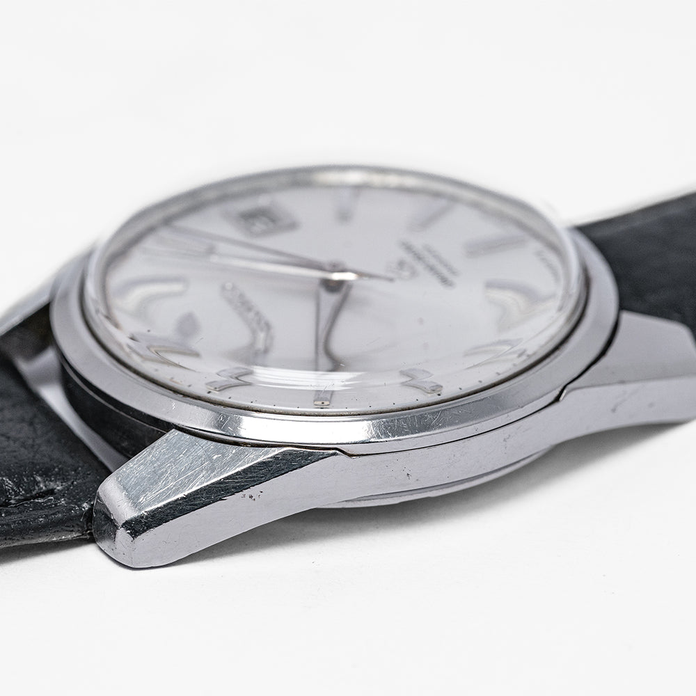 Here we have a 1967 Grand Seiko Oversized Ref. 5722-9991 with a 36.5mm stainless steel case, the case gently curves over your wrist with a lug-to-lug length of 43mm and a thickness of 11mm for a comfortable fit. Chamfered edges with crisp lines are still evident along the lug edges, and on the right side is a signed crown. The bezel is slightly recessed into the case with the crystal sitting proud of the dia, the sunburst silver dial has applied facet-edged batons marking the hours that catch the light as you rotate your wrist, and at 3 o’clock a framed date window. Elegant dauphine hands with polished edges are complemented by a long centre second hand, at 12 o’clock an applied “Seiko”, and at 6 o’clock an applied “GS” with Grand Seiko Diashock printed in black text. On the reverse, a screw-down case back with the Grand Seiko gold medallion embossed in the centre, inside a manually wound Seiko Cal. 5722, 35 jewels. The watch comes with a 19mm leather strap.