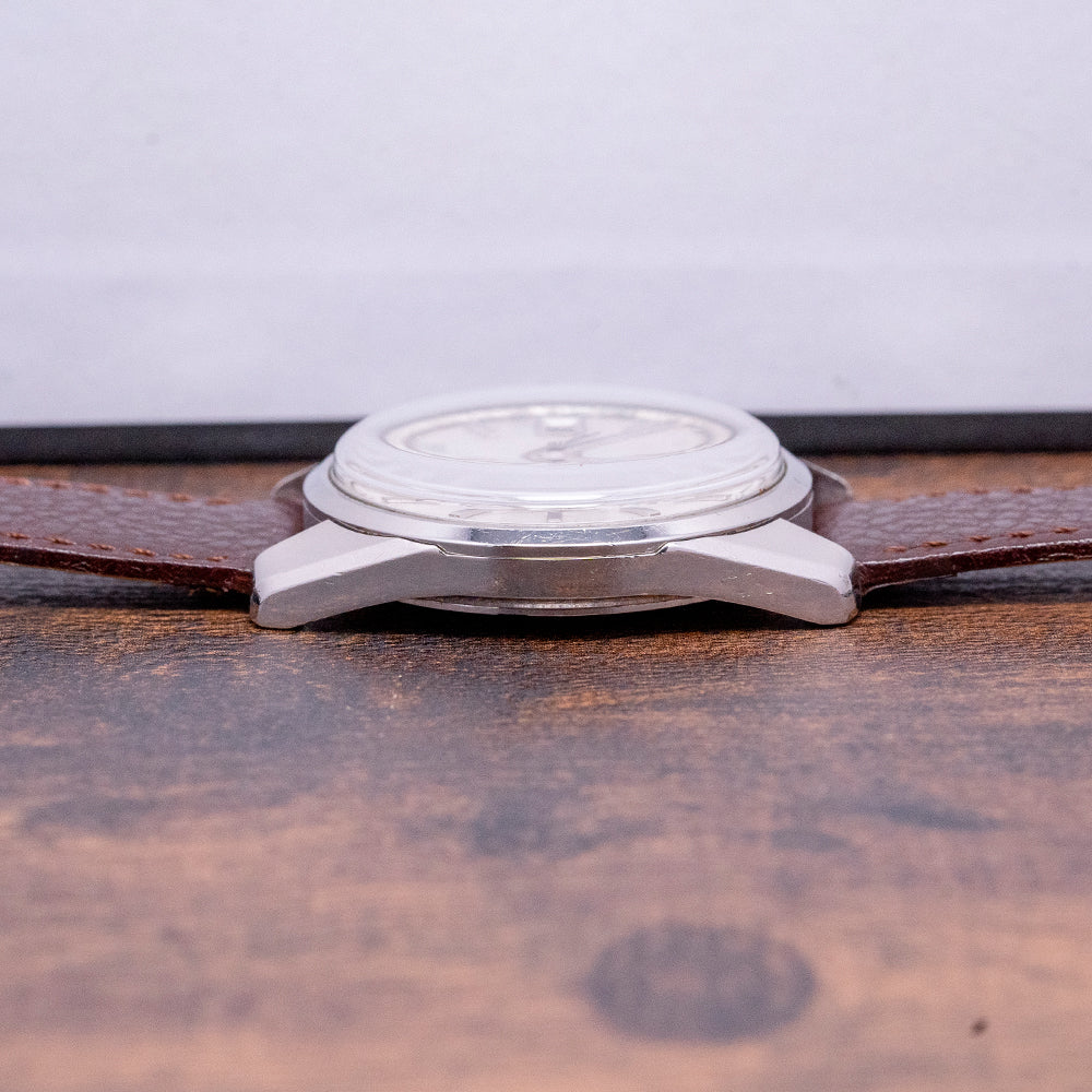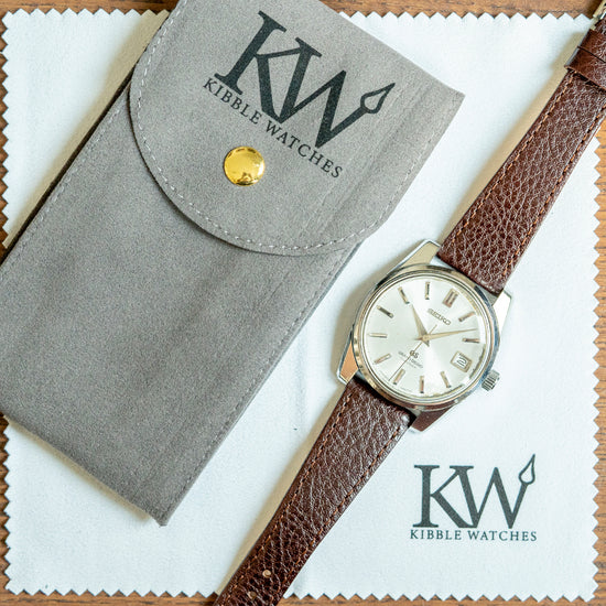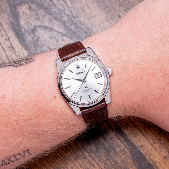 Here we have a classic 1967 Grand Seiko Oversized Ref. 5722-9991 with a 36.5mm stainless steel case. The large case for the time gently curves over your wrist with a lug-to-lug length of 43mm and a thickness of 11mm for a comfortable fit. Chamfered edges with crisp lines are still evident along the lug edges. On the right side is a signed crown. The bezel is slightly recessed into the case with the crystal sitting proud of the dial. The sunburst silver dial has applied facet-edged batons marking the hours that catch the light as you rotate your wrist. At 3 o’clock, a framed date window. Elegant dauphine hands with polished edges are complemented by a long centre second hand. At noon we have an applied “Seiko”; at 6 o’clock, an applied “GS” with Grand Seiko Diashock printed in black text. On the reverse, a screw-down case back with the Grand Seiko gold medallion embossed in the centre. Inside a Manually Wound Seiko Cal. 5722, 35 jewels. The watch comes with a well-suited aftermarket 19mm leather strap.